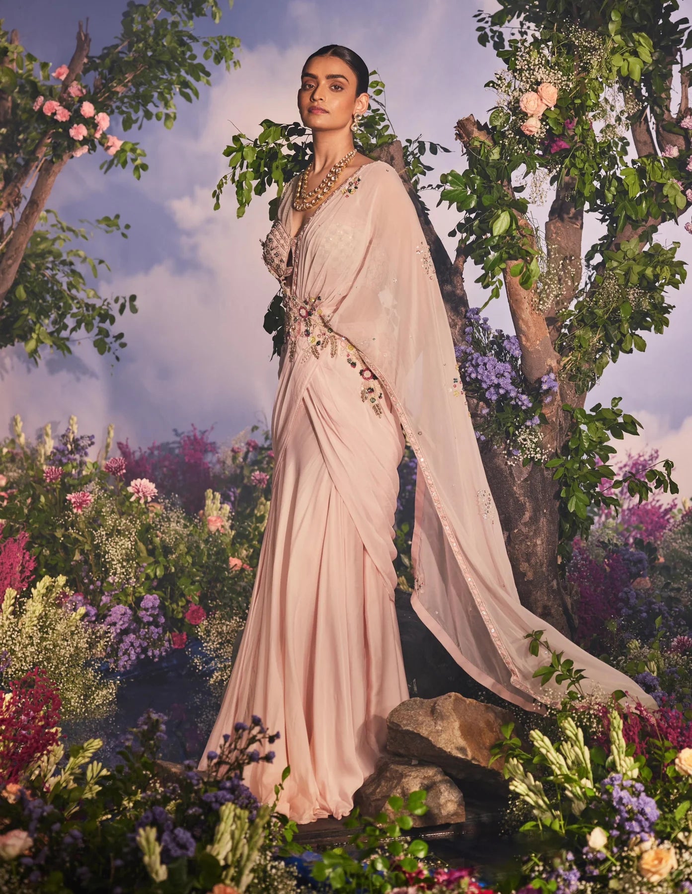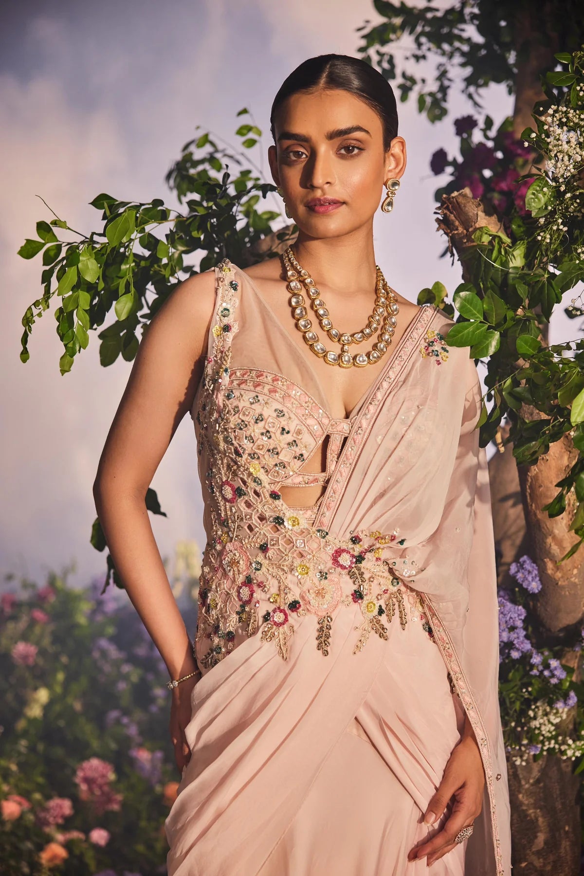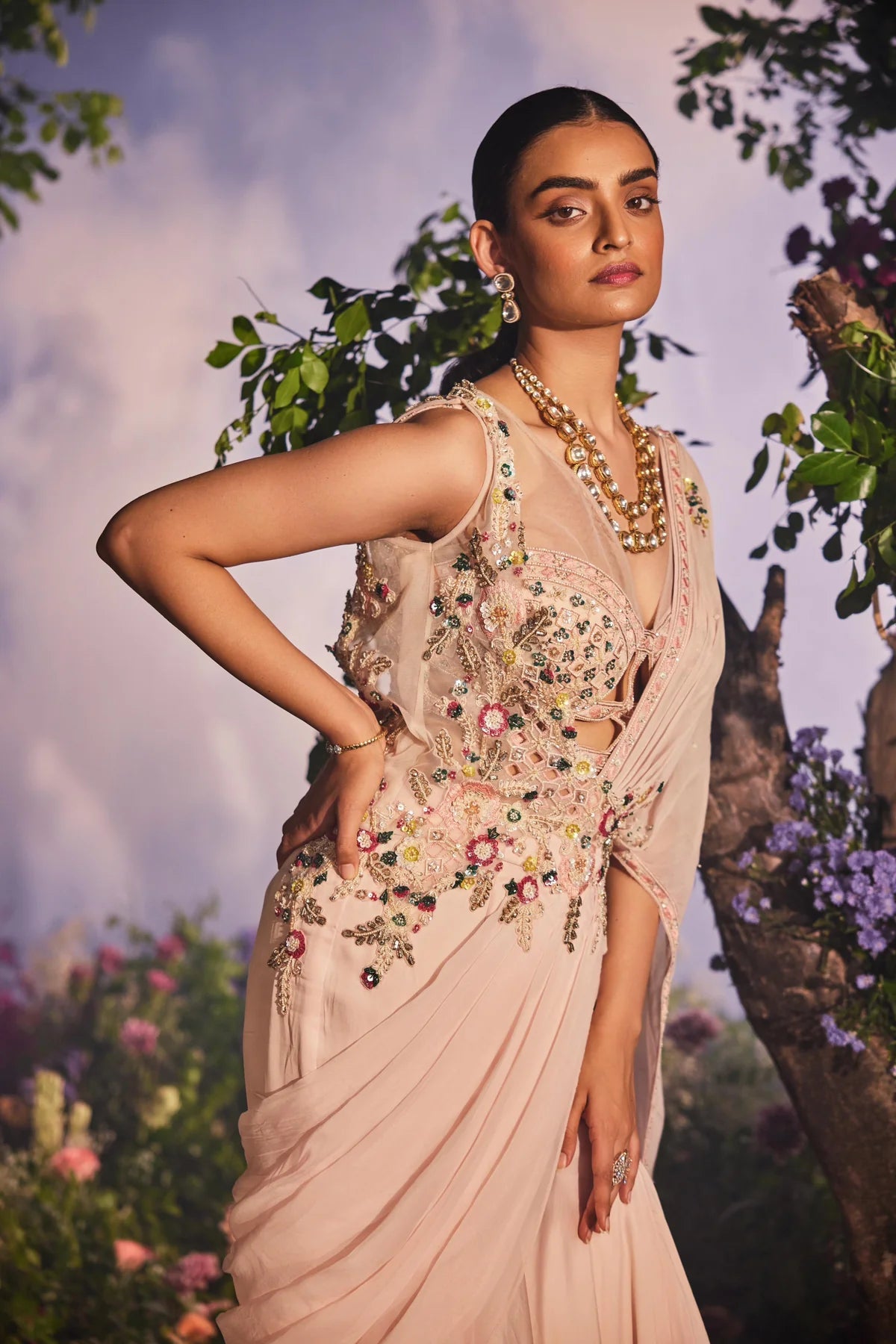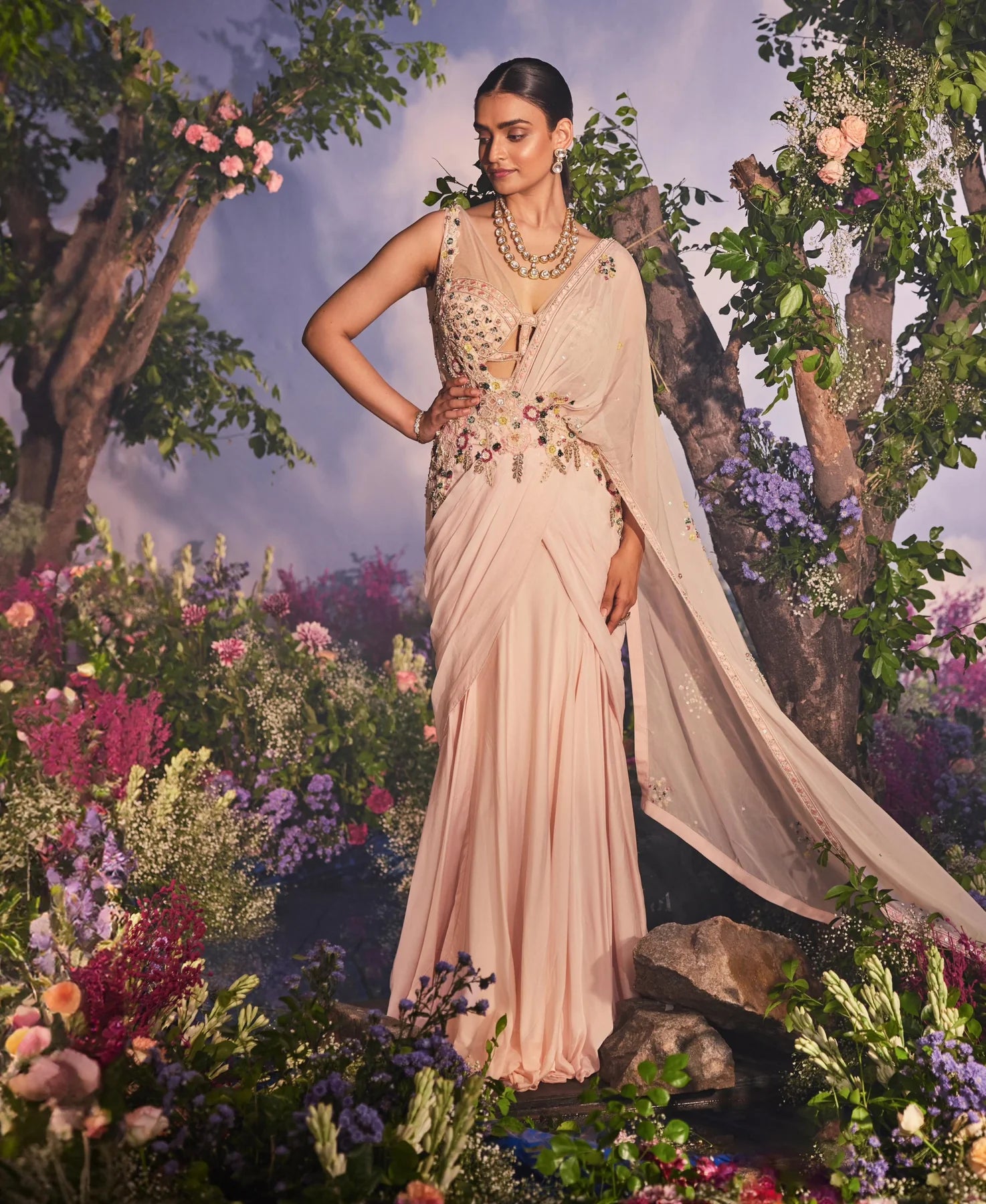 The saree features a draped design paired with a corset blouse, showcasing multicolored thread work accentuated with sequins and cutdana embroidery. The pallu, seamlessly attached to the saree, flows gracefully with style and enhancing the overall elegance of the ensemble.