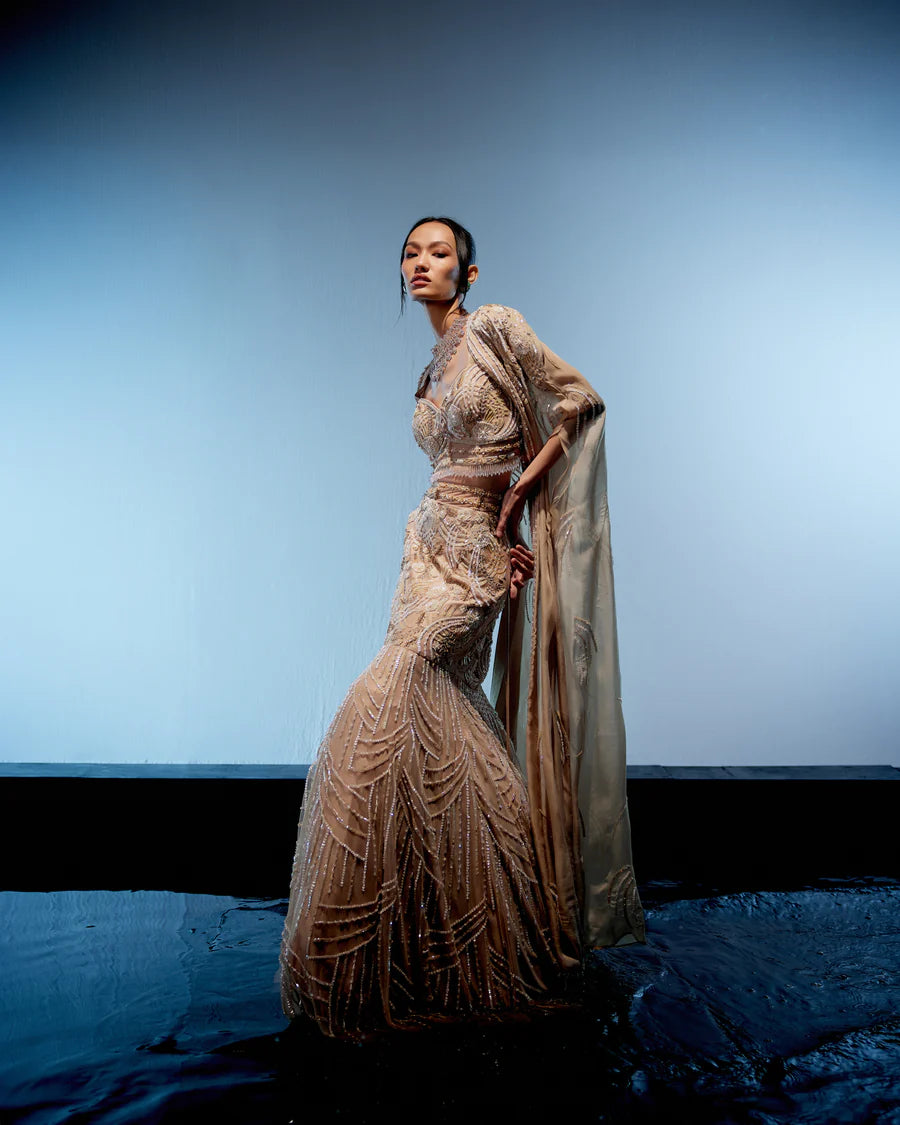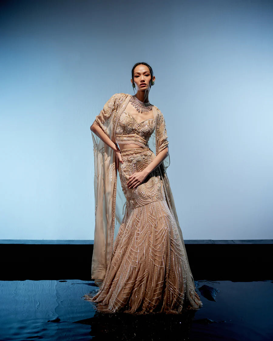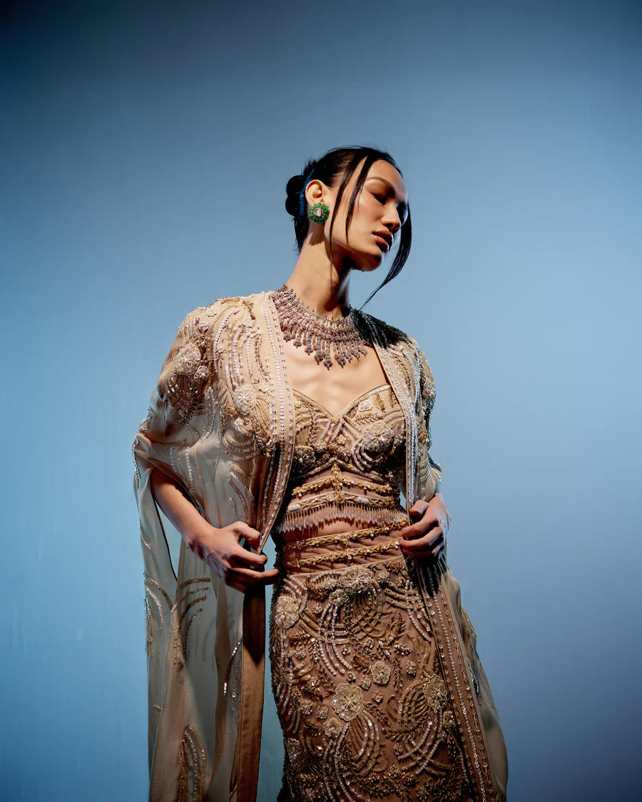 Stunning ivory fish cut lehenga complemented by a corset blouse intricately embellished with garnet embroidery. The corset is accentuated with glass tassels along the waistline, adding a touch of glamour. A long embroidered cape elegantly completes the ensemble, enhancing its overall allure.