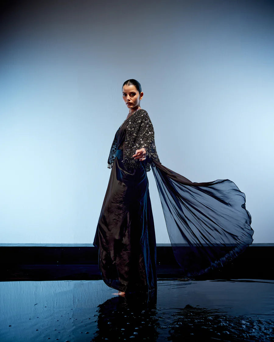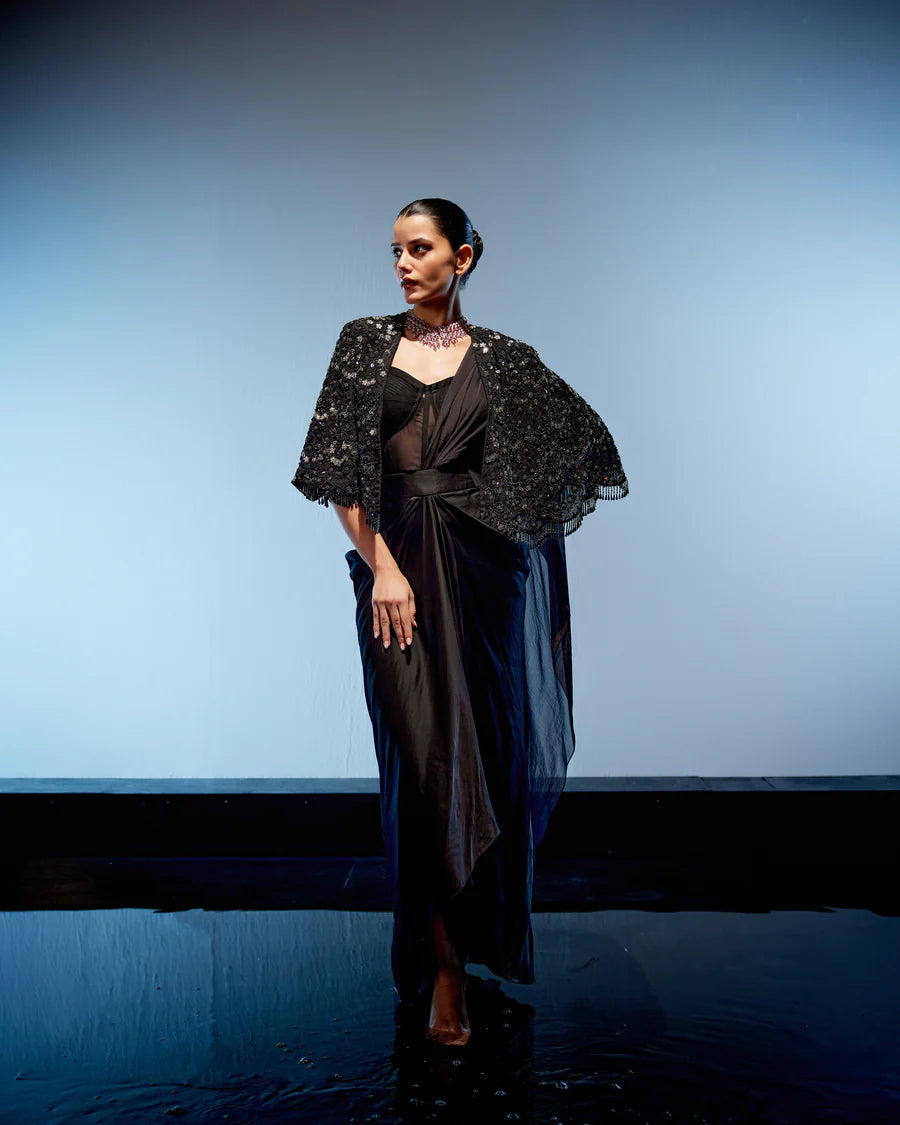 Introducing the sophisticated Black Detachable Drape Saree ensemble, exuding elegance and flair. Paired with a stunning corset and a cape adorned with garnet tassels, mirror, and cutdana work, it embodies the essence of cocktail style. The detachable drape saree adds versatility to the outfit, allowing for effortless transitions between looks.