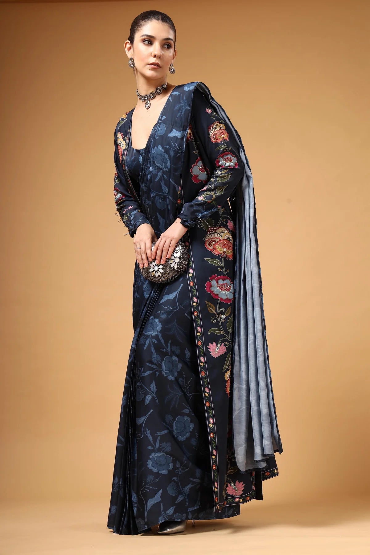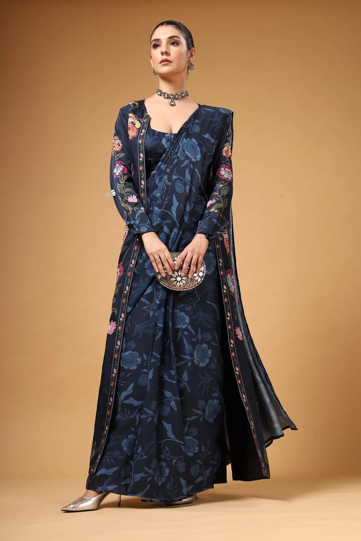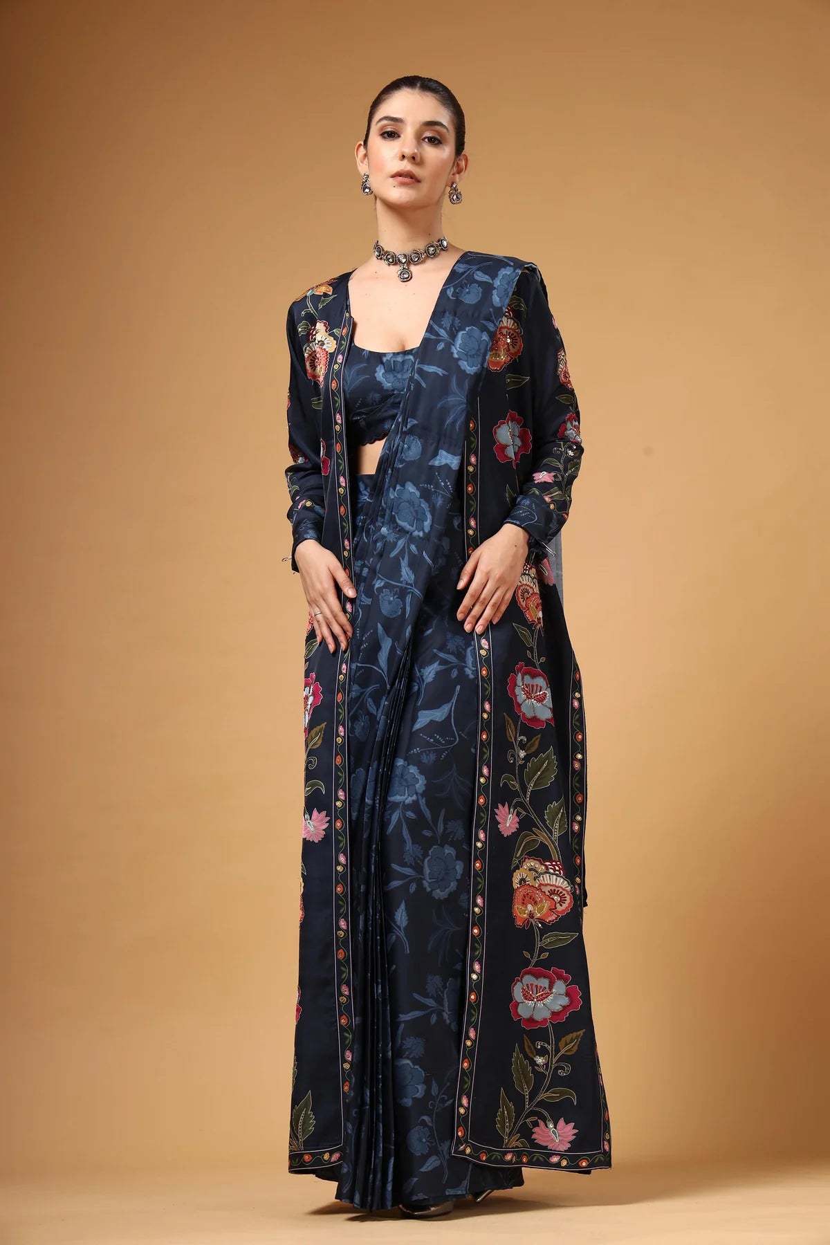 A contemporary pre-draped saree styled with a sleek cut-sleeve blouse and a long jacket adorned with vibrant multicolour floral prints. The flowing silhouette and bold patterns create a striking visual contrast, while the pre-drape ensures all-day comfort. Effortlessly blending trend and tradition, this ensemble delivers a bold yet beautiful statement for the modern woman.