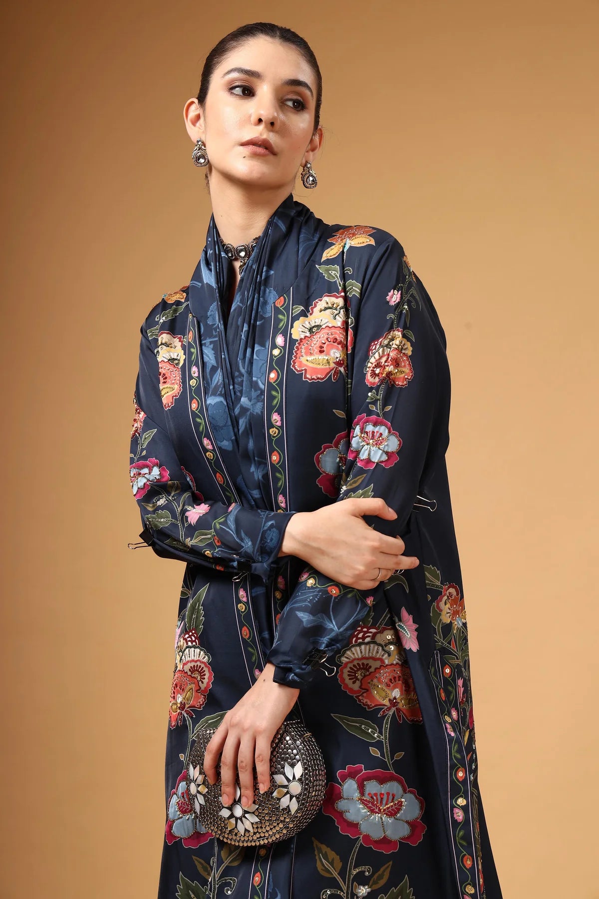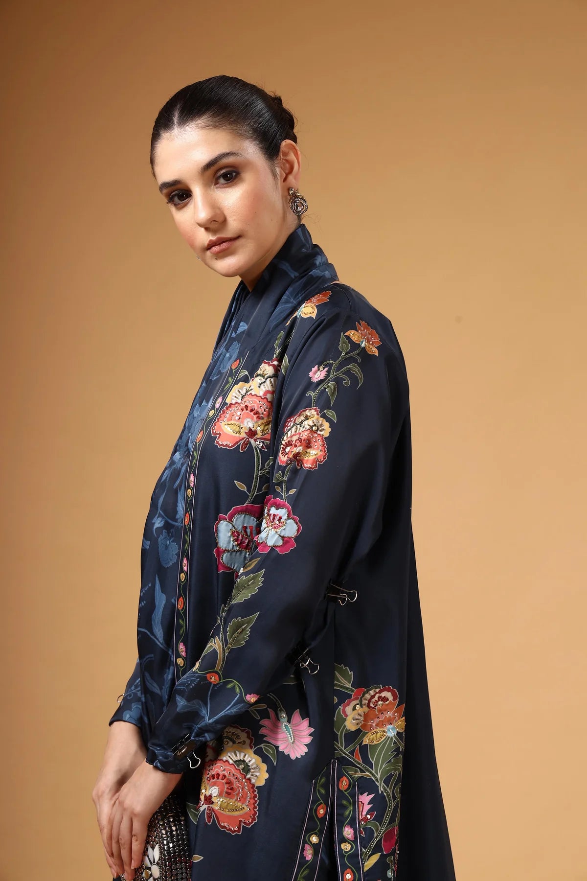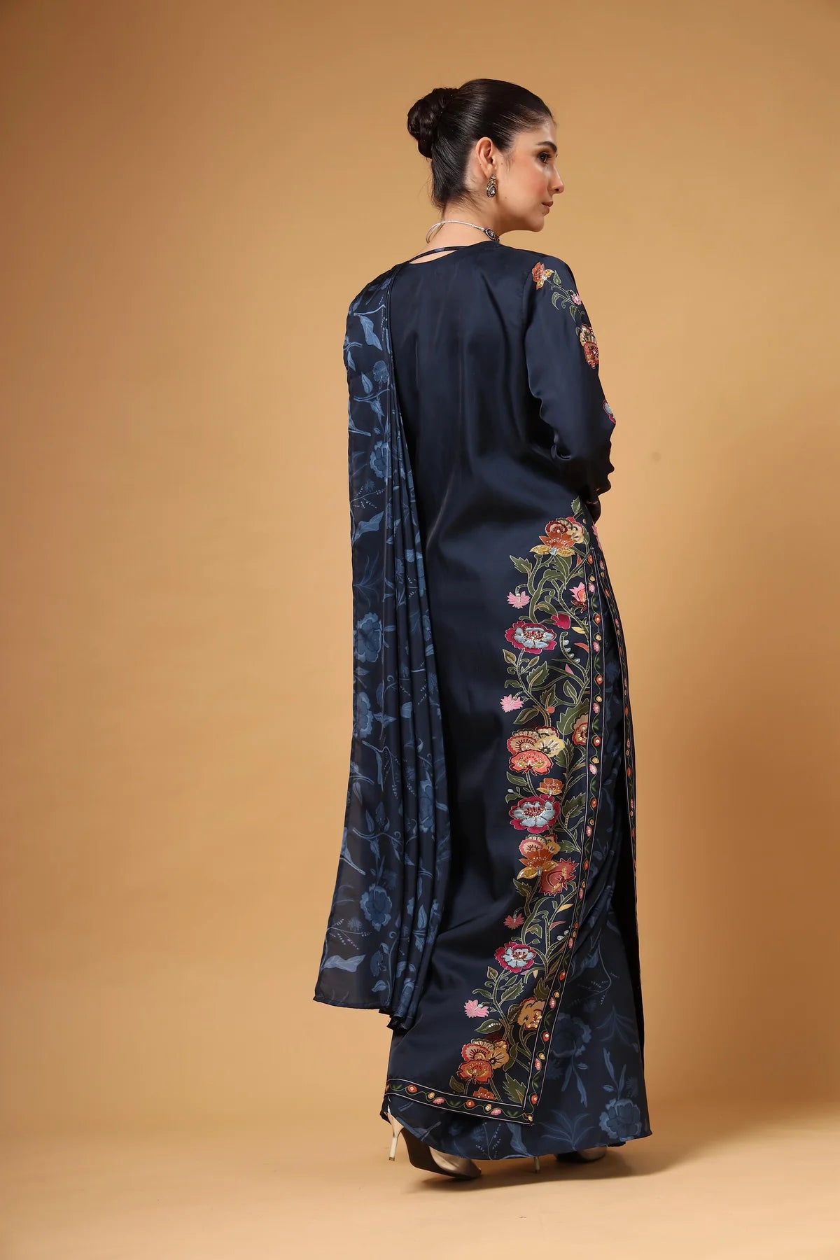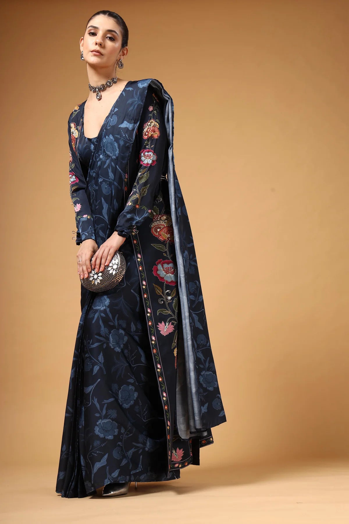 A contemporary pre-draped saree styled with a sleek cut-sleeve blouse and a long jacket adorned with vibrant multicolour floral prints. The flowing silhouette and bold patterns create a striking visual contrast, while the pre-drape ensures all-day comfort. Effortlessly blending trend and tradition, this ensemble delivers a bold yet beautiful statement for the modern woman.