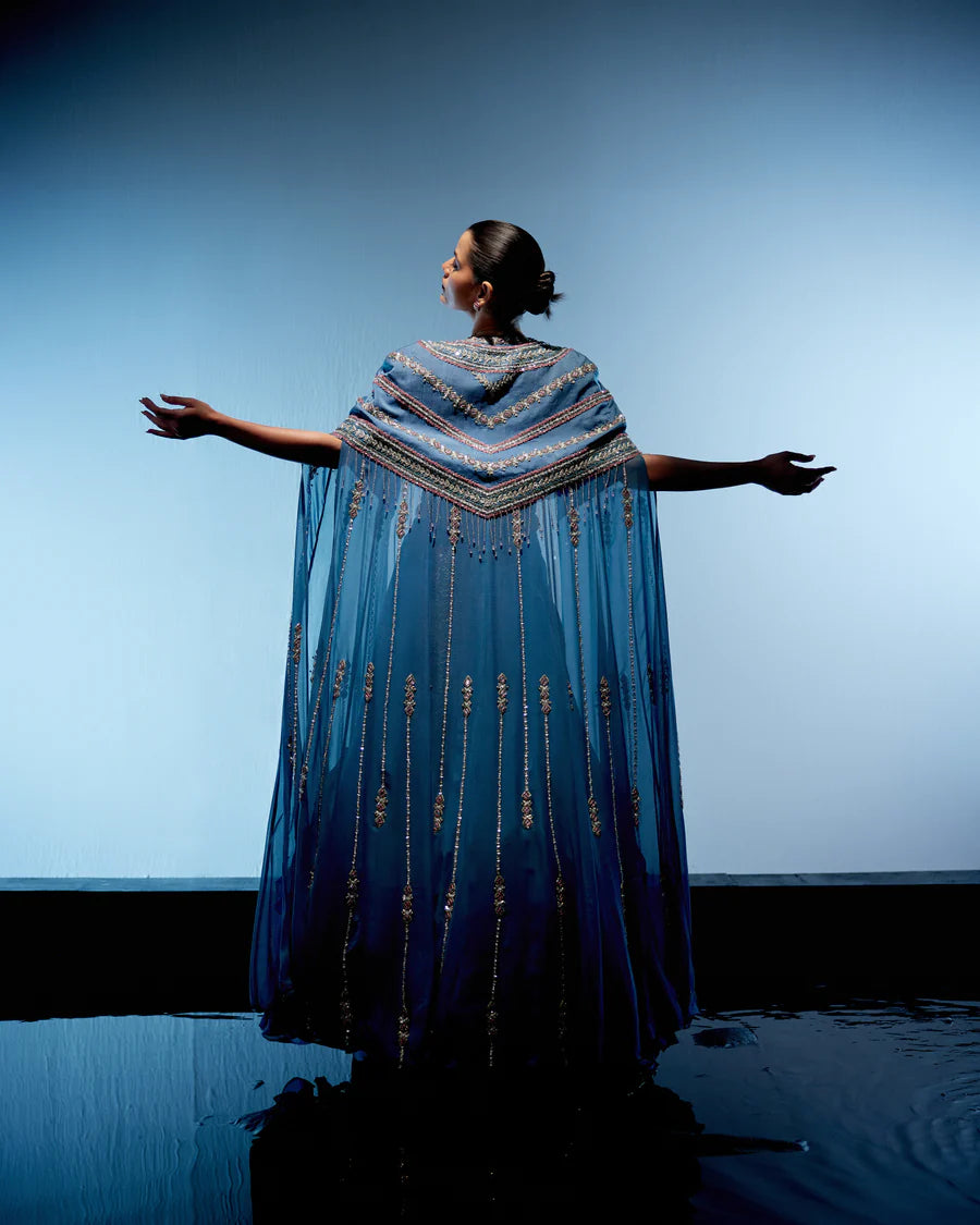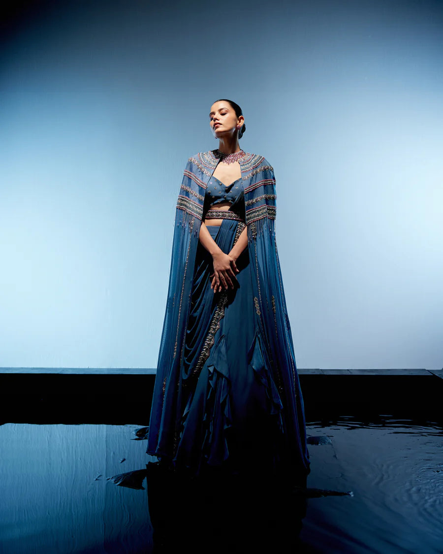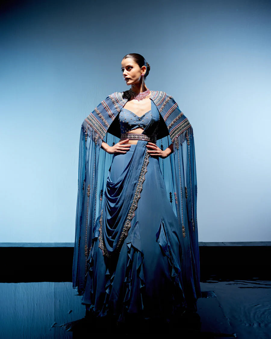 Introducing the Marine Blue Draped Lehenga, a vision of elegance and grace. Paired with a corset blouse adorned with ruffles at every kali, this ensemble exudes feminine charm. Accompanied by a paneled cape featuring intricate embroidery over the shoulder area and delicate vertical detailing, it captivates with its refined craftsmanship. A waist belt adds a touch of sophistication, accentuating the waistline and highlighting the ensemble's unique design features.