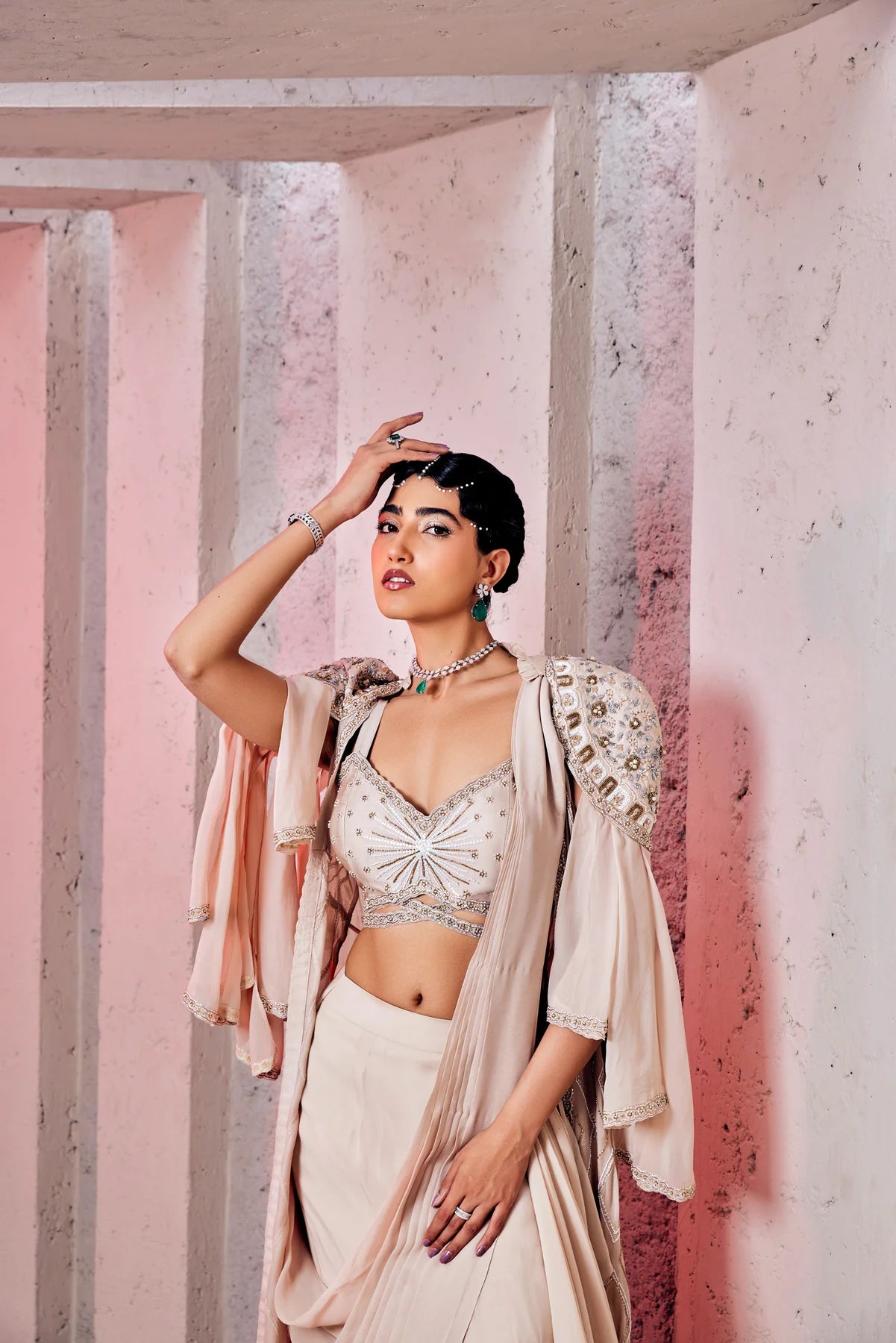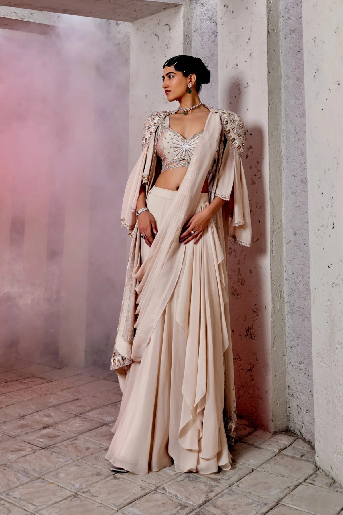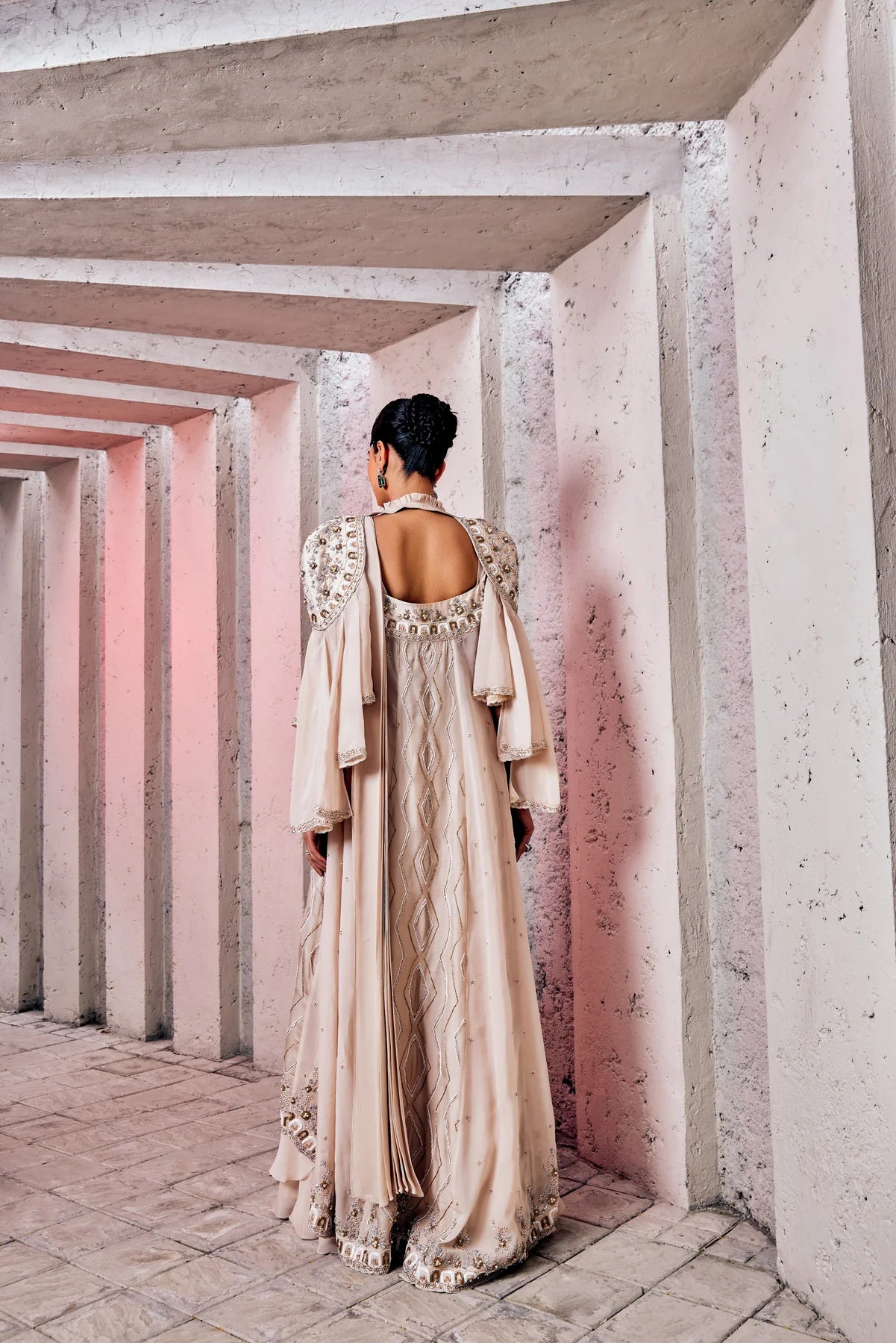 - Layered cape with ruffle detailing around the neck enhances its beauty