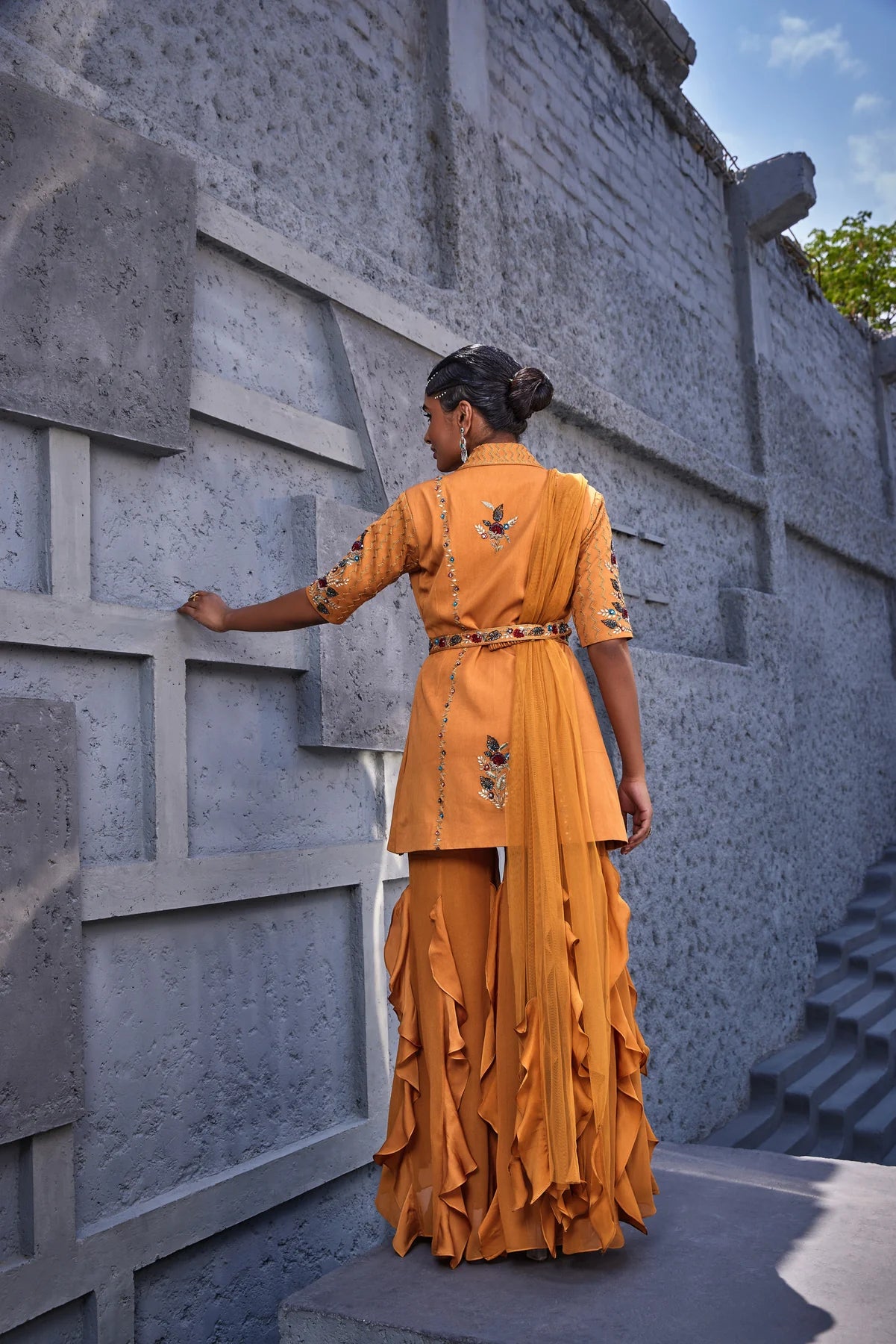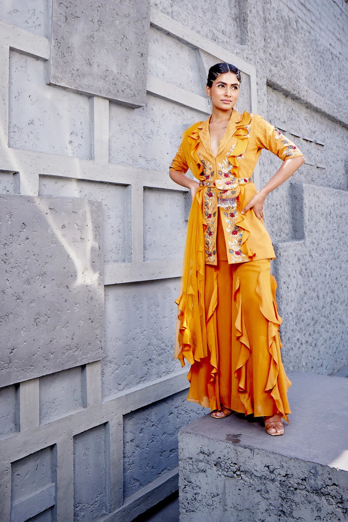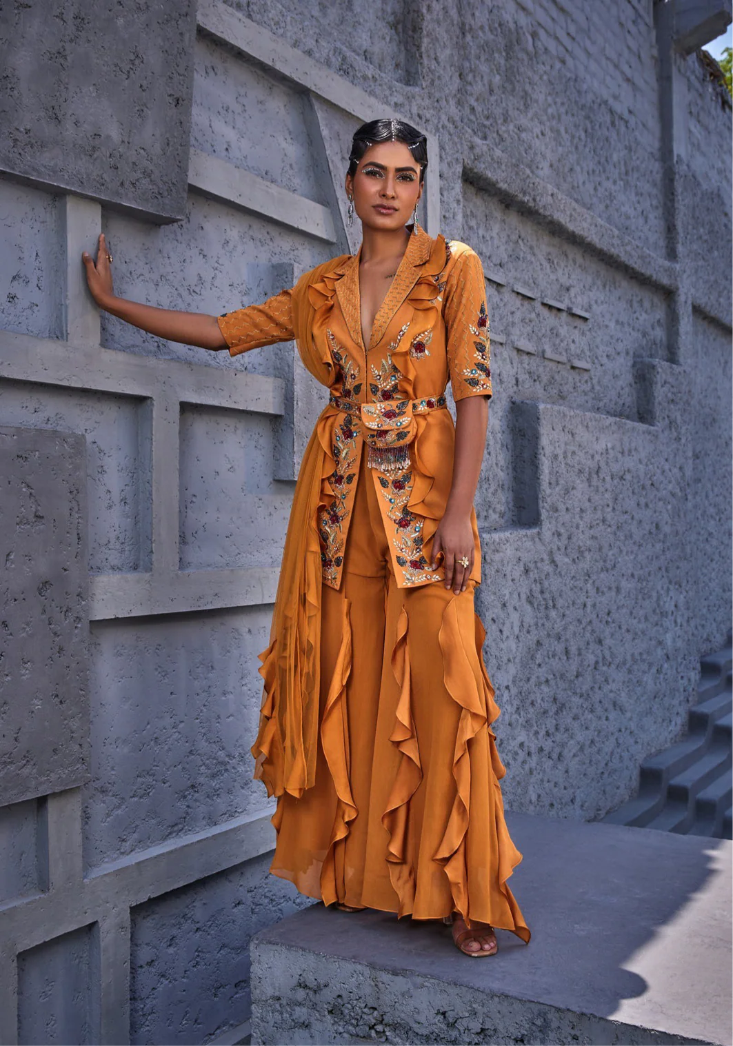 - Jacket with matching ruffles complements the sharara, creating a cohesive look