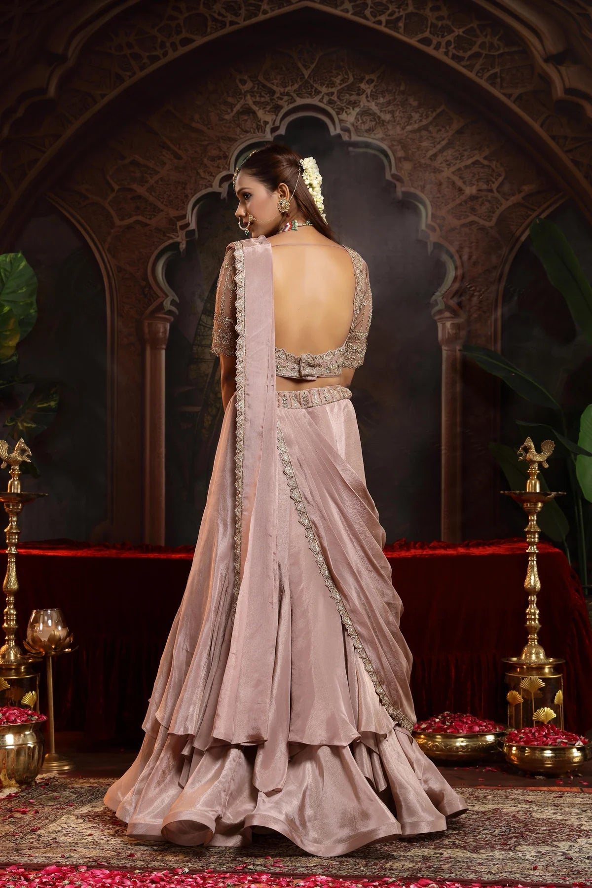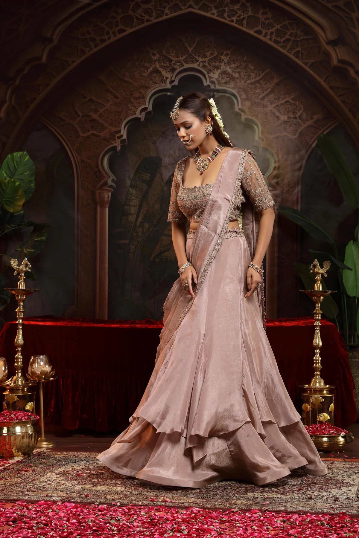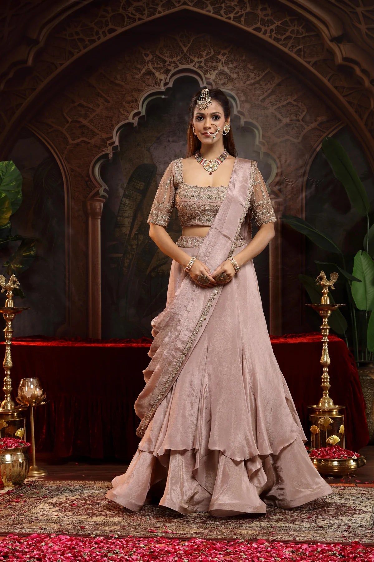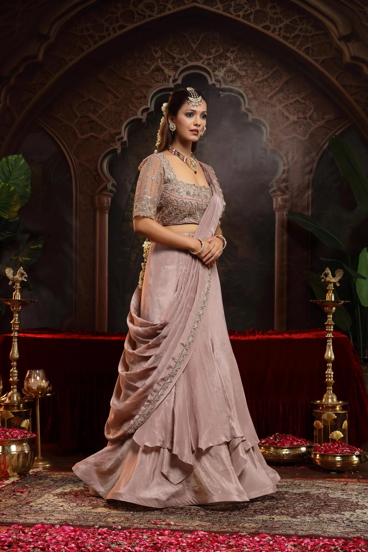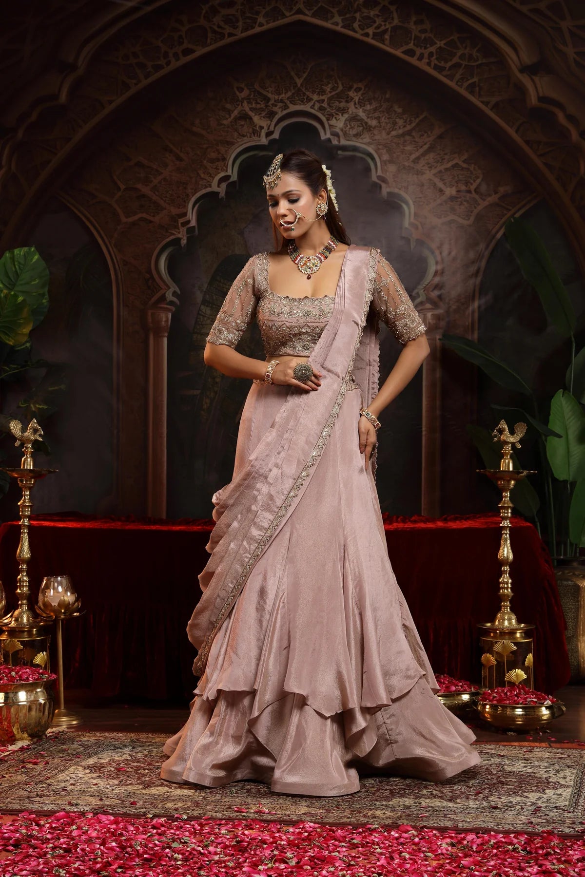 Embrace timeless elegance with this onion pink lehenga drape saree, designed to make a statement. The saree features two distinct layers, with ruffles attached to the kalis, creating a beautiful flow and movement that sets it apart. The attached pallu is adorned with intricate embroidery, enhanced with exquisite cutwork, adding depth and sophistication to the overall look.