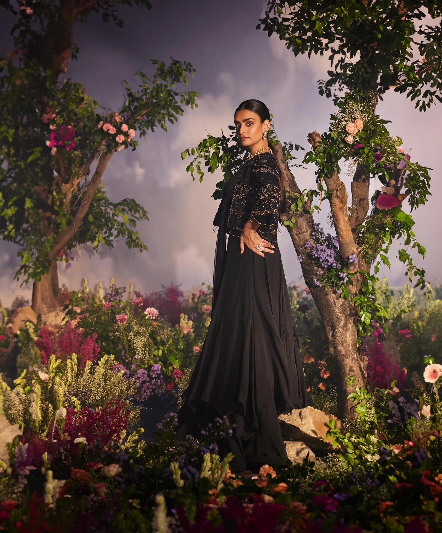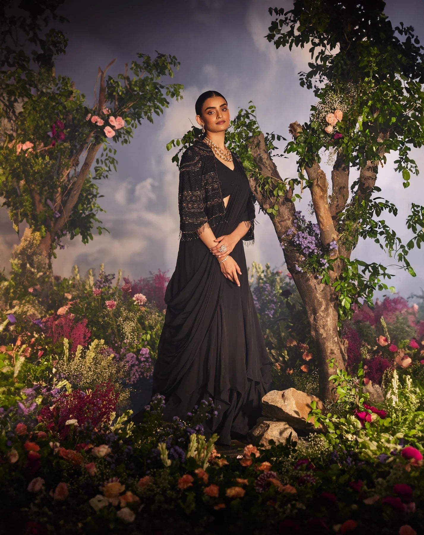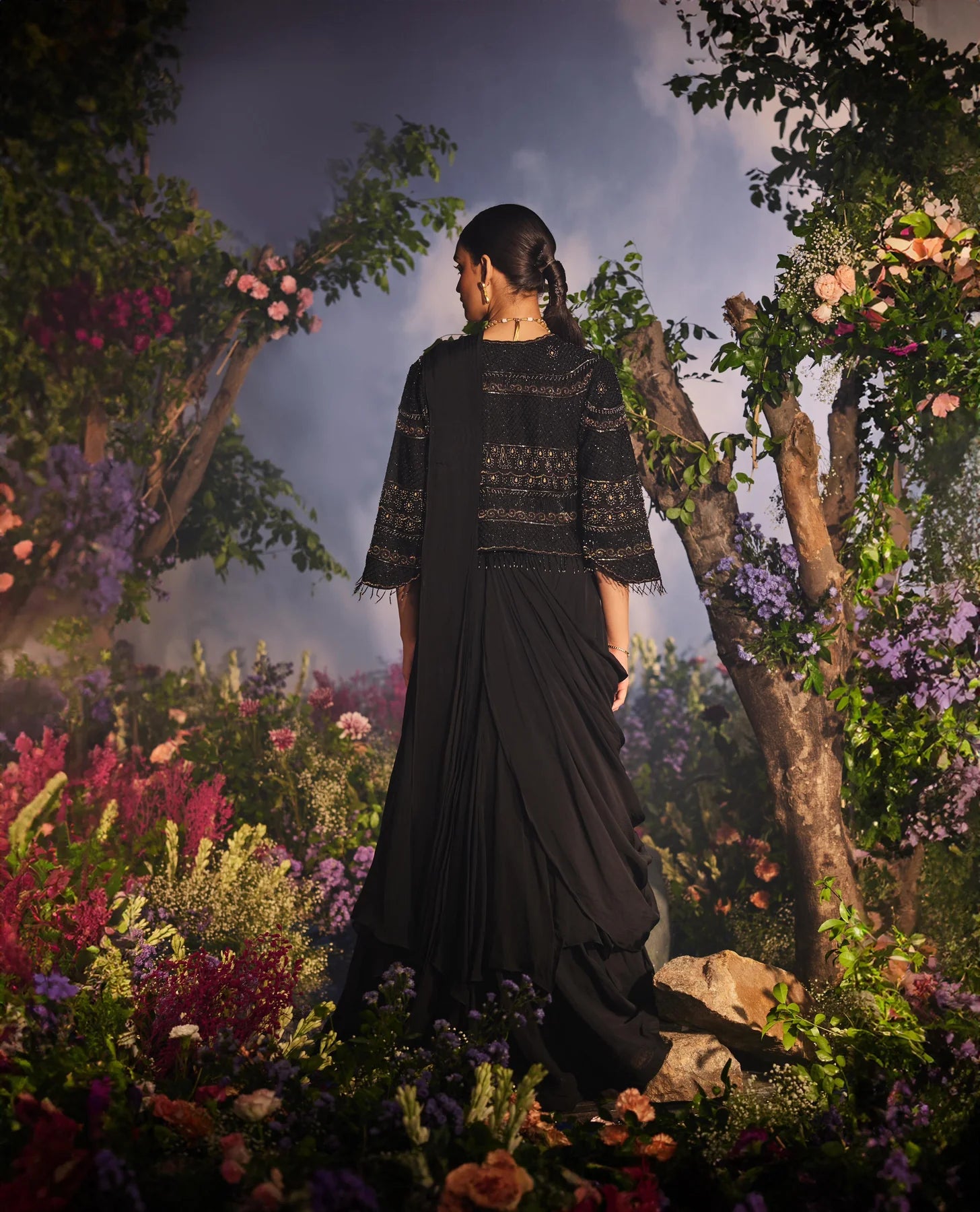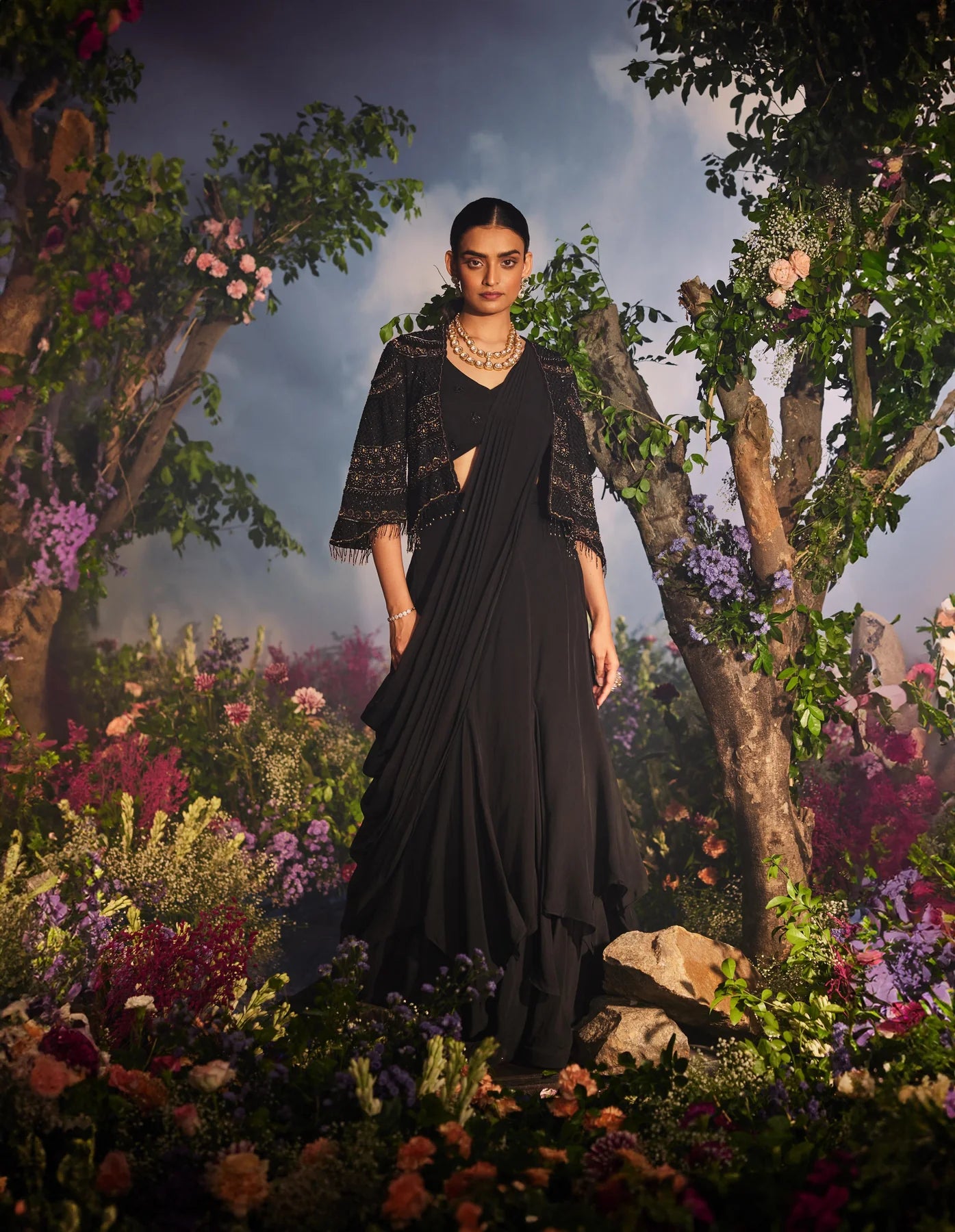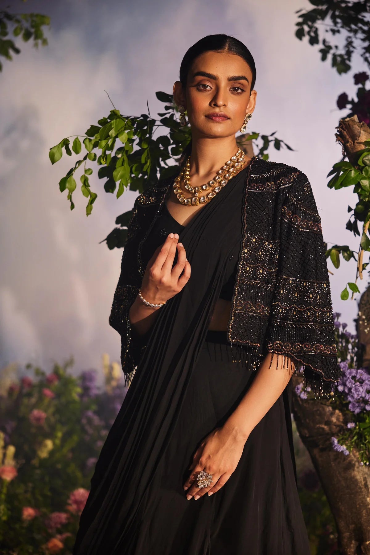 This outfit features a layered lehenga drape saree paired with a blouse. It is adorned with a heavy cape that boasts tonal and golden embroidery, complemented by handcrafted tassels at the edges of the sleeves and jacket. The ensemble offers a glamorous and sophisticated look.