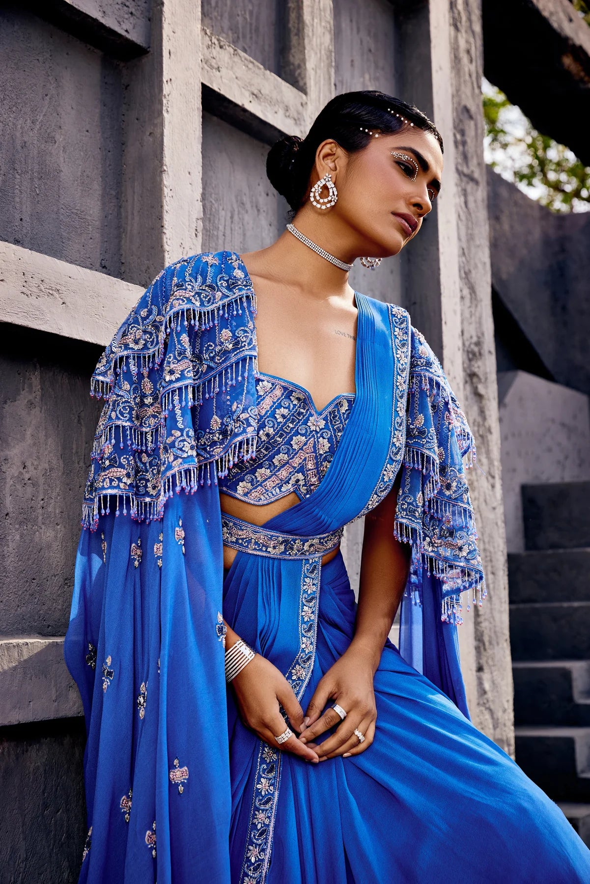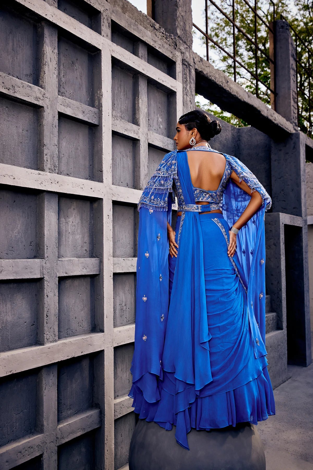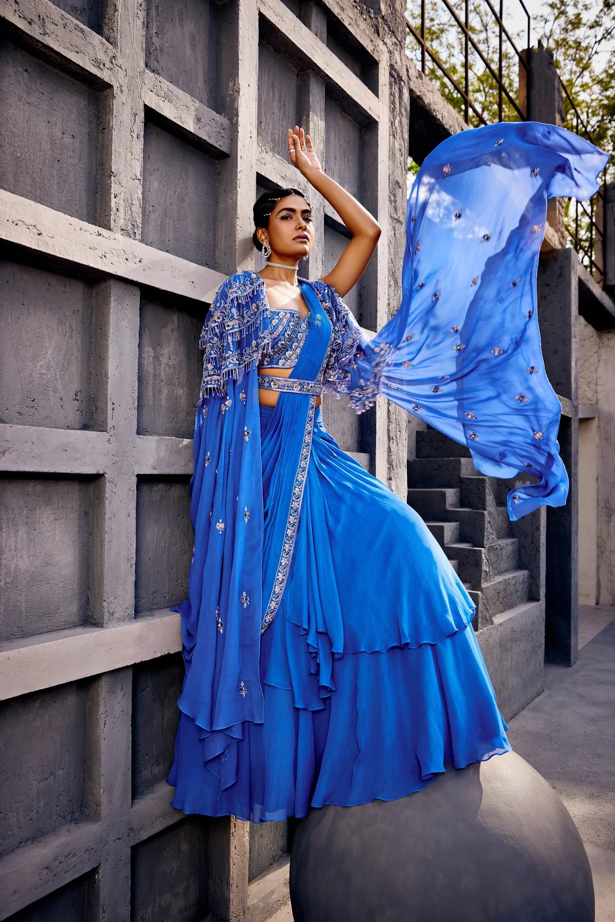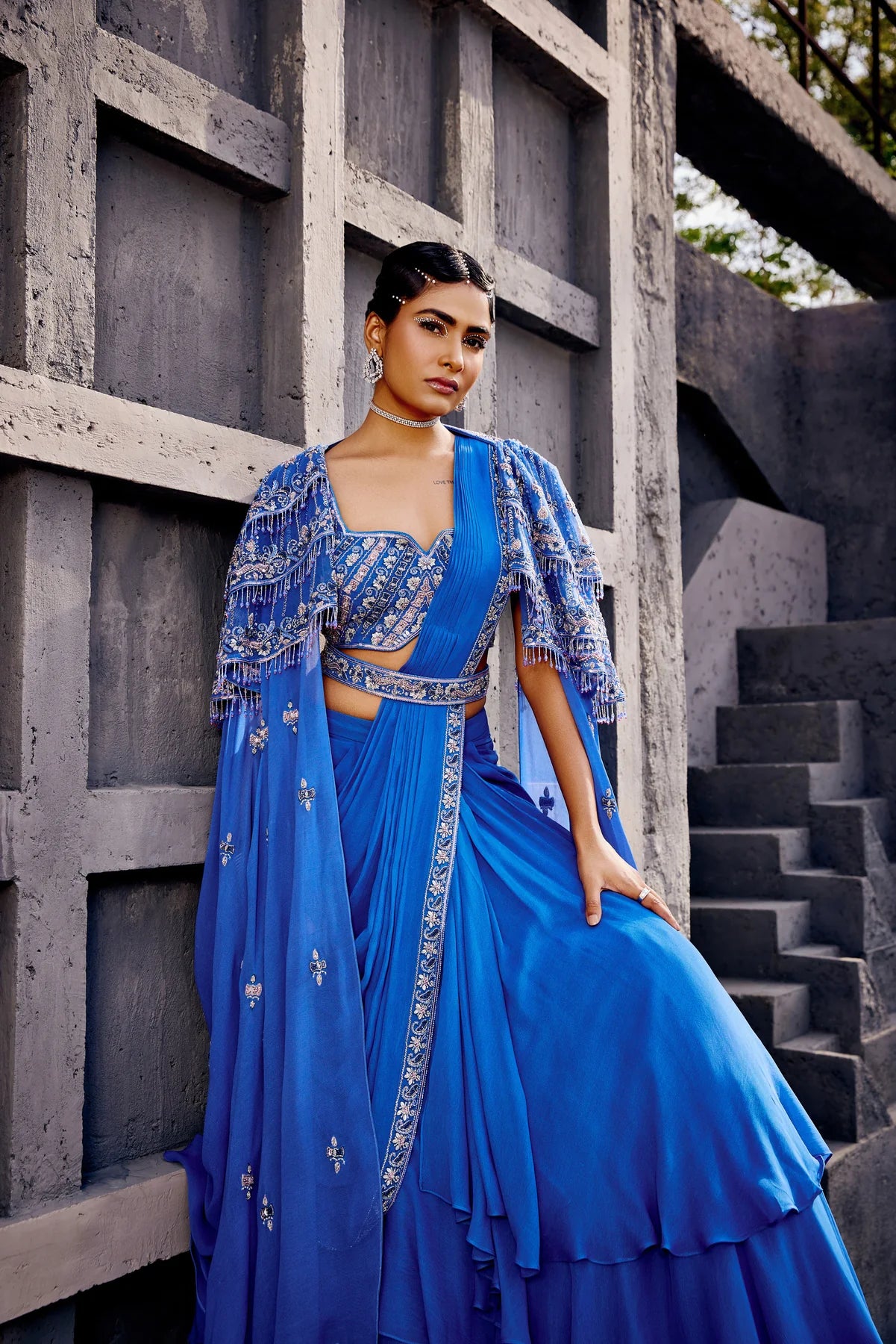 • Pre-draped blue lehenga saree paired with a floor-length cape
