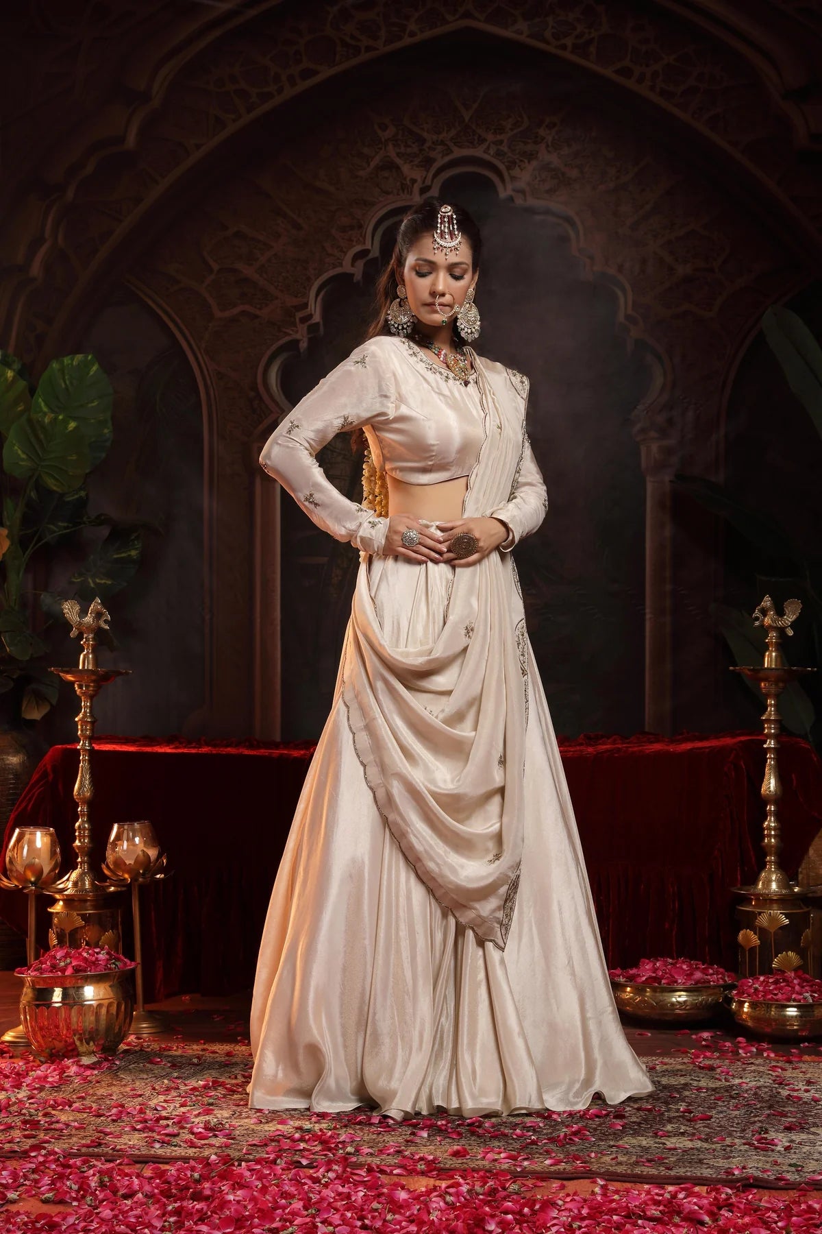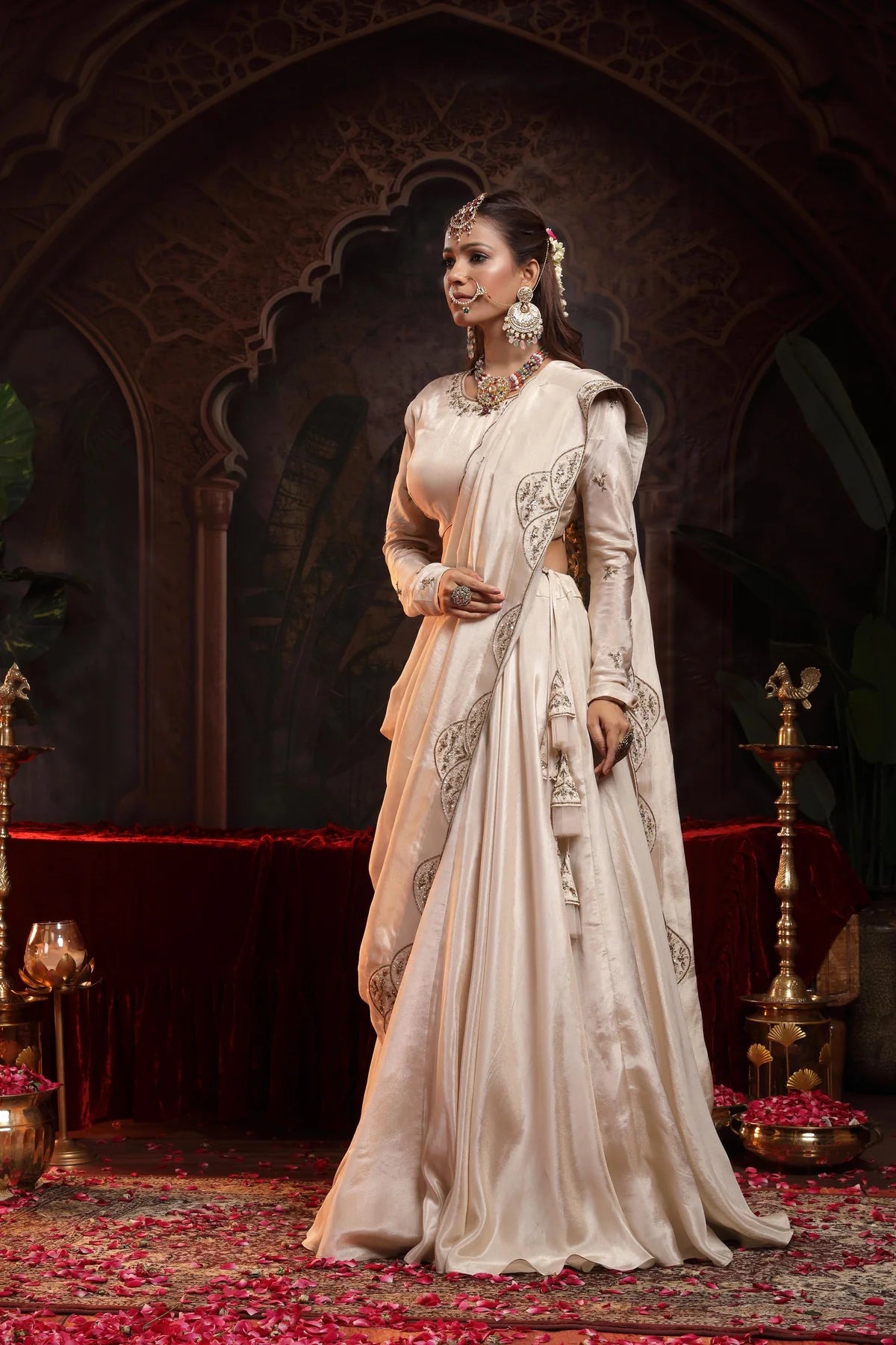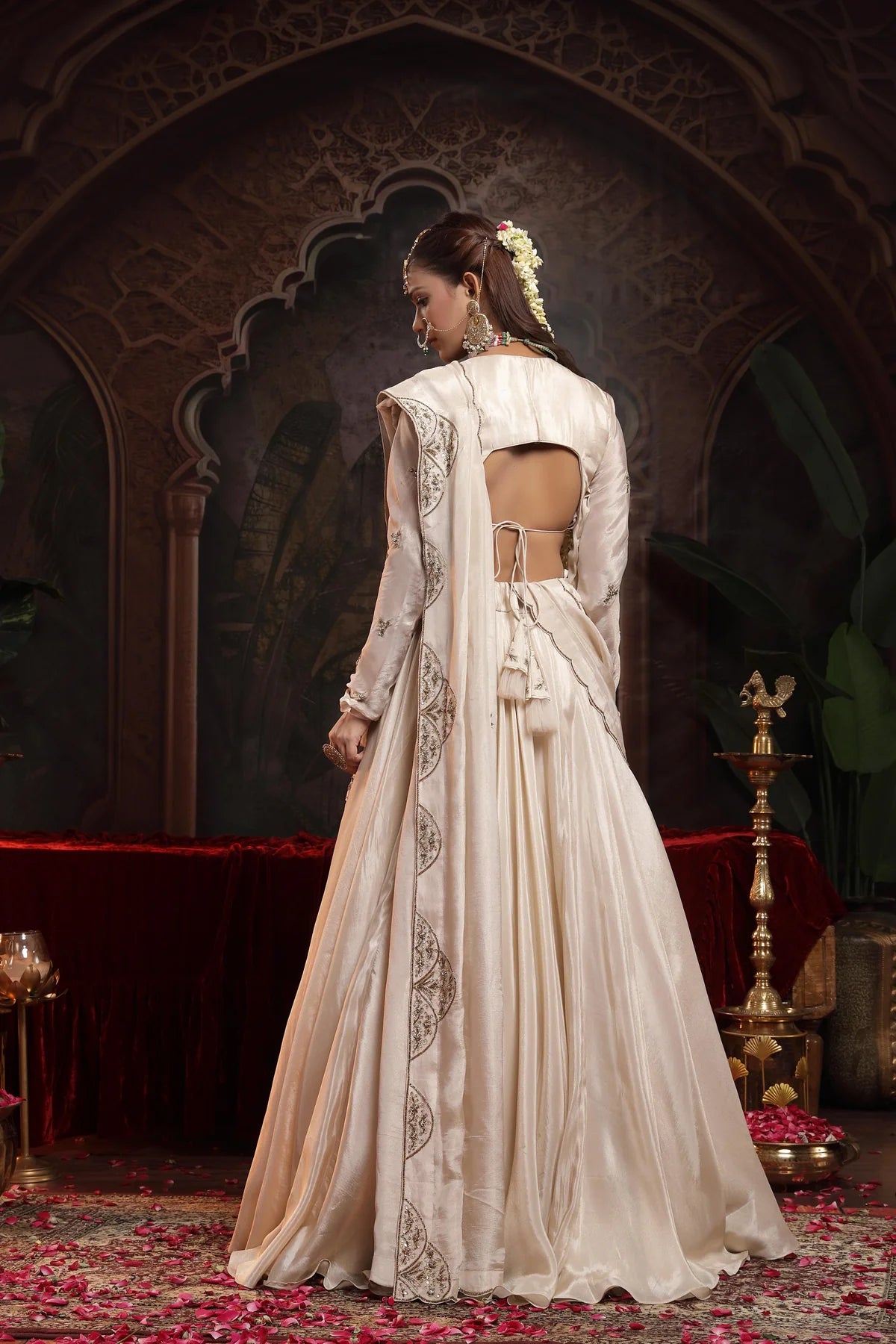 The ensemble is complemented by a dupatta, meticulously hand-embellished with delicate scalloped borders, adding a refined and regal finish.