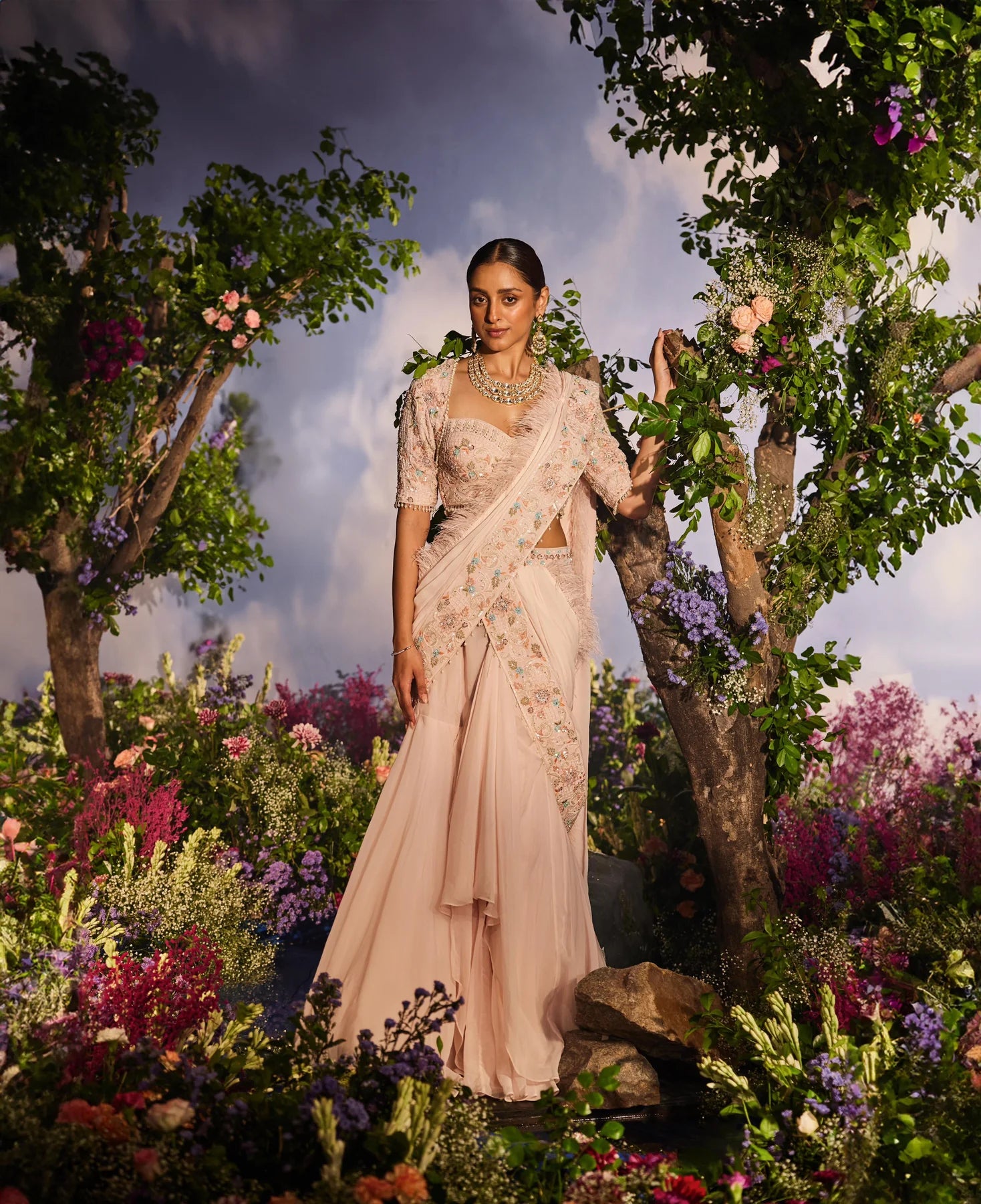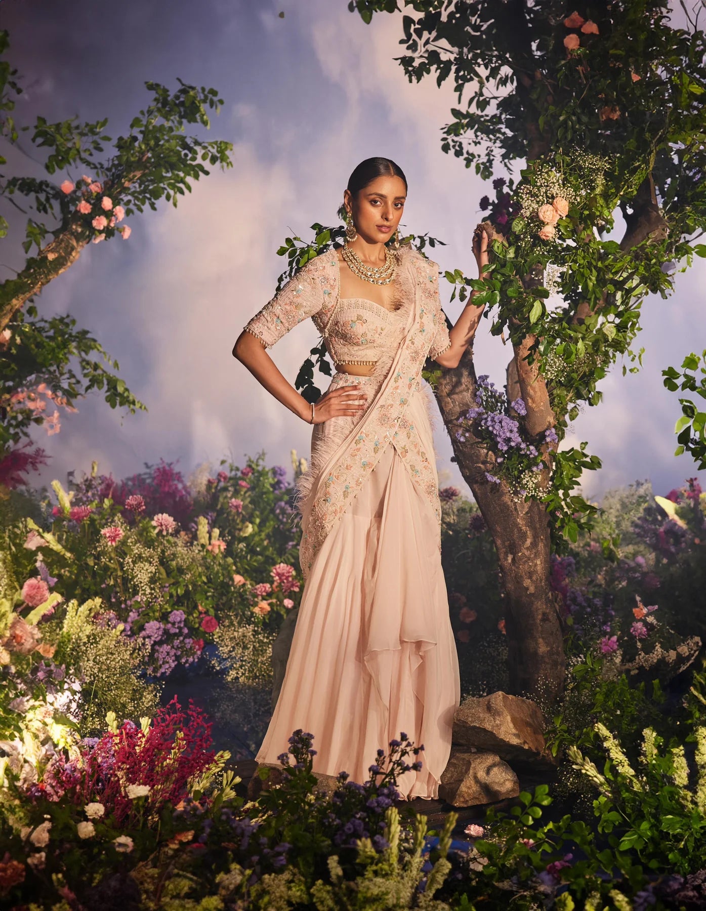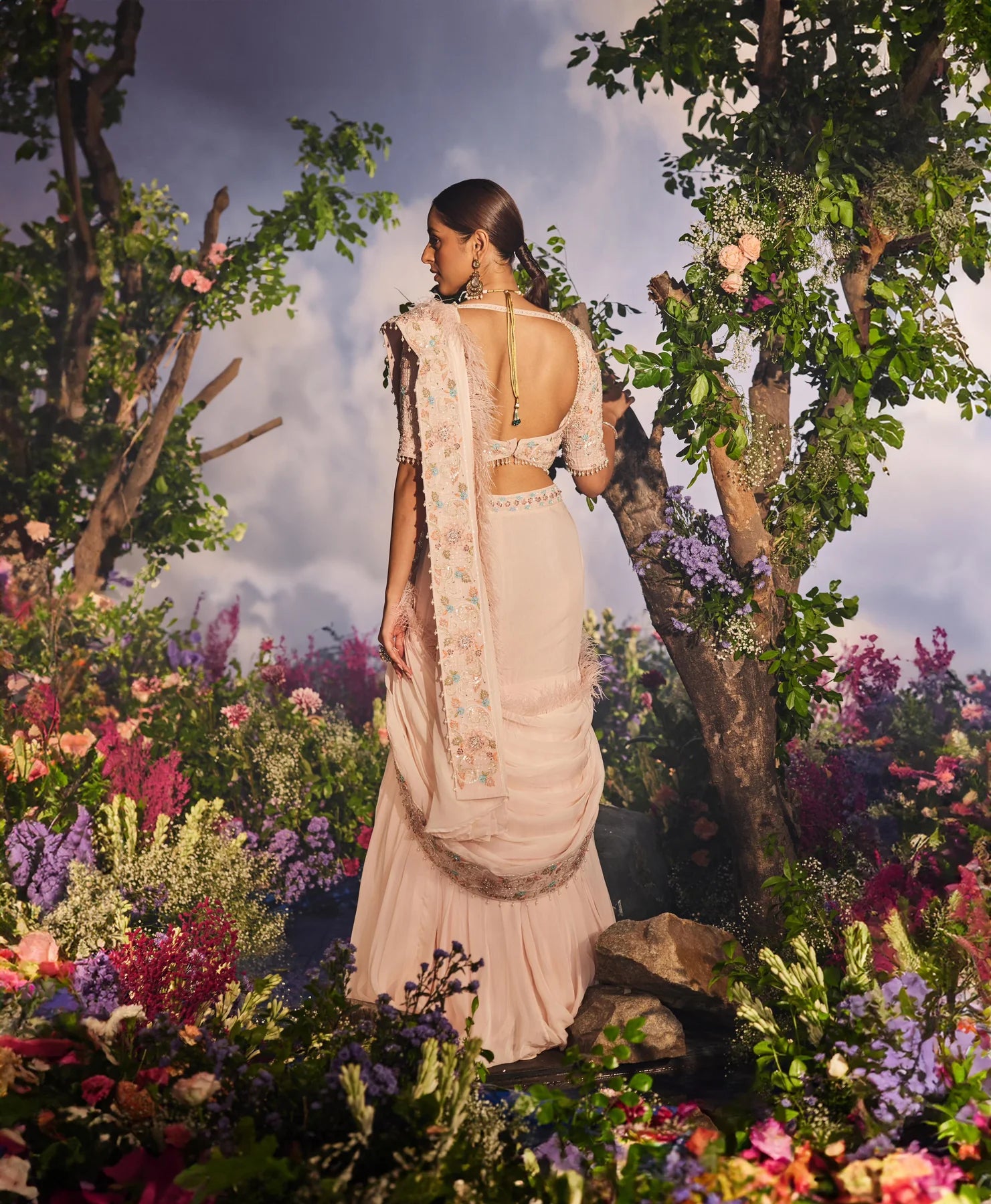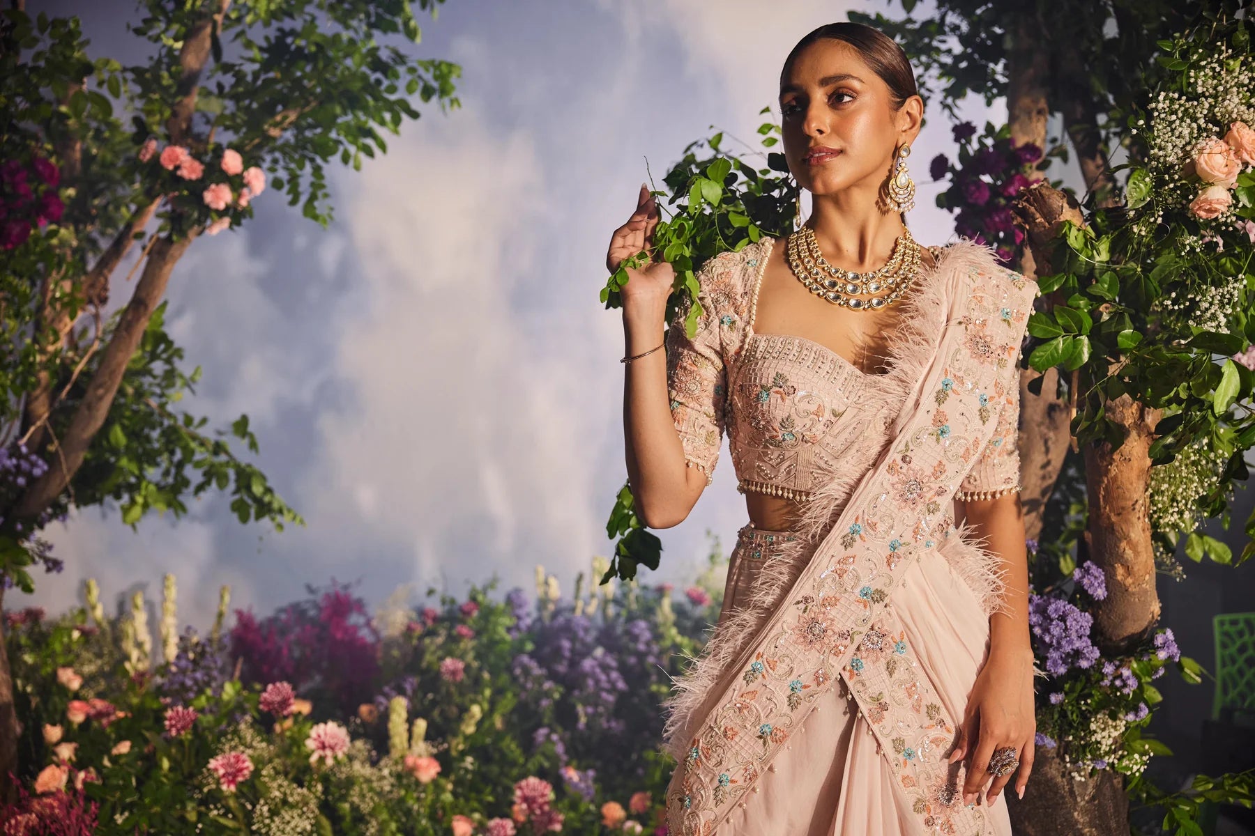 This outfit features a corset-style blouse with intricate thread embroidery highlighted by cutdana and sequins. The blouse is paired with a draped lehenga and an attached dupatta adorned with an embroidered border, embellished with feathers. The blouse is further enhanced with pearl hangings on the waist and sleeves, adding a touch of elegance and sophistication to the ensemble.