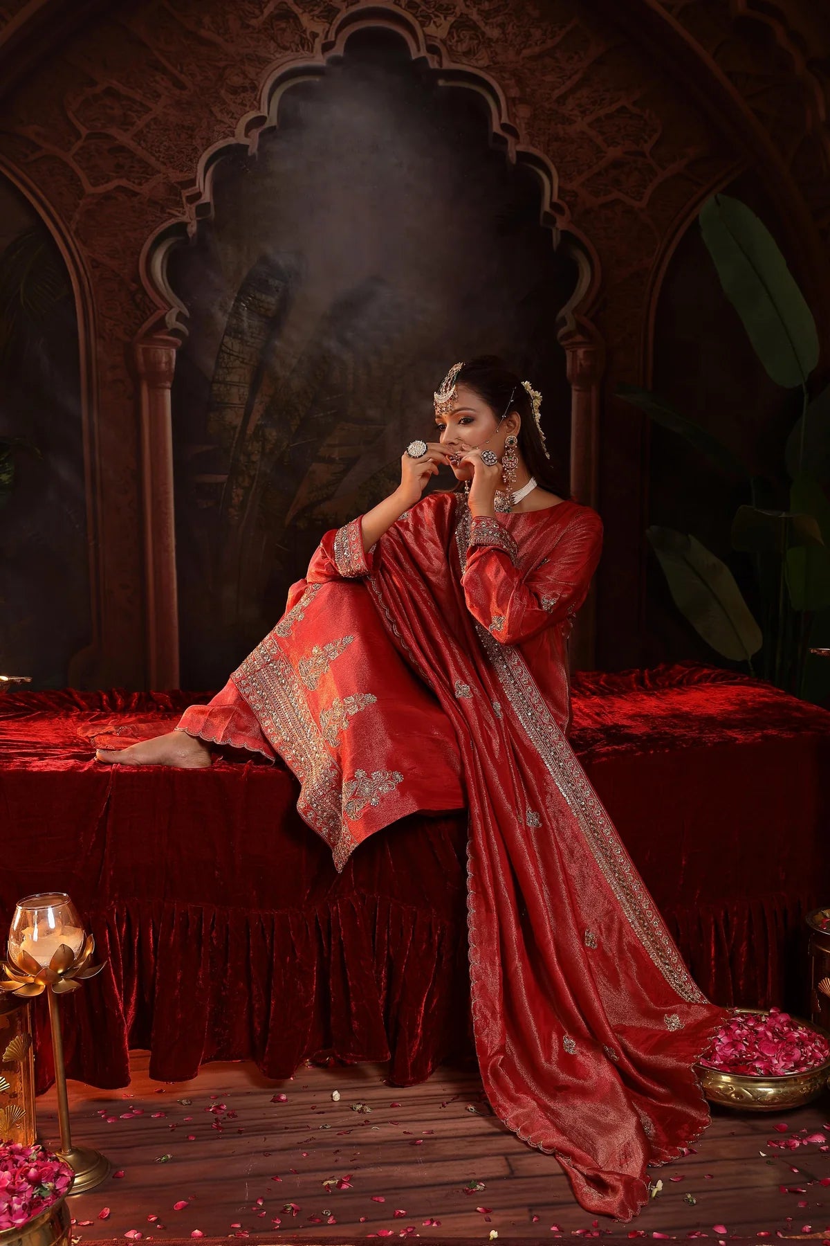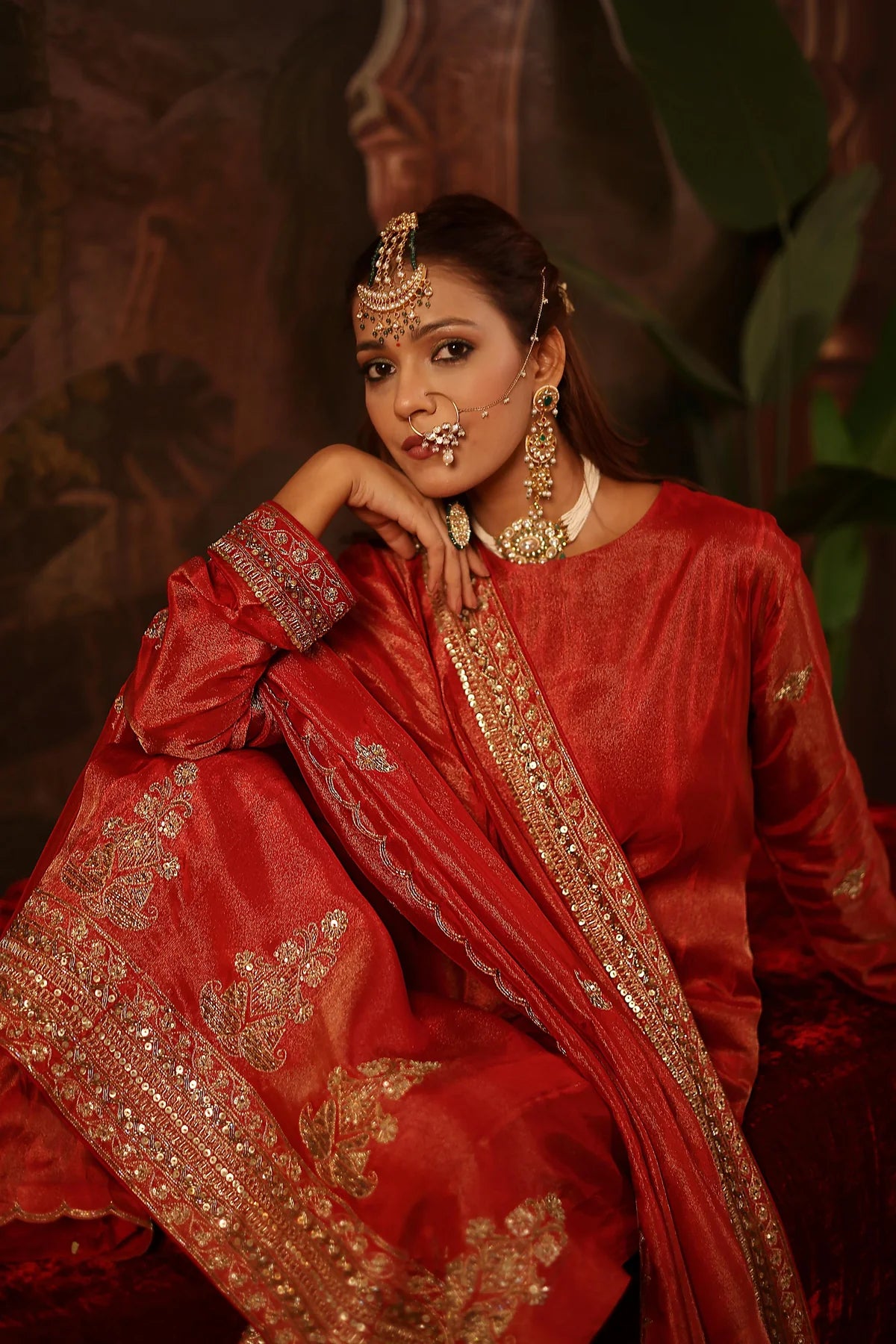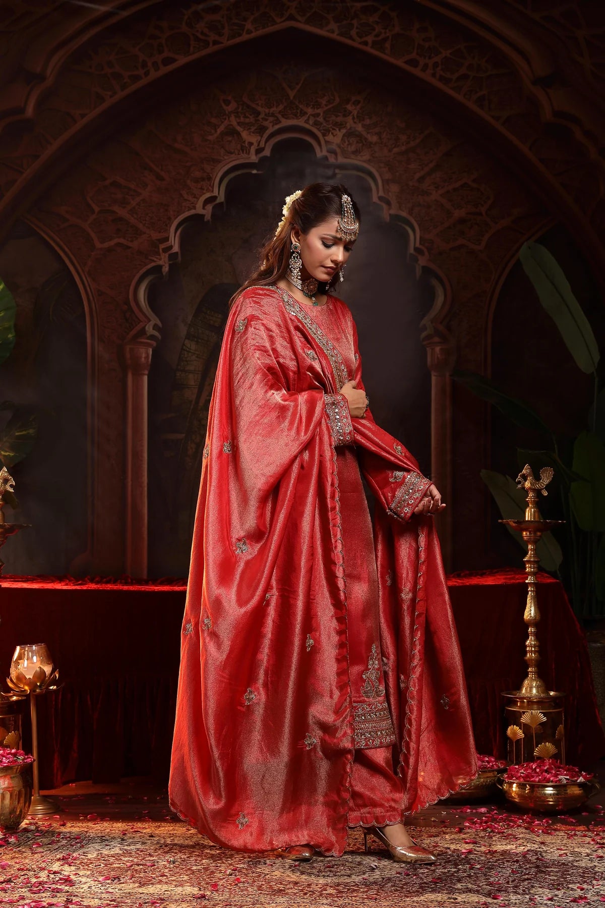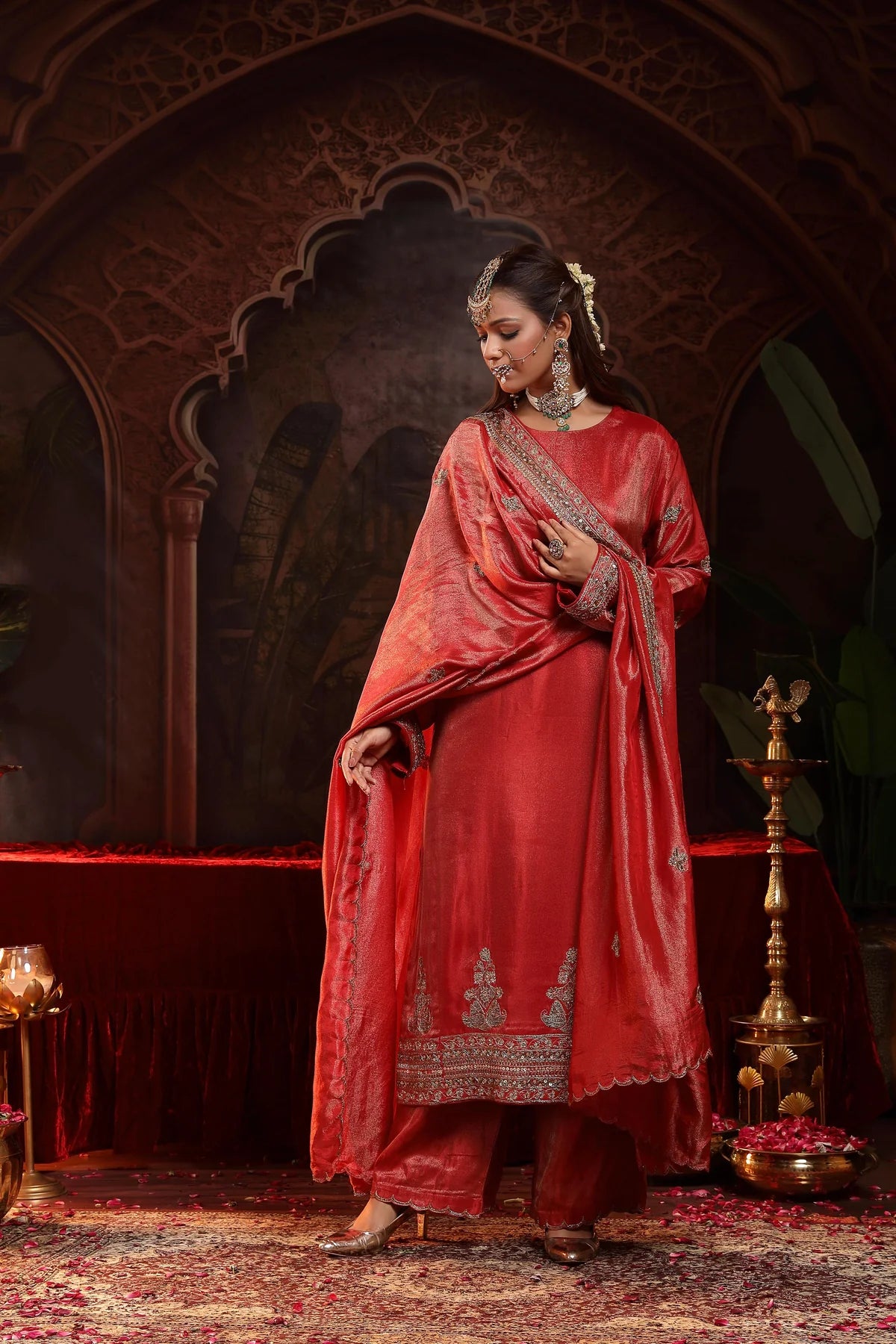 A beautiful red straight suit paired with a palazzo and a dupatta featuring scalloped edges.