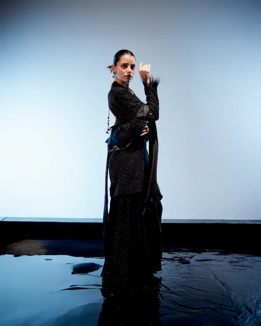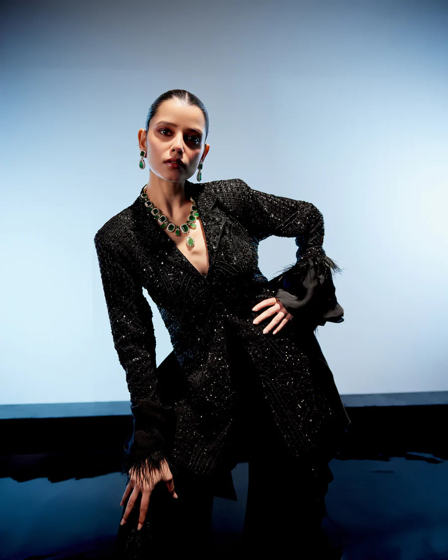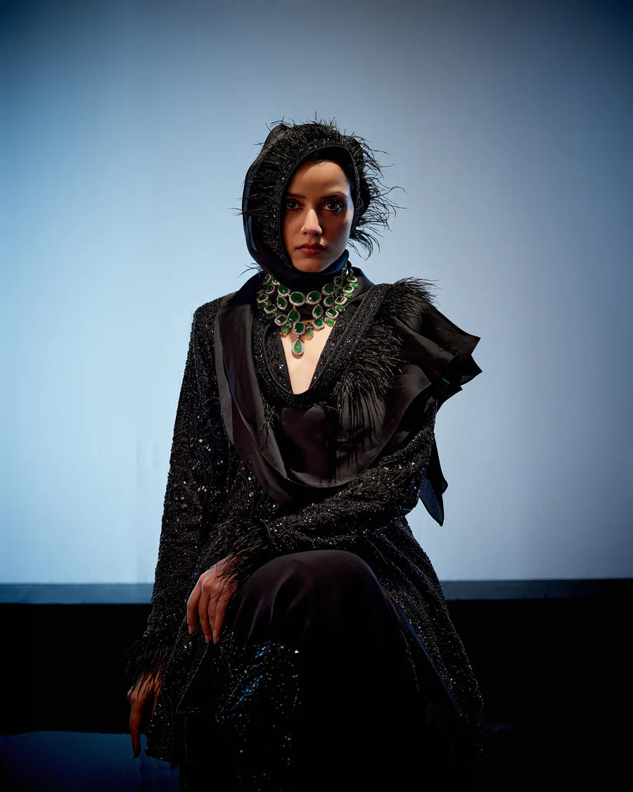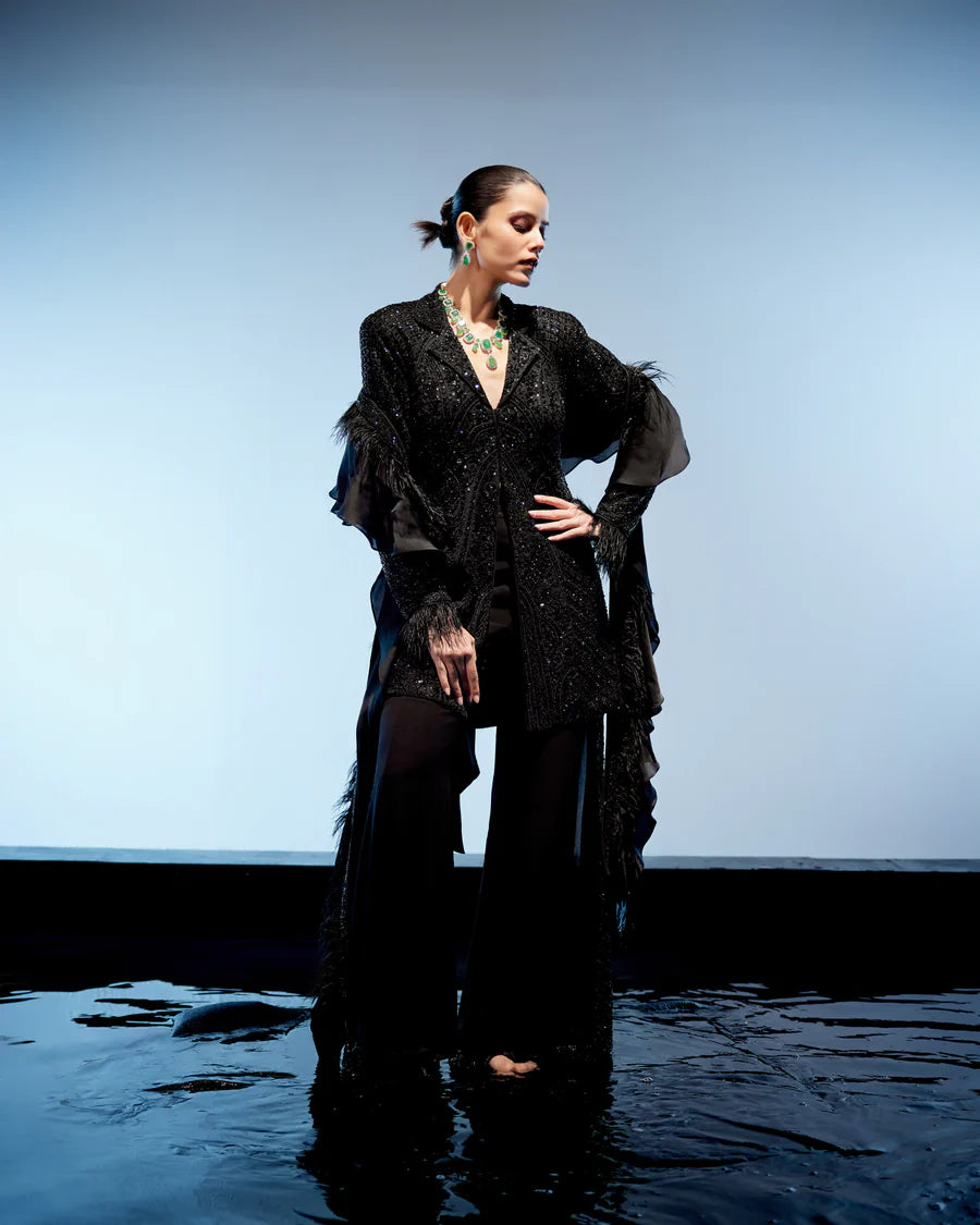 Introducing the chic Black Indo-Western outfit, blending retro pants with modern flair. Adorned with jewel-toned embroidery along the sides, the ensemble exudes sophistication and style. Paired with a statement jacket featuring luxurious feather accents at the sleeve ends, it adds a touch of glamour to the look. Complete with a ruffle dupatta adorned with feathers and a belt pouch for added flair, this ensemble is the epitome of contemporary elegance and fashion-forward style.