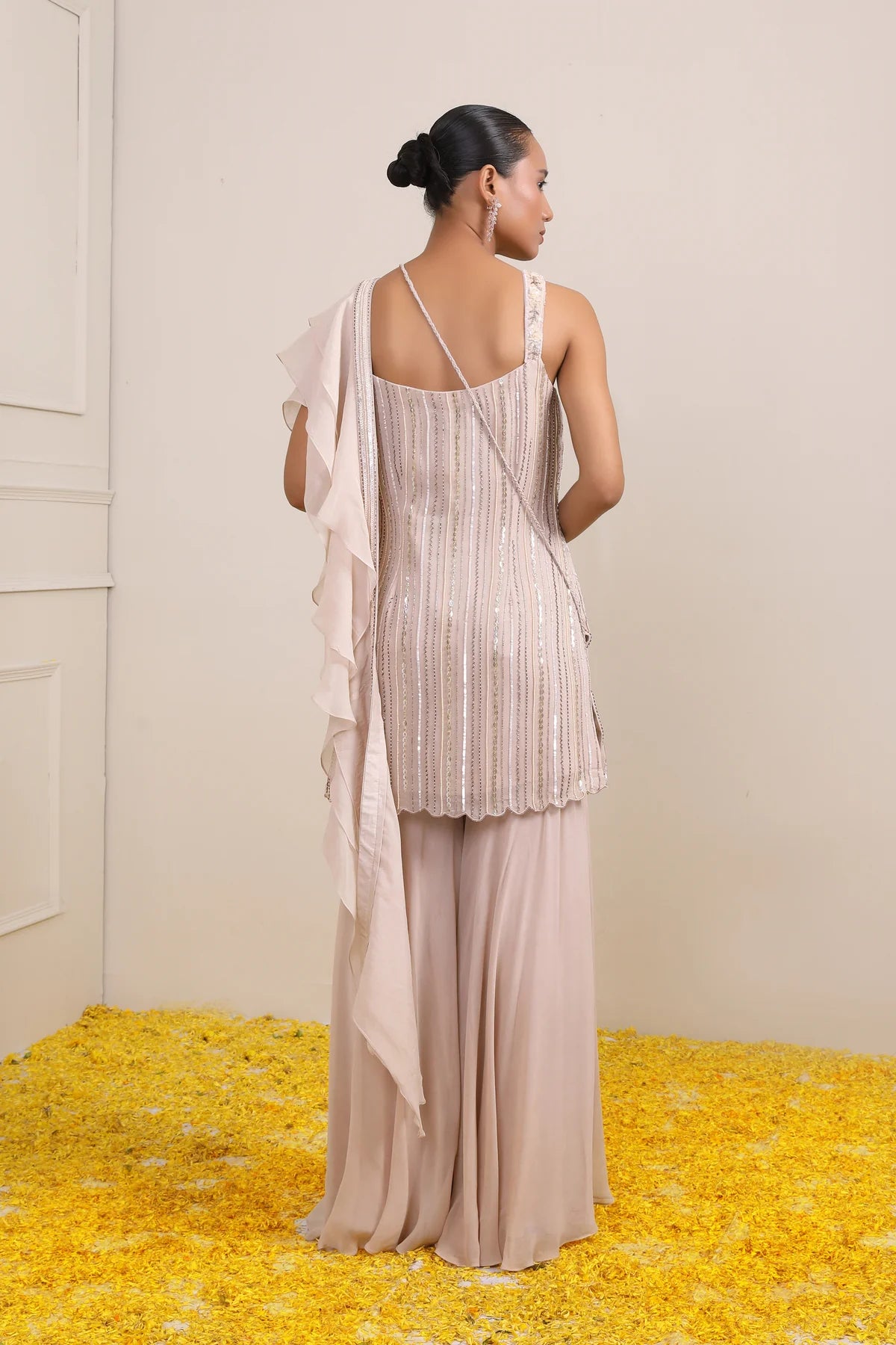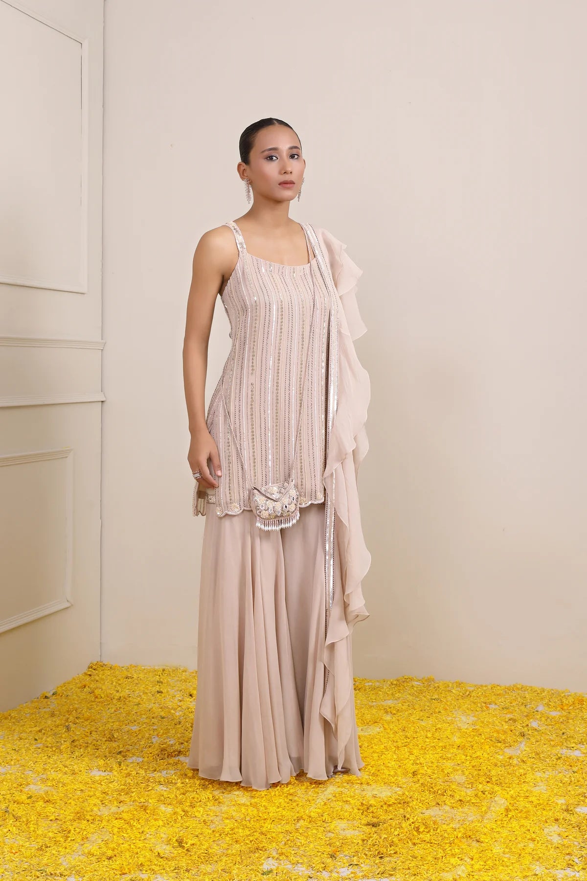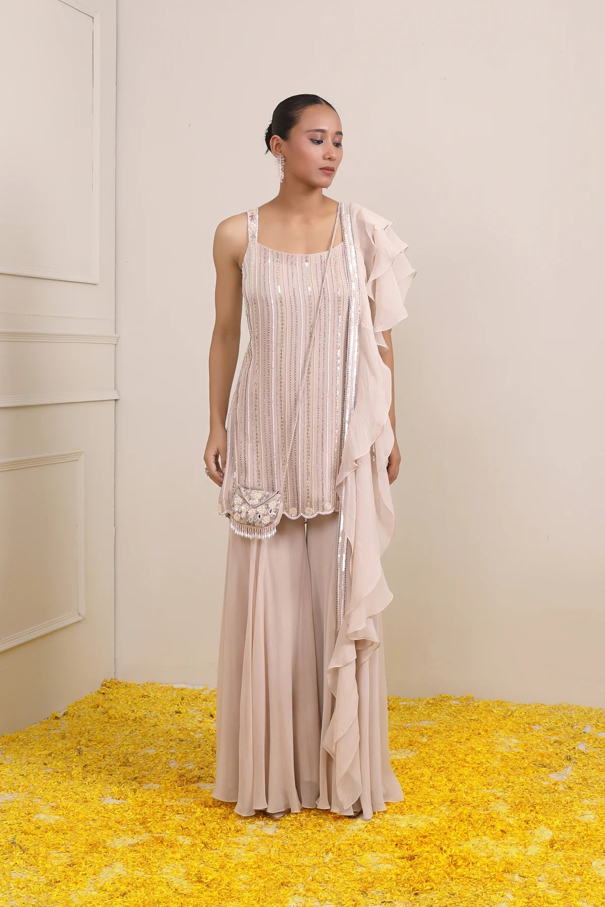This Ivory tunic which is fully hand embroidered is paired with Sharara, consist of embroidery all over the yoke sprinkled with flower booties. This ensemble has a ruffle Dupatta with embroidery and is teamed up with a Sling Bag to add a complete look.
