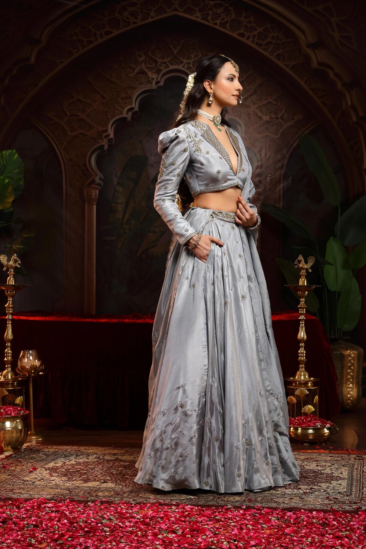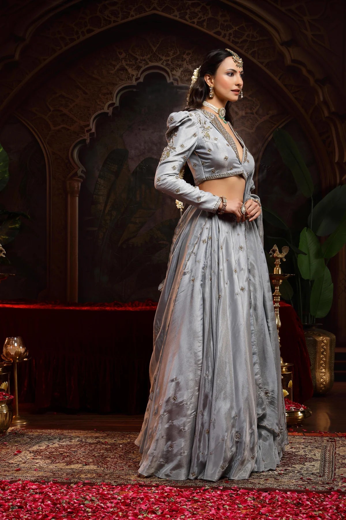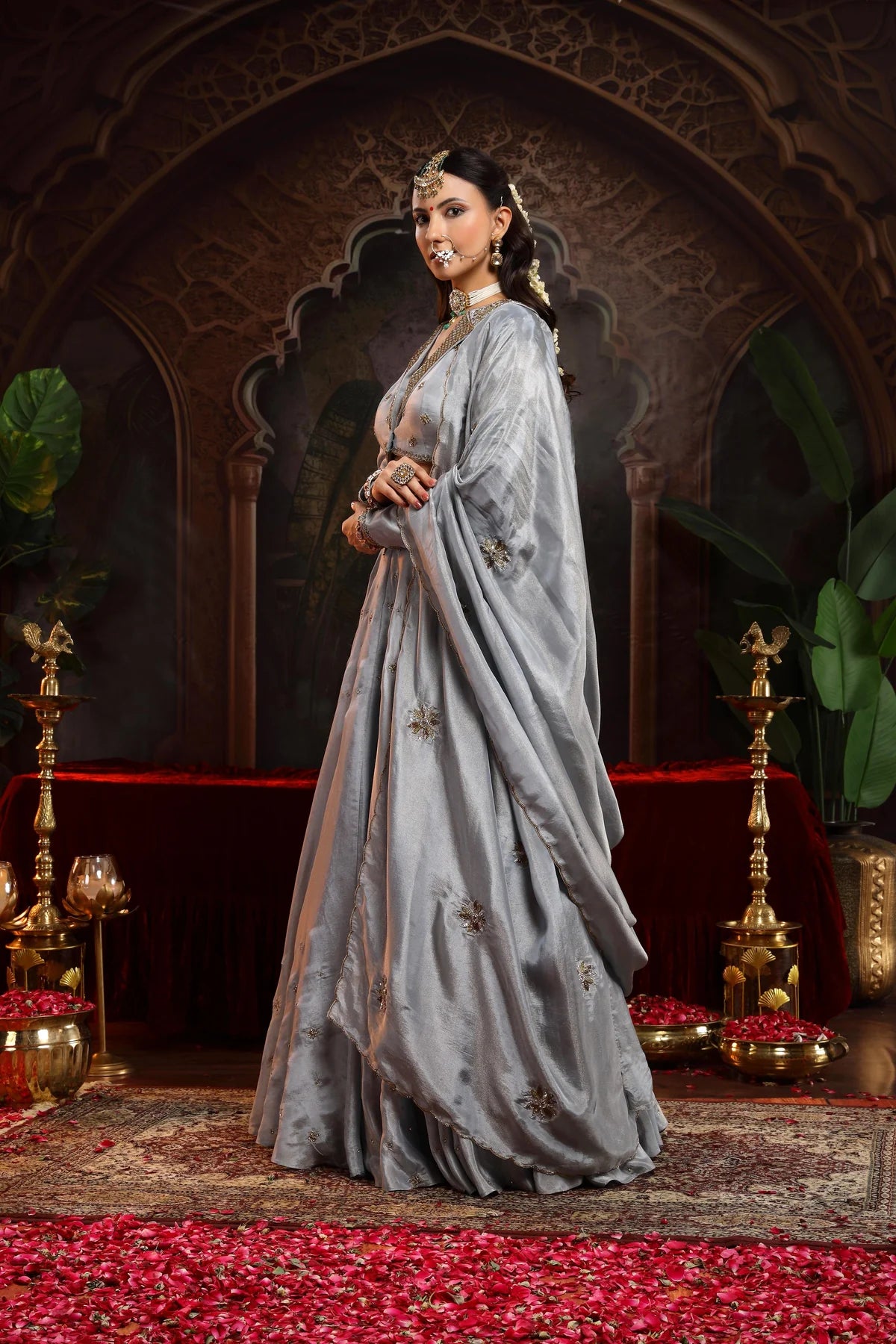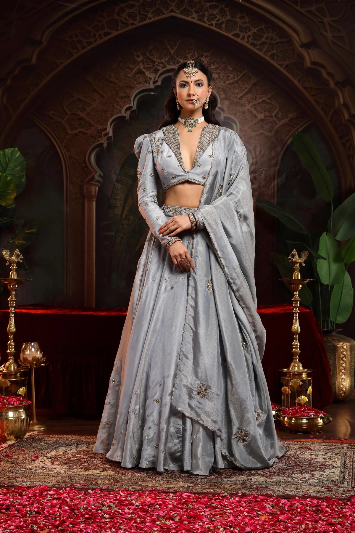 Paired with the lehenga, which features small booties scattered throughout, the garment achieves a perfect balance between structure and fluidity. The dupatta is scalloped on all four sides, with booties scattered across, bringing an added layer of intricate beauty. This ensemble perfectly embodies an Indo-Western fusion.