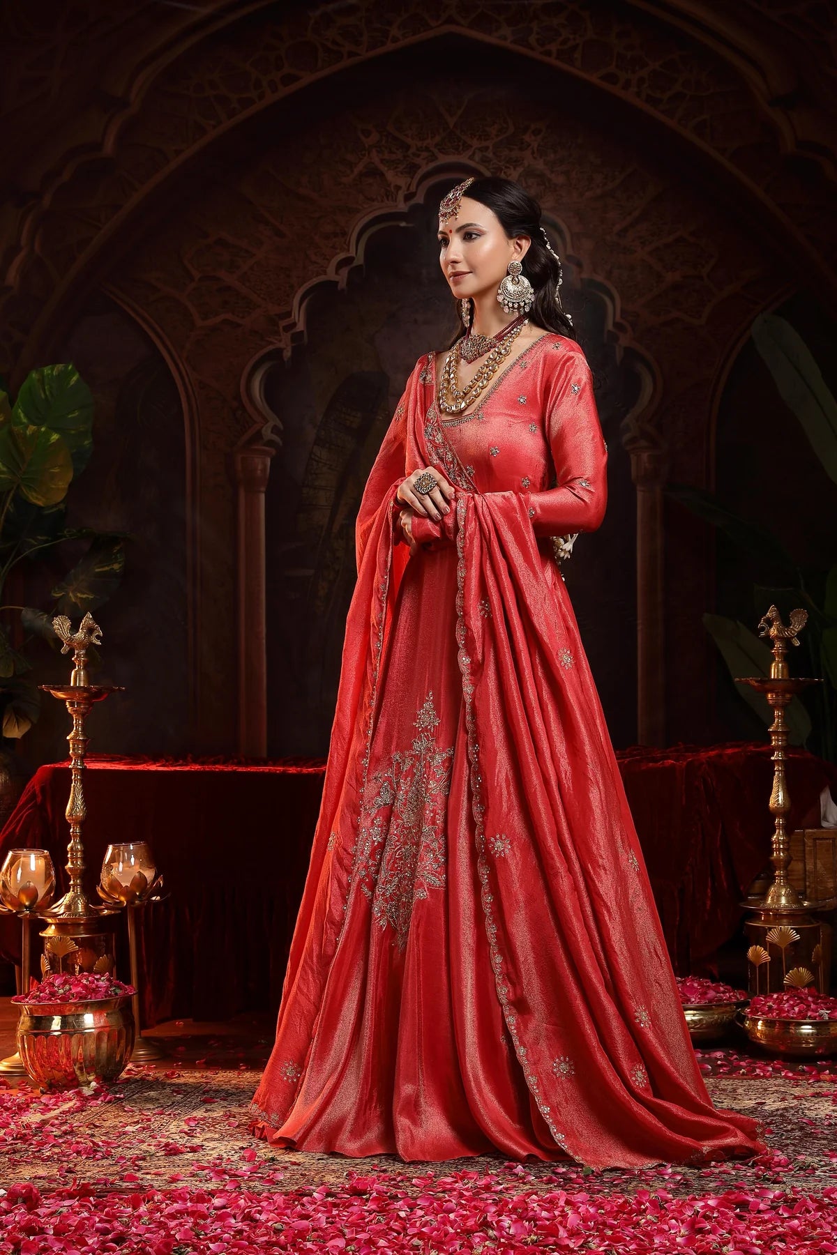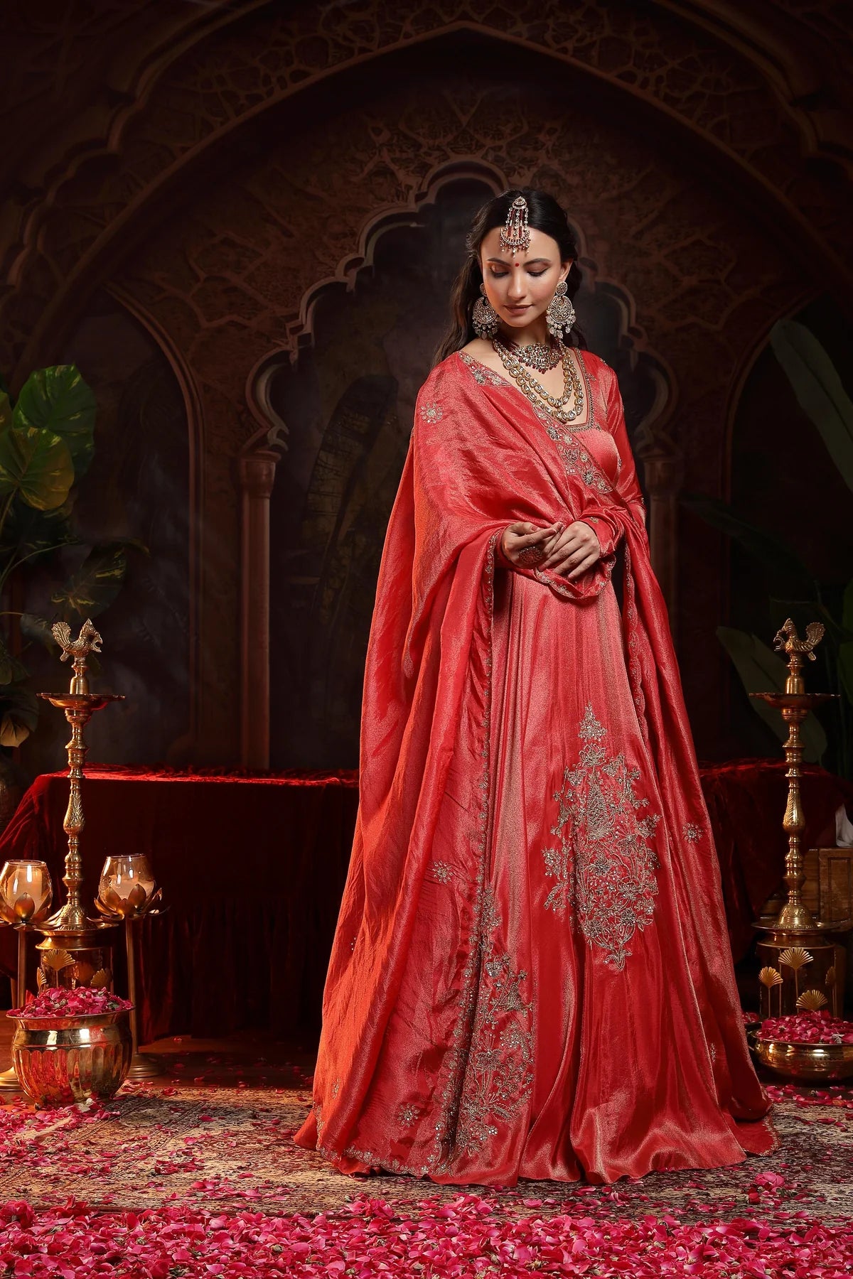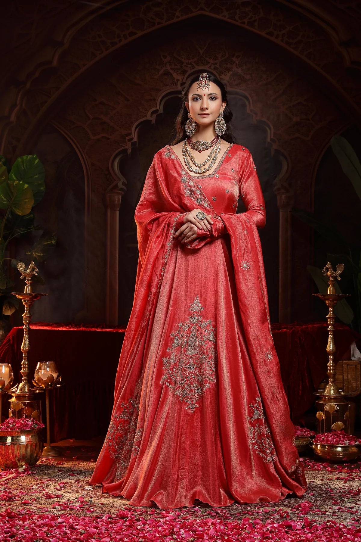 The stunning red Anarkali is the epitome of regal charm and elegance. The Anarkali features a glass-shaped neckline, beautifully accentuated with intricate Zardozi embroidery and delicate booties on the yoke and churidar sleeves, adding a luxurious touch to the design. The ghera of the Anarkali is further enhanced with three embroidered motifs, placed asymmetrically for a striking visual effect that creates a sense of movement and grandeur.