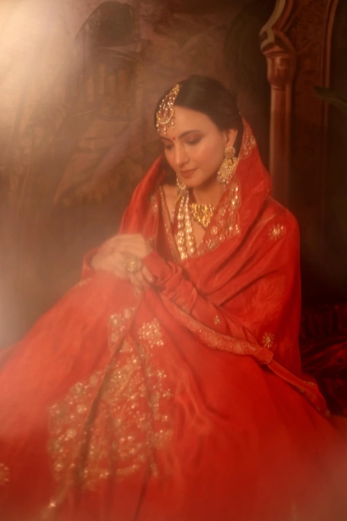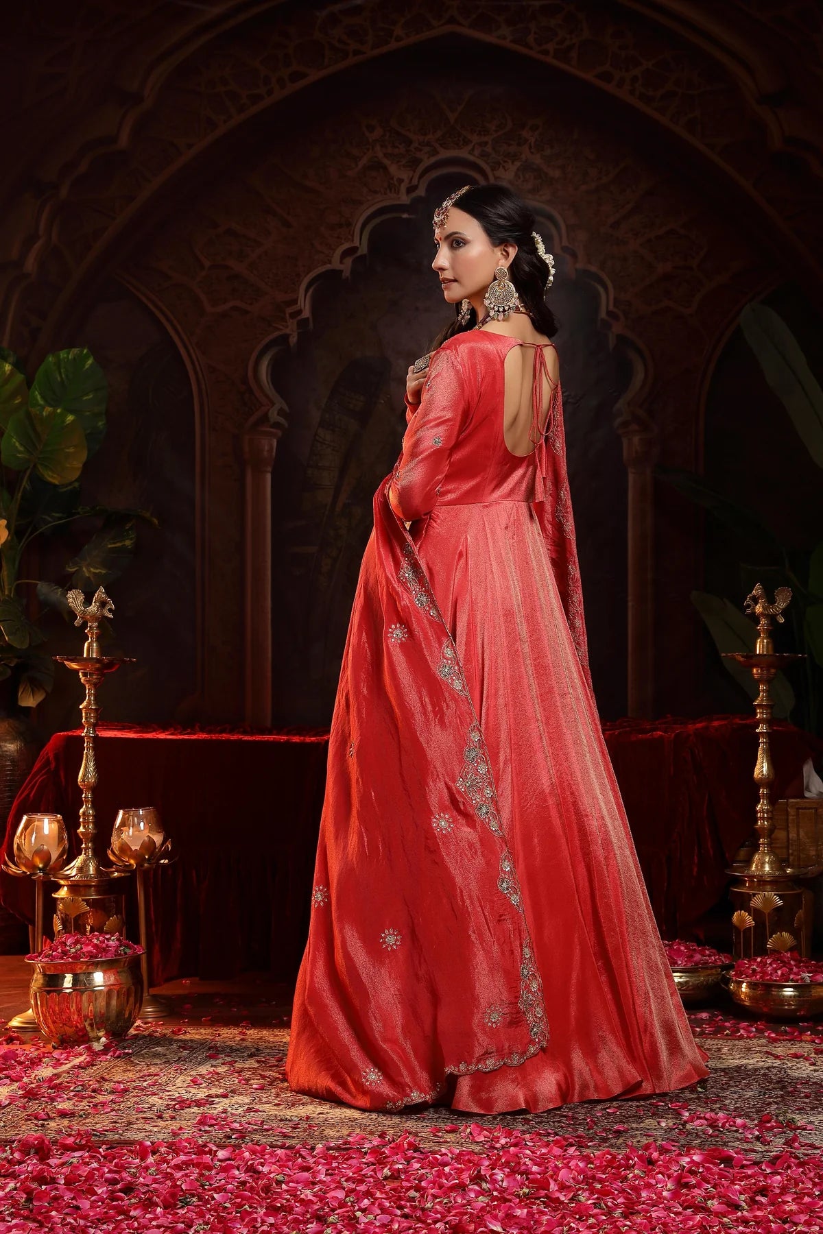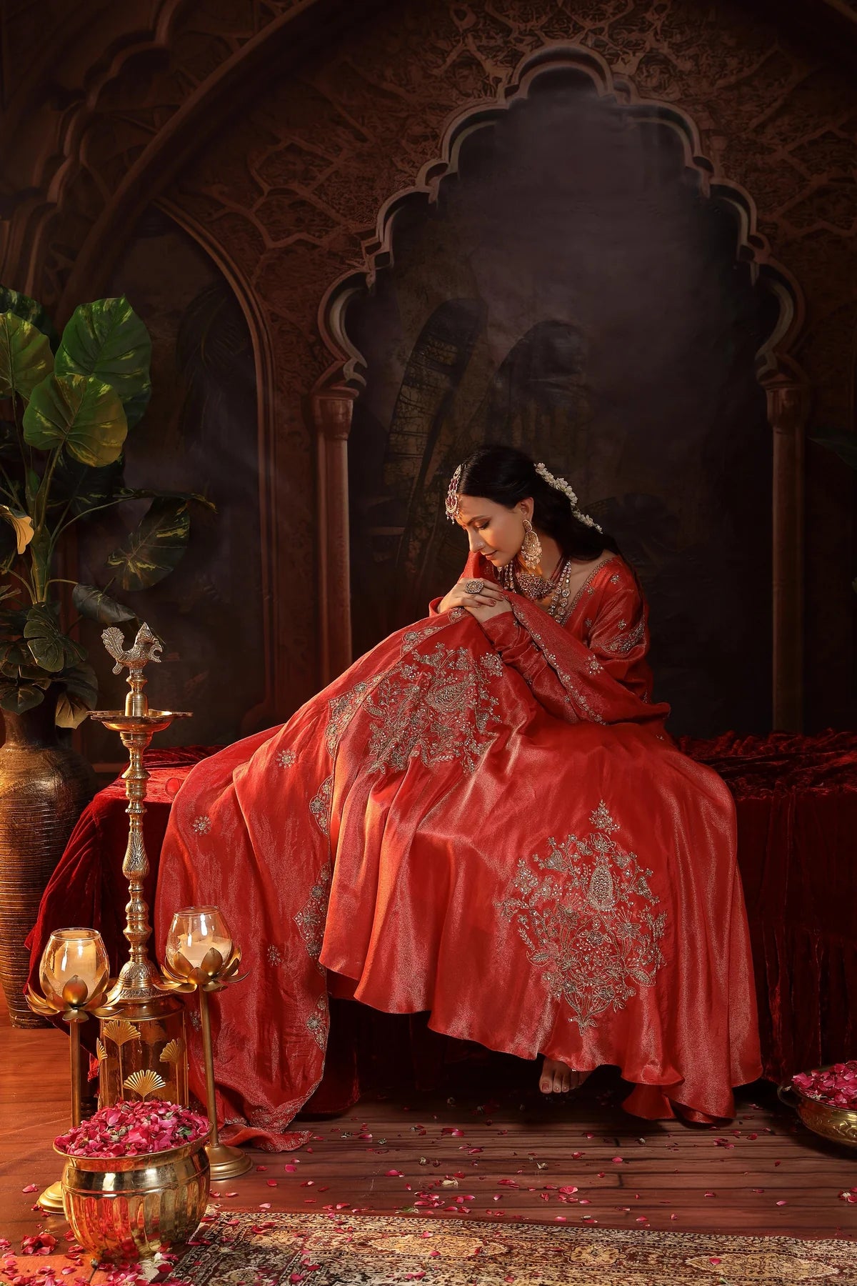 The stunning red Anarkali is the epitome of regal charm and elegance. The Anarkali features a glass-shaped neckline, beautifully accentuated with intricate Zardozi embroidery and delicate booties on the yoke and churidar sleeves, adding a luxurious touch to the design. The ghera of the Anarkali is further enhanced with three embroidered motifs, placed asymmetrically for a striking visual effect that creates a sense of movement and grandeur.