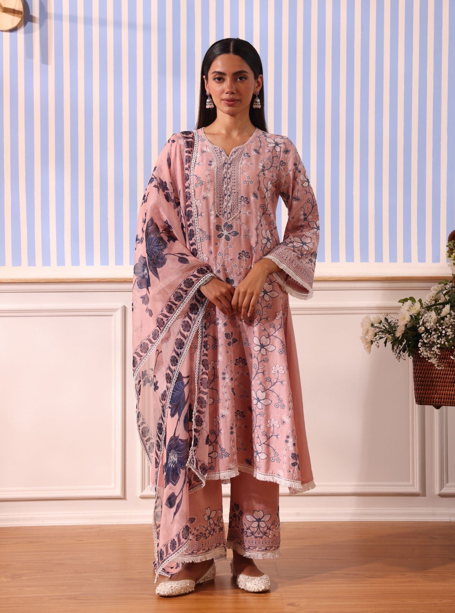 A poetic ode to florals, this blush pink kurta set is a delicate blend of elegance and ease. Adorned with bold navy and lilac botanical prints, accentuated with embroidery, the kurta features a relaxed silhouette with a notched neckline and fine lace-trim detailing that frames the yoke and sleeves. Paired with straight pants and a matching dupatta with dainty lace edges and bordered with florals, this ensemble is effortlessly graceful. The fluidity of the fabric and the harmony of color make it a charming pick for day gatherings, festive brunches, or intimate celebrations.