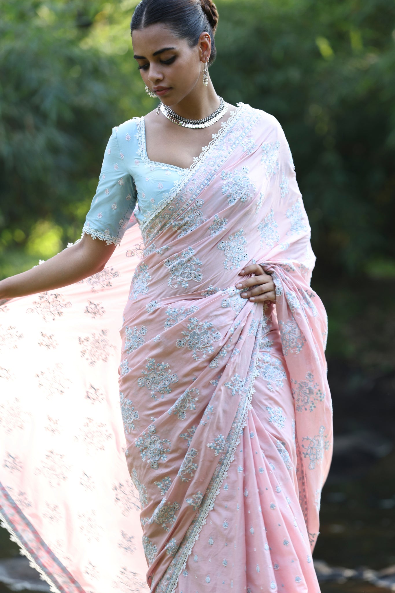 A poetic symphony of elegance and grace, this pastel pink saree is a dream woven in delicate threads. Crafted from a breezy, lightweight cotton, it drapes effortlessly, ensuring comfort without compromising on sophistication. The saree is adorned with intricate floral embroidery. A scalloped lace border frames the silhouette, and is paired with a contrasting blue unstitched blouse piece.