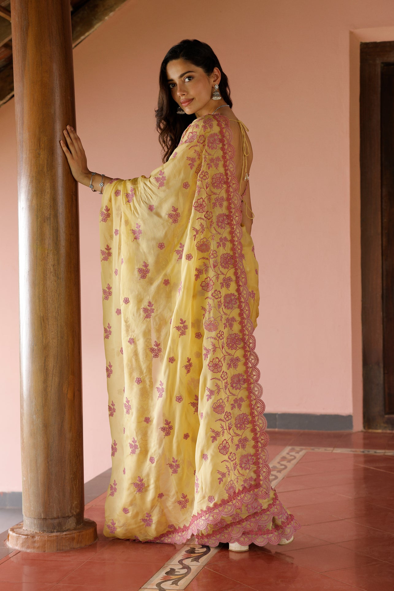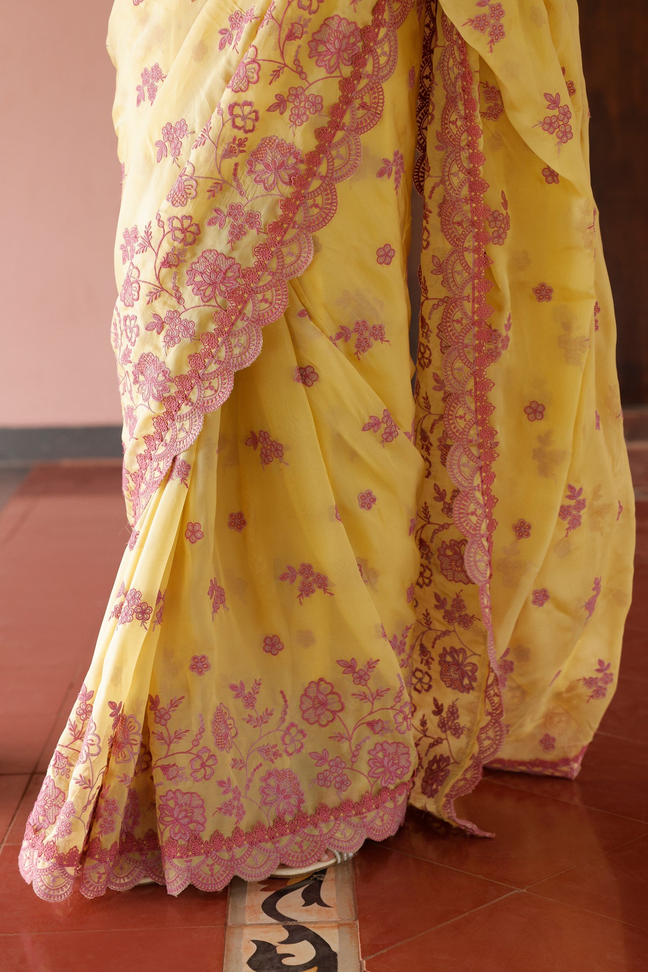 Drenched in the warm glow of sunshine, this mustard yellow saree is a masterpiece of effortless elegance. Crafted from a delicate, flowy organza, it drapes beautifully. The saree is adorned with intricate floral embroidery in a rich pink, creating a striking contrast against the pastel base. The meticulously embroidered border, featuring elaborate floral vines and intricate detailing, enhances the saree’s traditional appeal. Paired with an unstitched blouse piece.