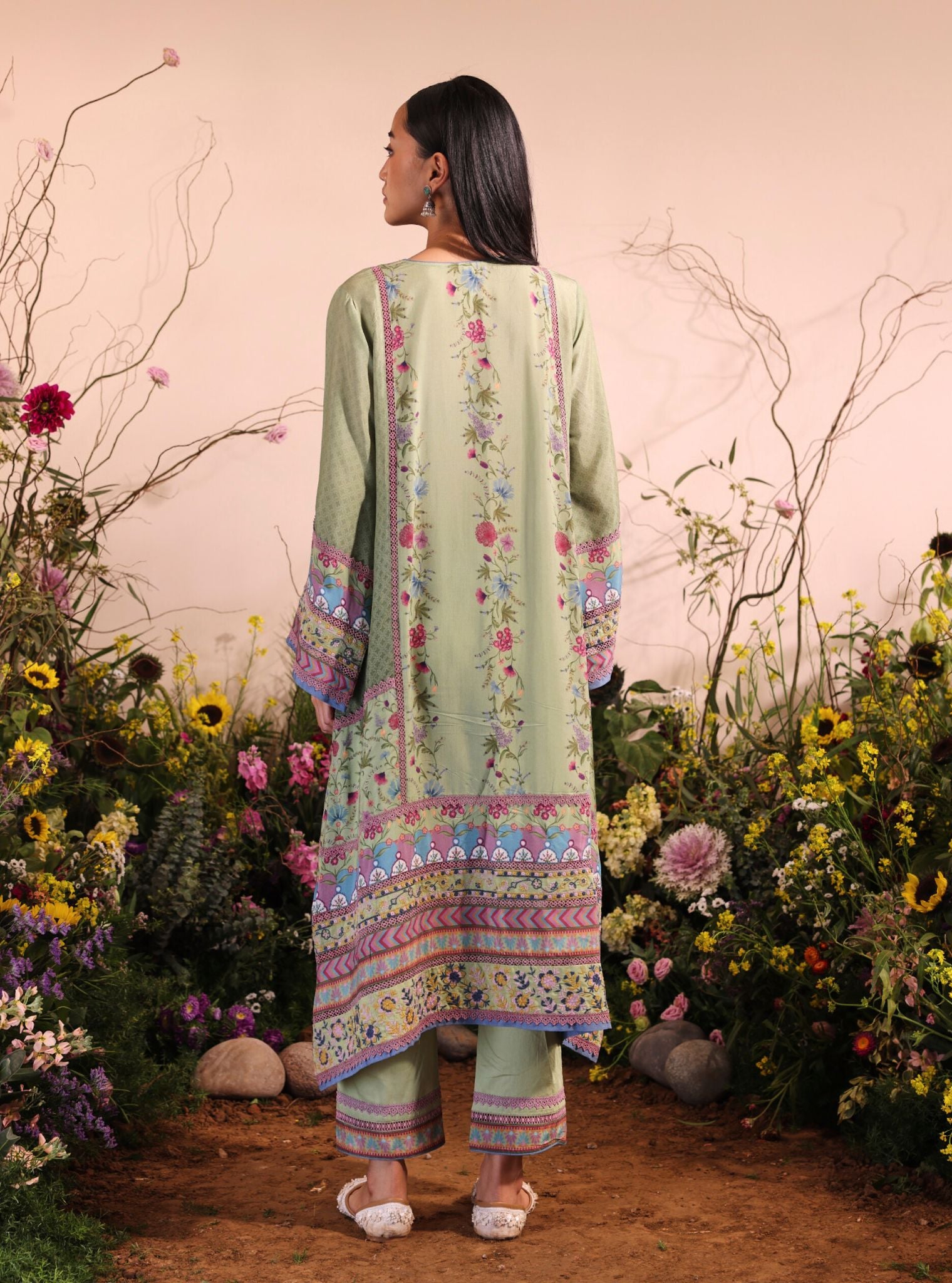 Inspired by the tranquility of blooming meadows, this sage green kurta set is a tribute to nature’s quiet beauty. The kurta features intricate floral and geometric motifs in tones of lavender, coral, and blue, lending it a touch of folk artistry. A V-neckline and wide sleeves edged with ornate borders add charm to its relaxed silhouette.
