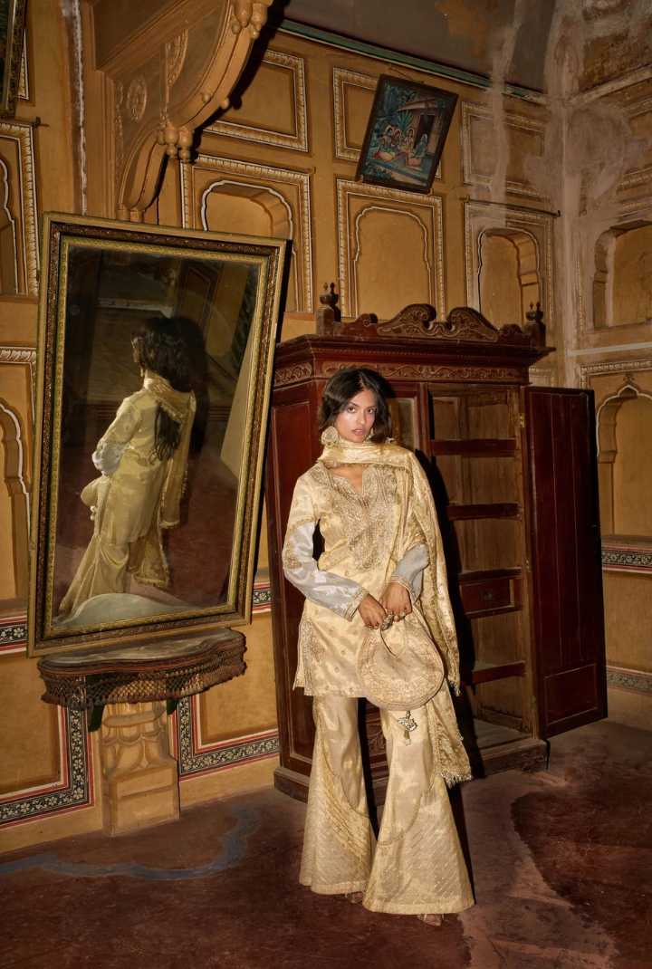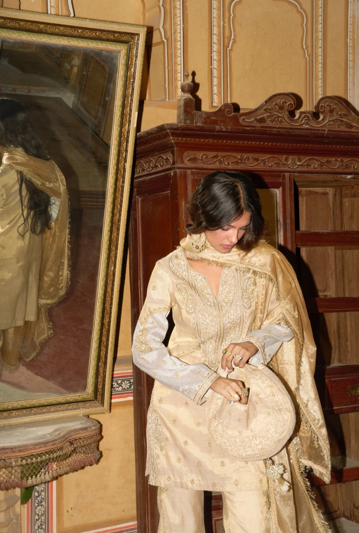 In a Champagne gold glow, this pure tissue straight pant set exudes understated elegance, featuring intricate detailing and rich gota patti textures. Paired with a finely embroidered short kurta and a vibrant monicromatic dupatta adorned with delicate threadwork, shimmering dori, and subtle sequins, the ensemble reflects a refined blend of tradition and modern grace.