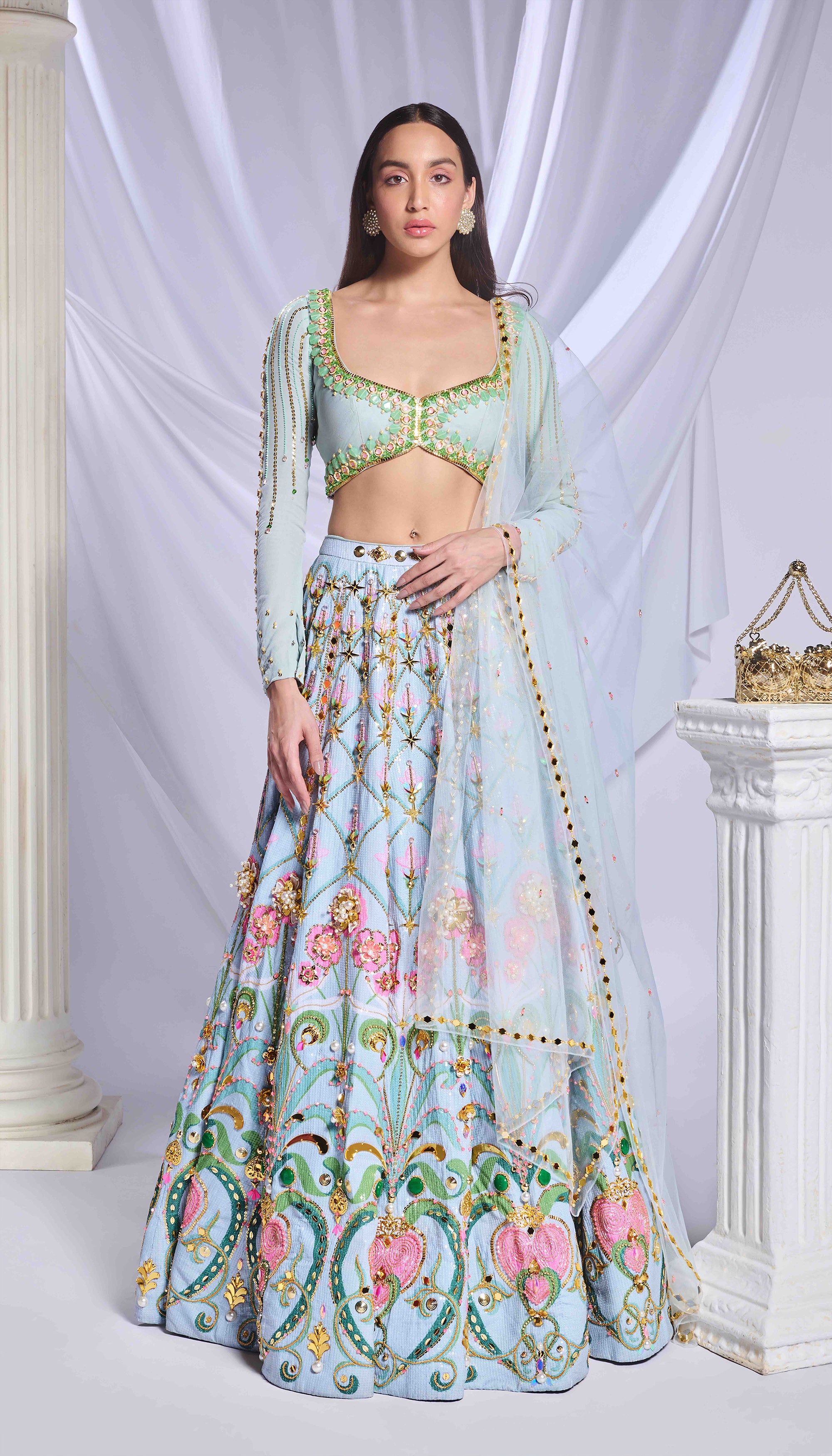 Like a breath of fresh air, our ice blue sequin-printed lehenga comes with pockets! Adorned with opulent gold embellishments, pearls, crystals and 3D flowers. Paired with a full-sleeve embroidered blouse with pearls, crystals, pink enamelled drops and glass stones along with a matching tulle dupatta filled with acrylics, crystals and a pearl border.