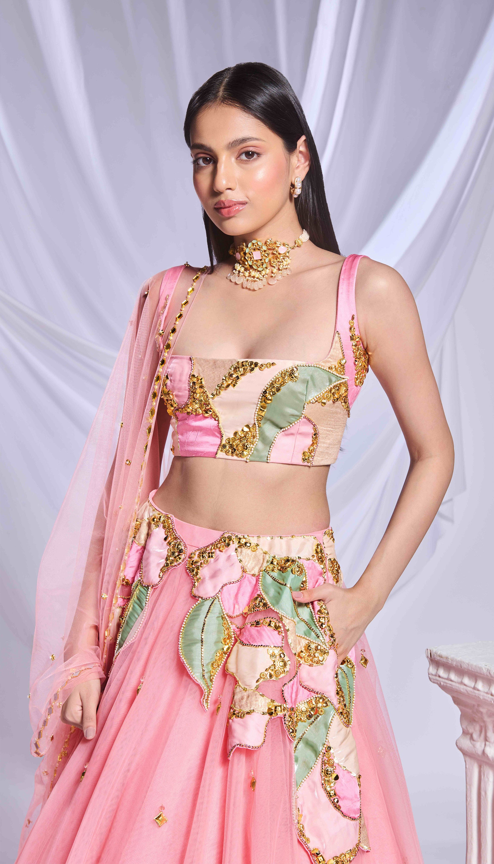 Our pink tulle lehenga is adorned with intricate patchwork embroidery and metallic accents cascading from the waist to the hips. The lehenga is embellished with scatter embroidery, featuring gold elements and delicate pink crystals throughout. Completing the ensemble is a sleeveless pink blouse featuring matching patchwork.