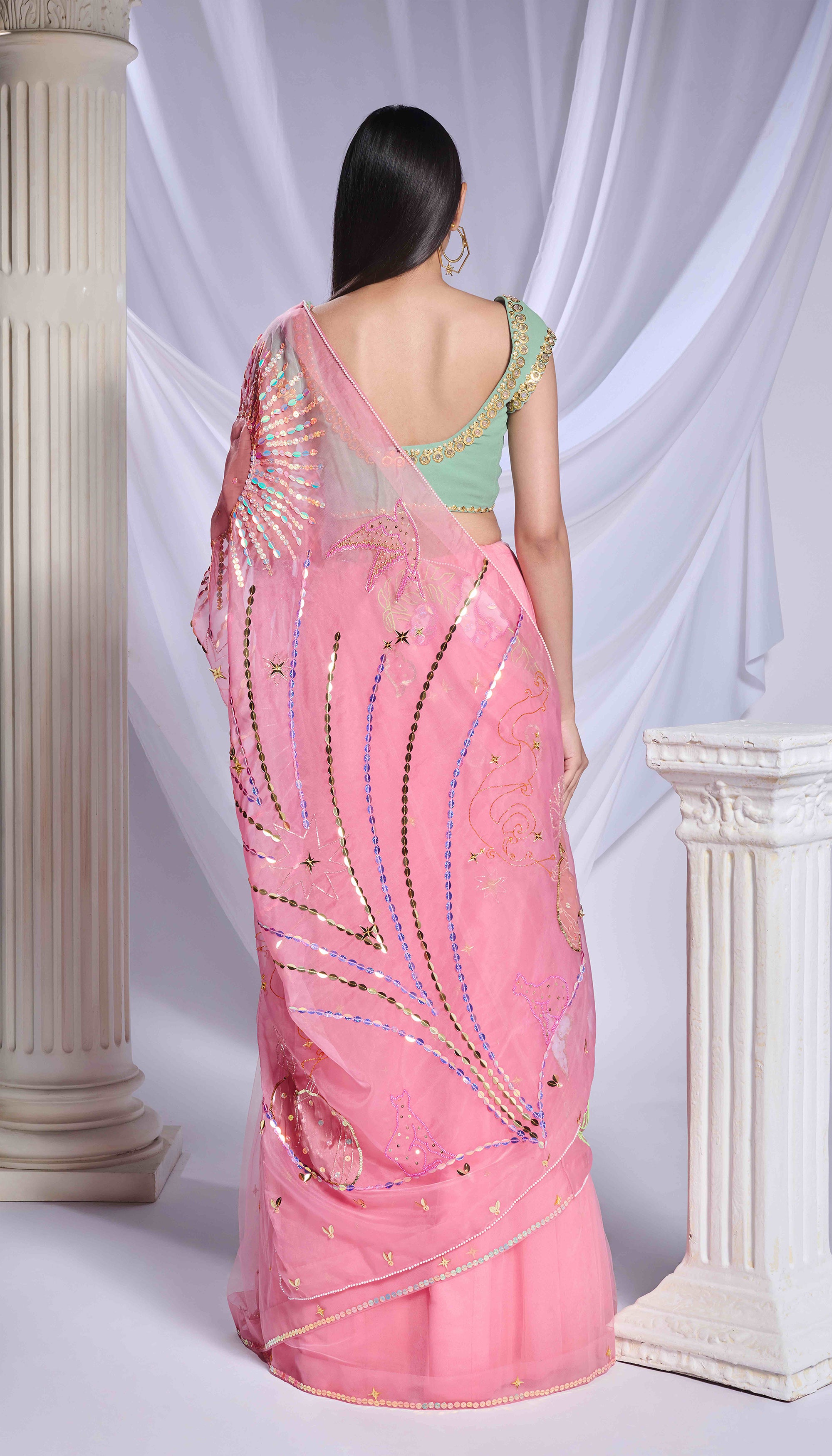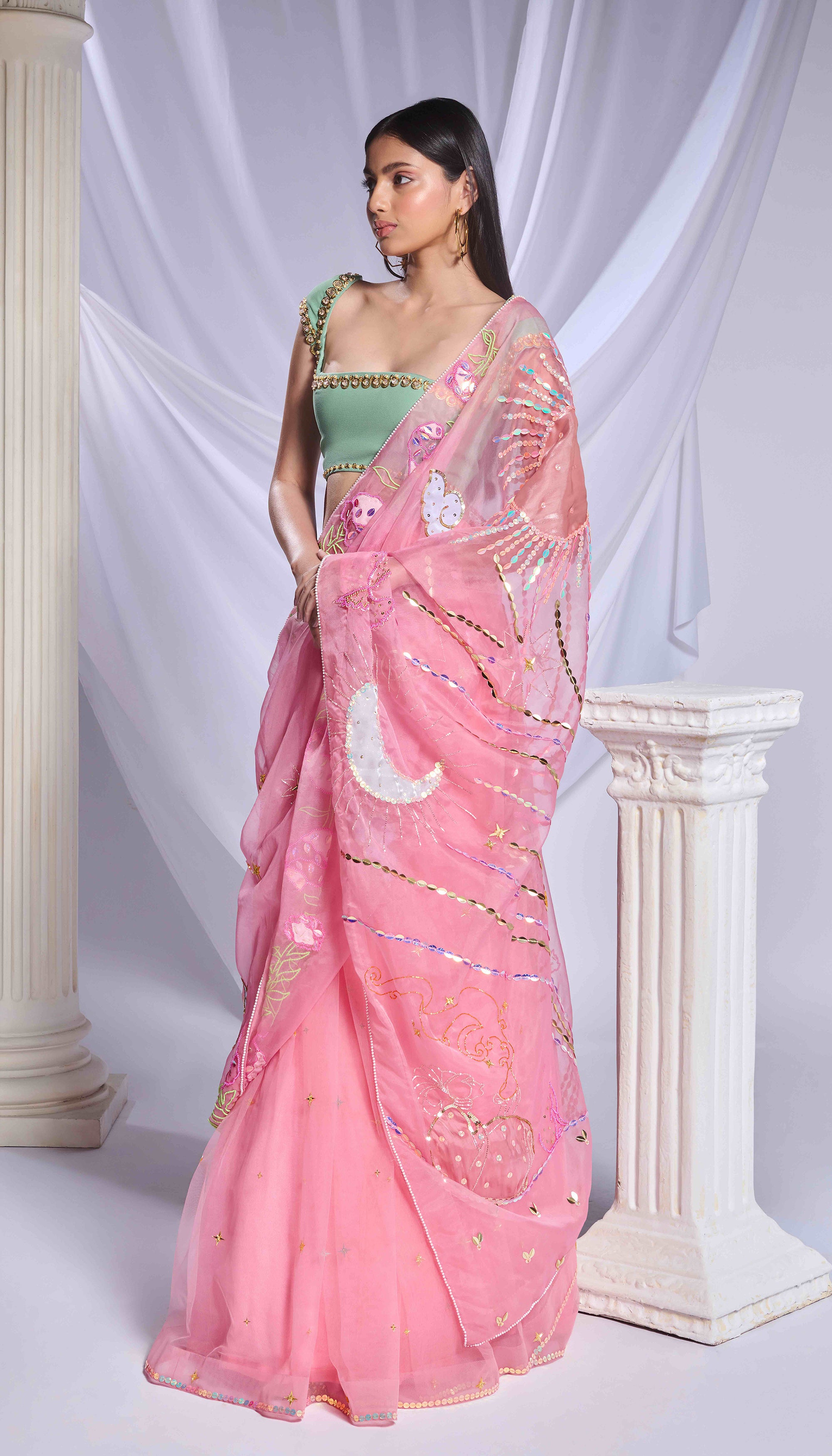 Introducing our rose pink saree, artfully crafted from a blend of organza and tulle. It showcases vibrant embroidery in fabric patchwork, sequins, acrylics, and cut dana detailing, depicting a picturesque story featuring birds, sun, and moon motifs. The saree is elegantly finished with a delicate pearl border. The pre-stitched tulle bottom is adorned with scattered acrylic stars. Completing the ensemble is a moss green georgette blouse, adorned with gold embroidery and pink crystals.