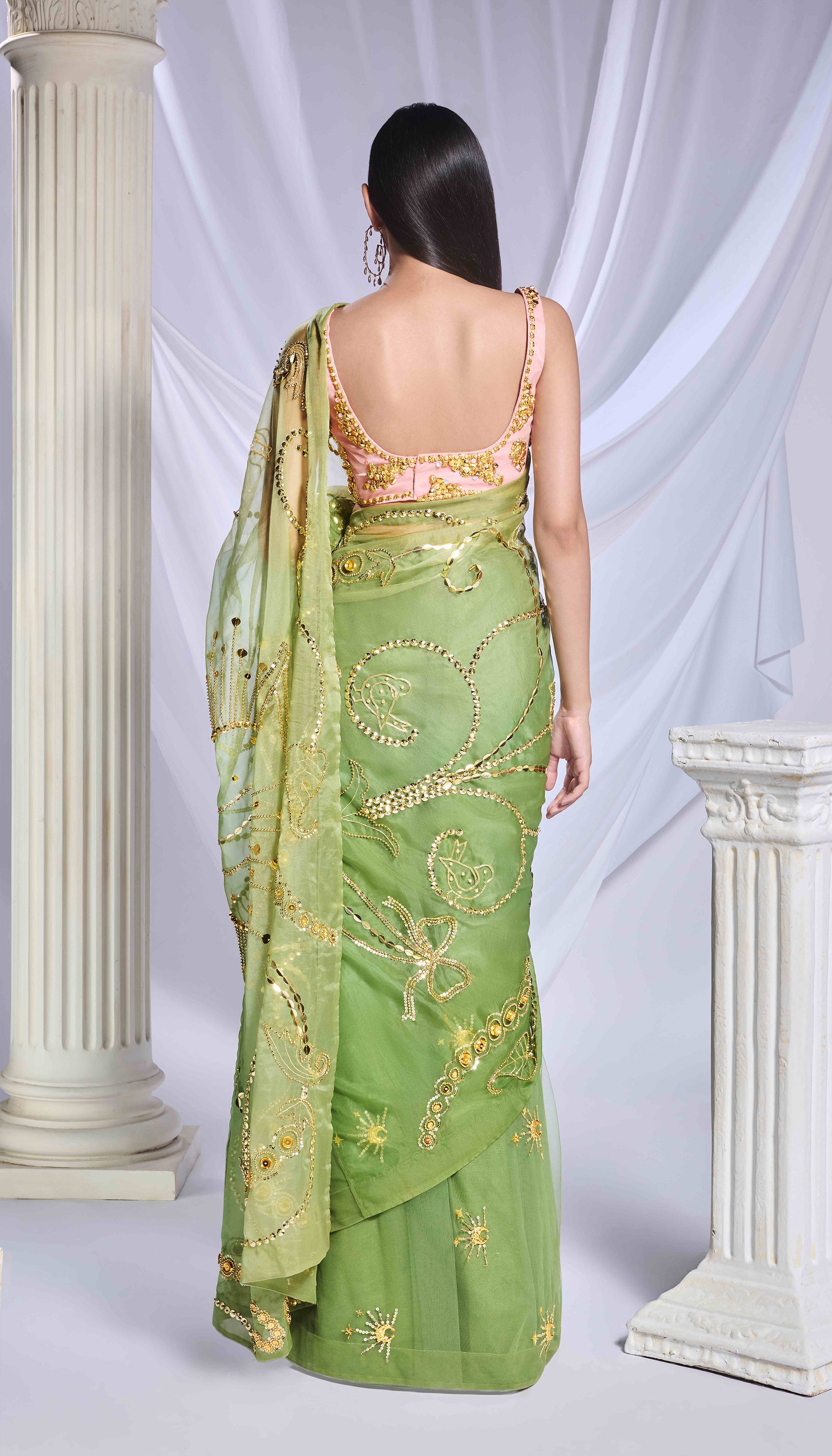 Introducing our moss green shaded saree, skillfully crafted from a blend of organza and tulle. The organza pallu is adorned with intricate gold embroidery, incorporating sequins, cut dana detailing, and gold metallics that narrate a charming tale with elements like flowers, butterflies, and hearts. The pre-stitched tulle bottom features scattered detailing with motifs of moons and stars. Completing the ensemble is a rose pink blouse featuring a straight neckline, adorned with elaborate golden chunky abstract embroidery and delicate pearls for added elegance..