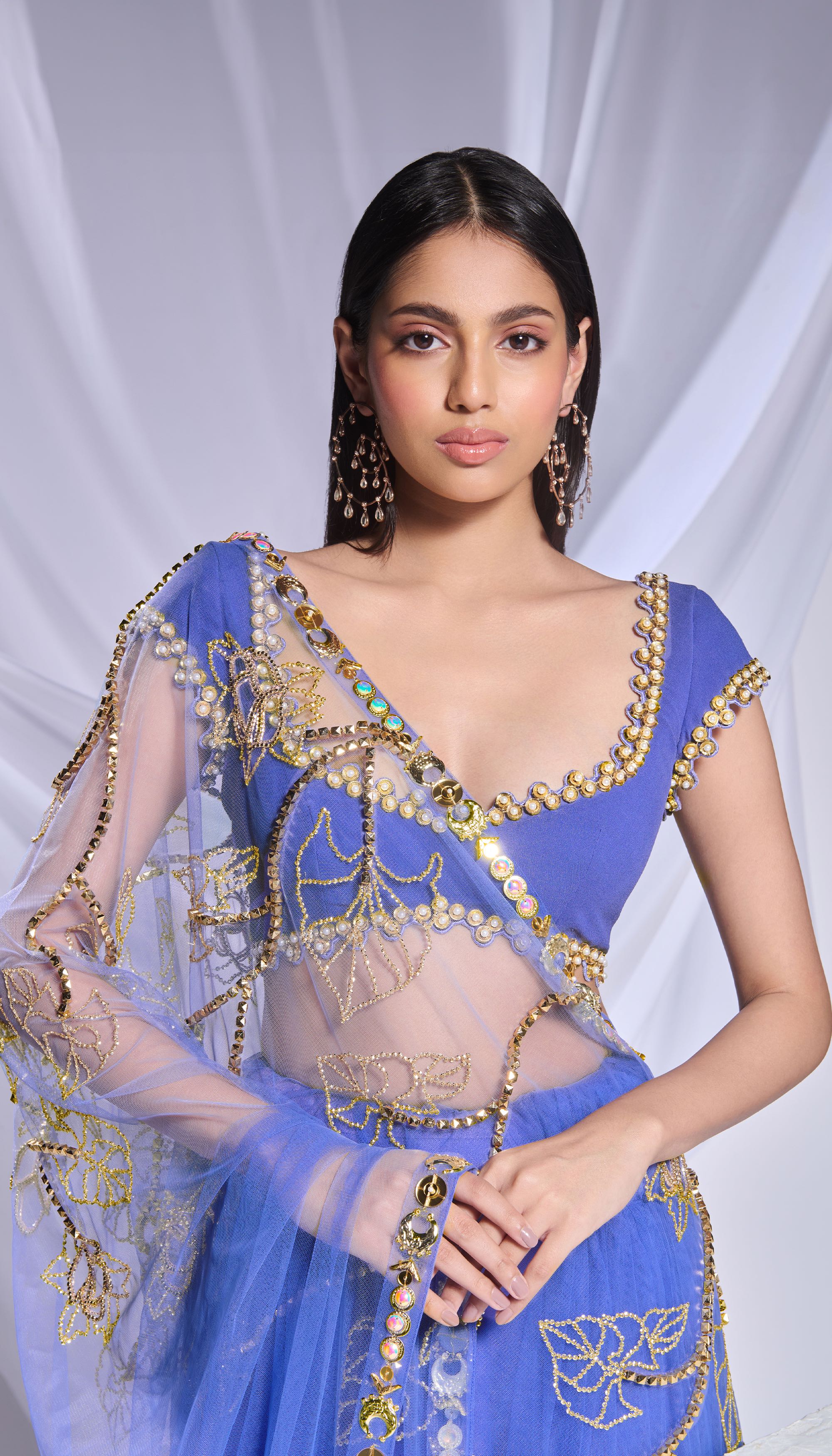 Crafted with meticulous detailing, this deep blue organza saree is richly adorned with metallic accents, crystals, and sequins forming floral patterns while the pre-stitched tulle bottom features delicate scattered embroidery. Complementing the ensemble, the blue georgette blouse is detailed with metal circles, pearls embroidery, and intricate cutwork.