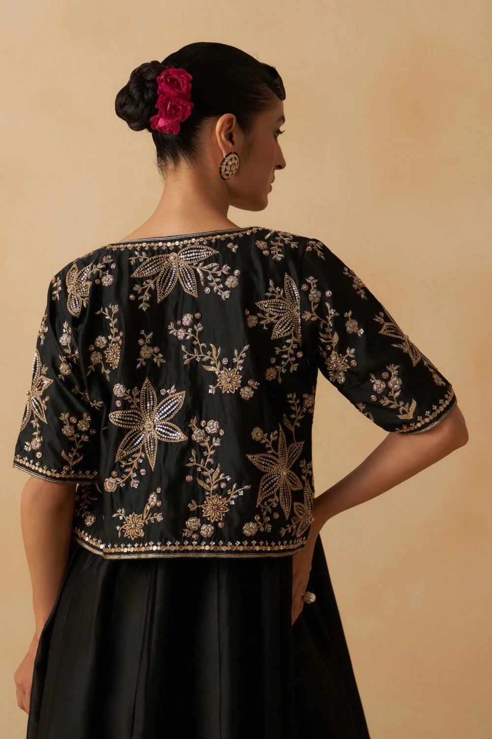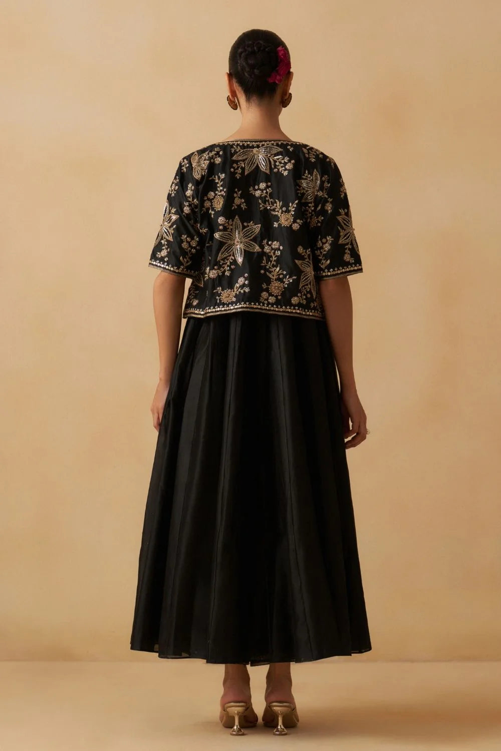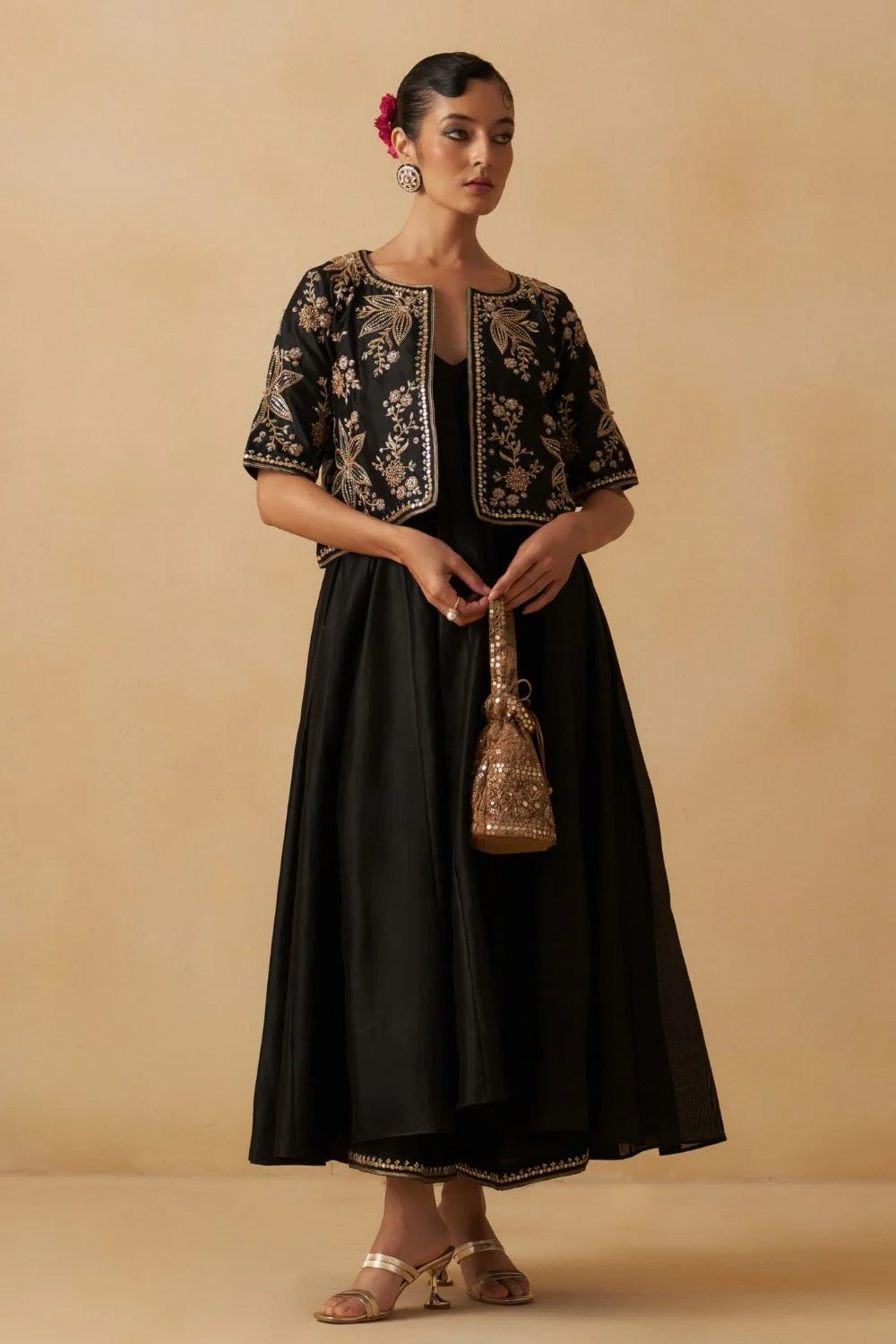 Elbow length jacket highlighted with exquisite floral embroidery, paired with A-line anarkali dress and palazzo.