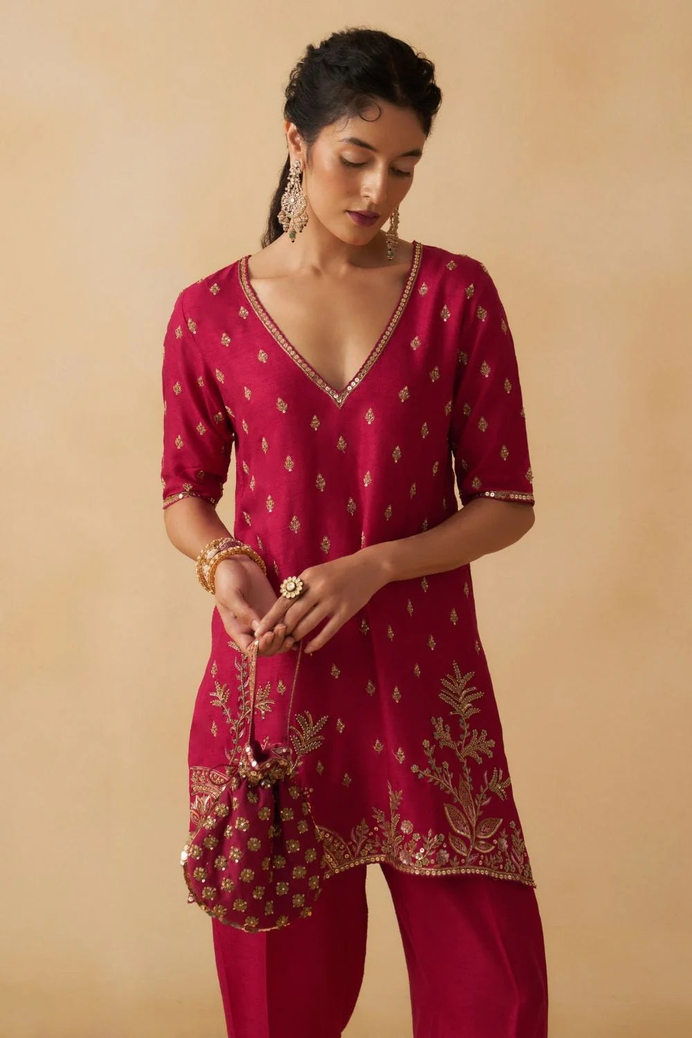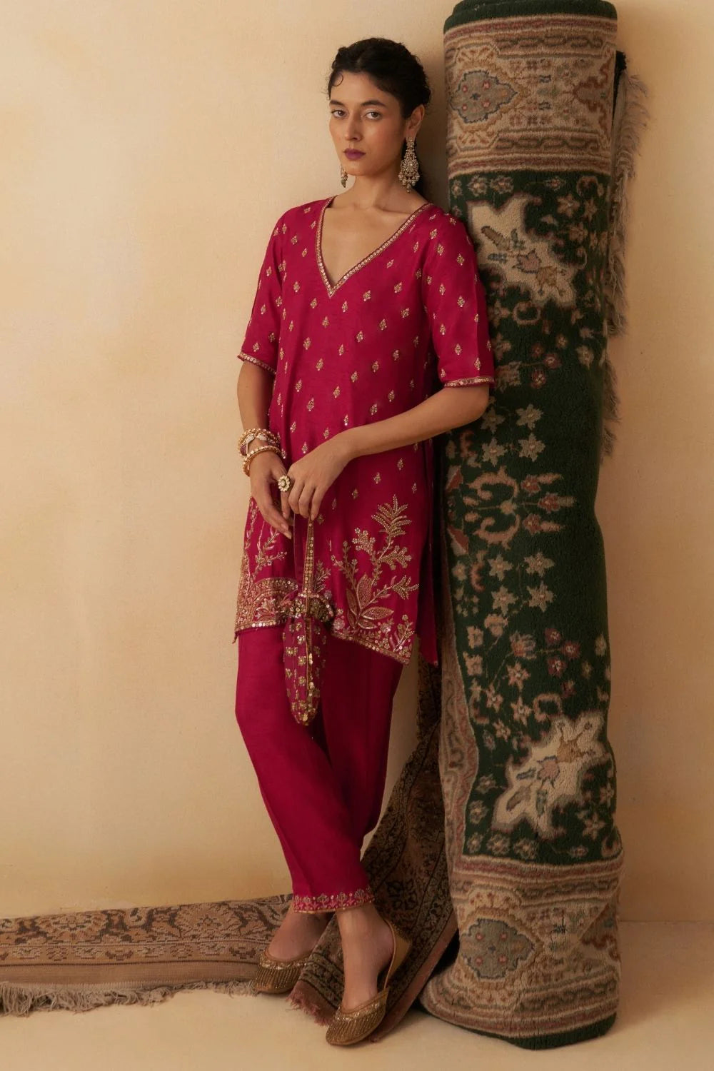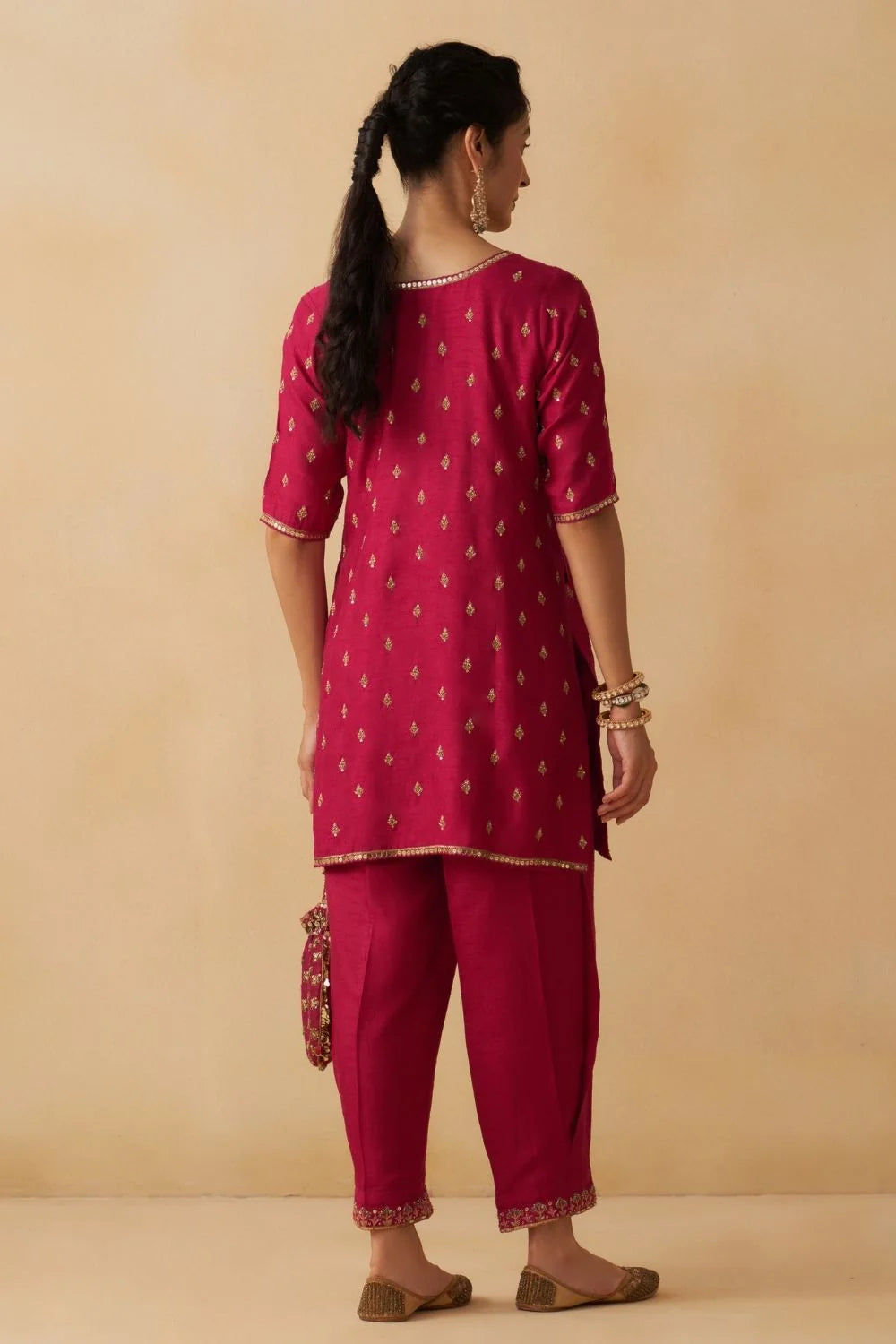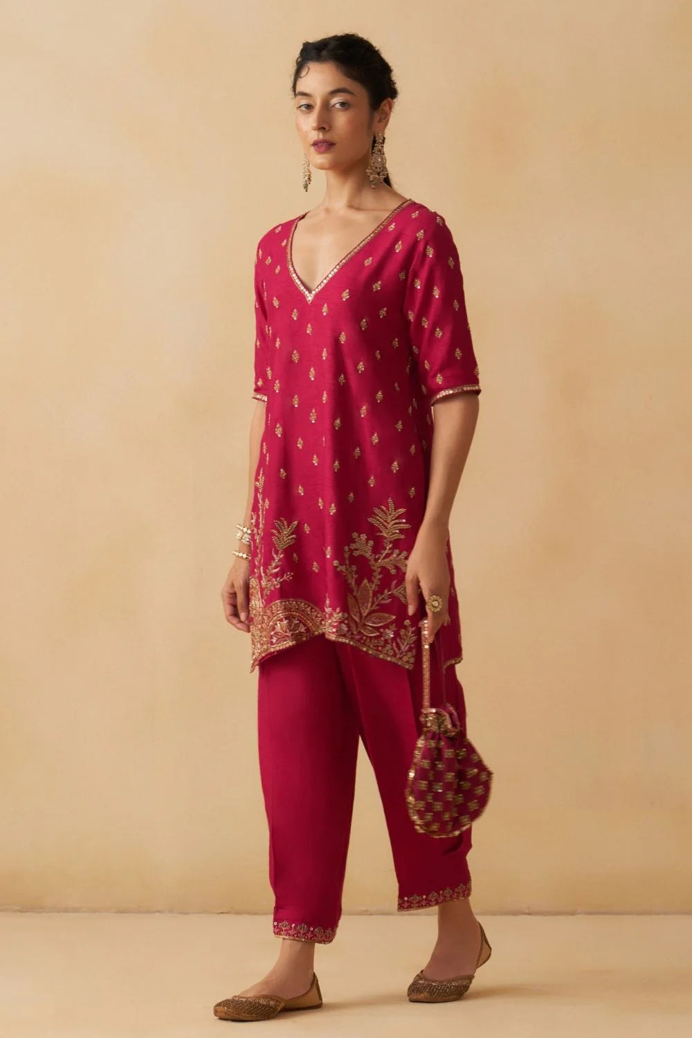 A V-neck short kurti with zardosi embroidery on the hemline, paired with a matching salwar.