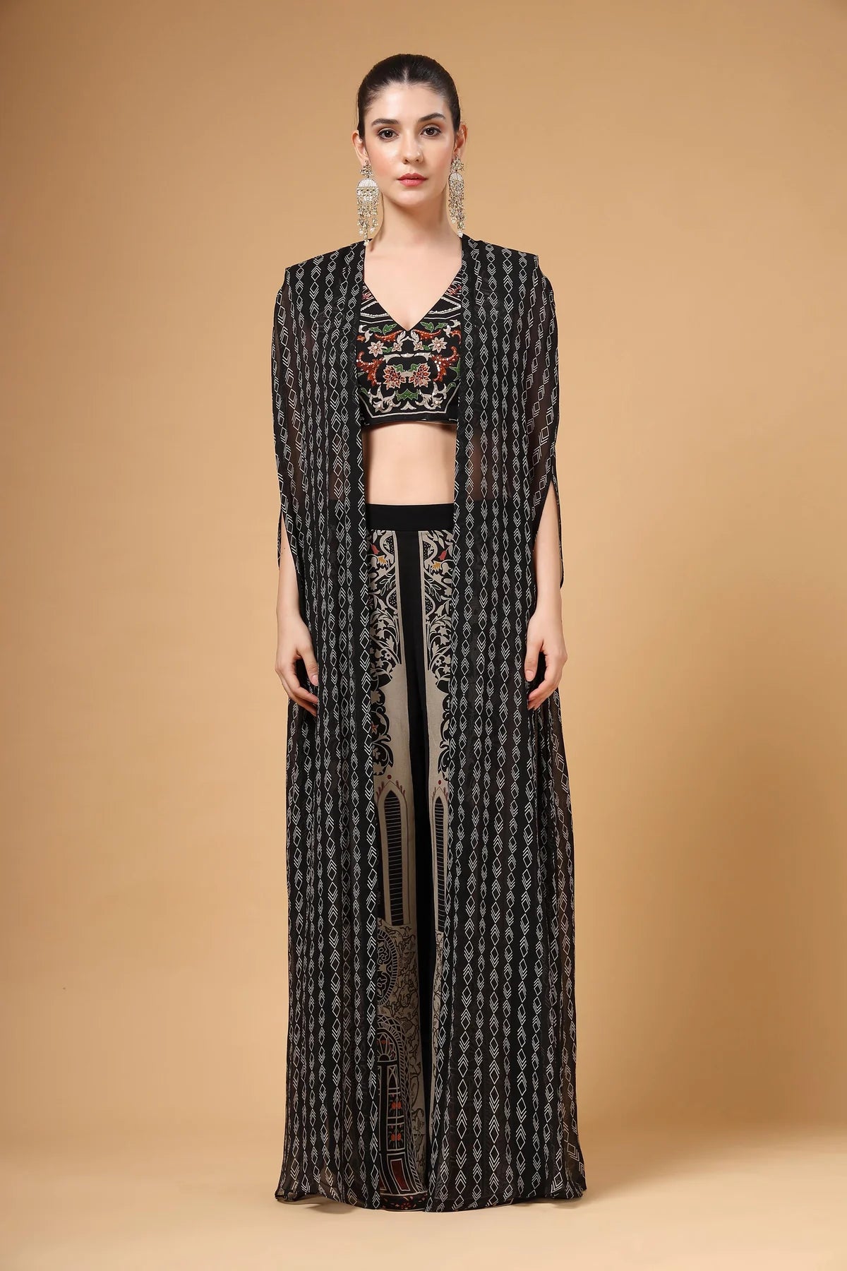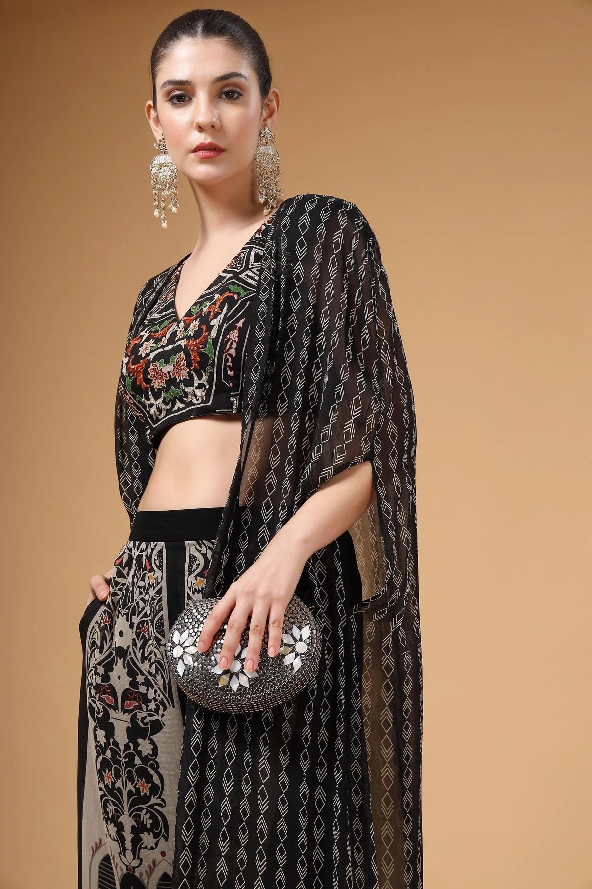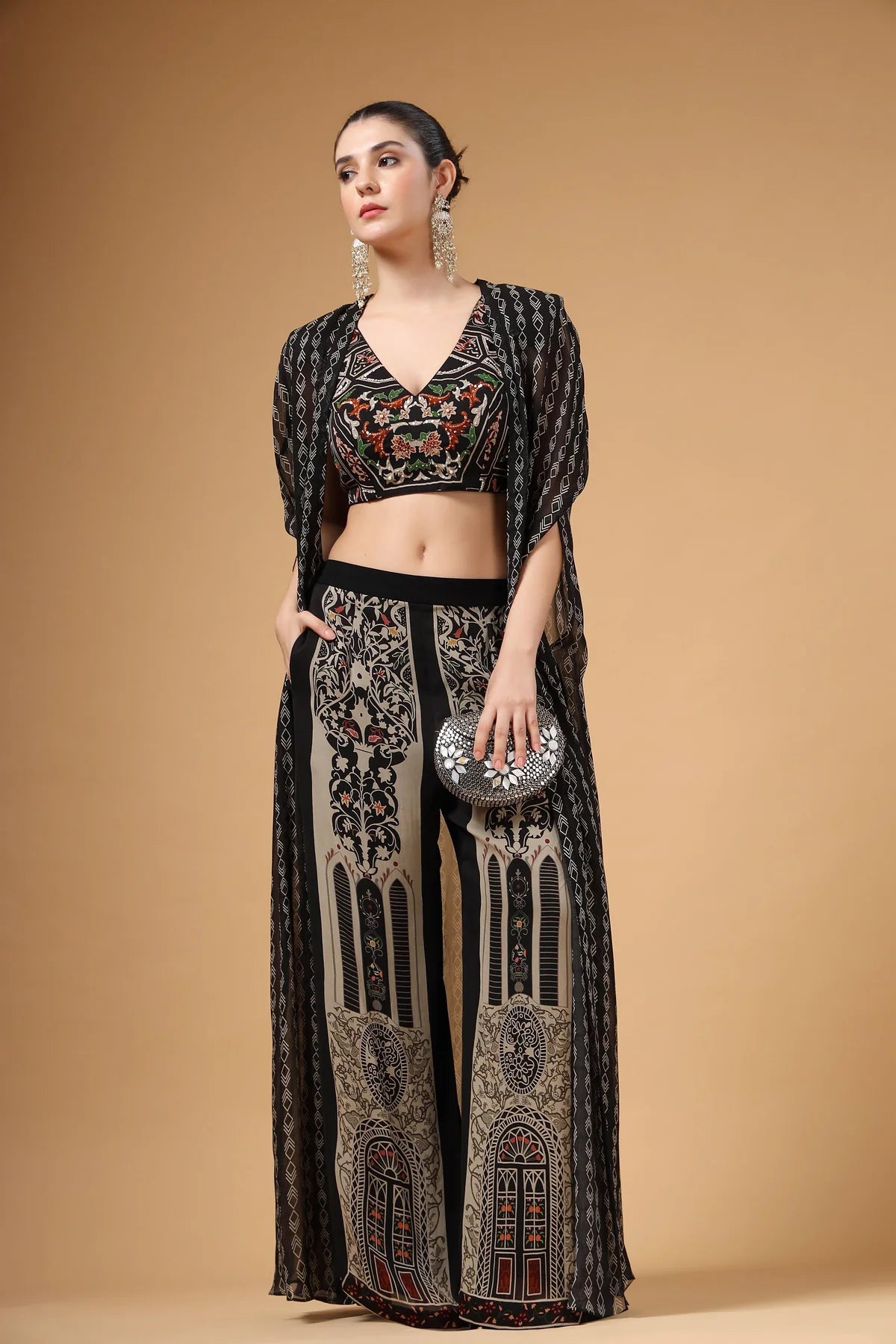 A beautiful printed cape set featuring a stylish blouse and flowy palazzo pants, paired with a statement cape. The breezy silhouette and vibrant prints make this ensemble both comfortable and fashionable—perfect for festive gatherings, destination weddings, or evening soirées where you want to stand out with effortless elegance.