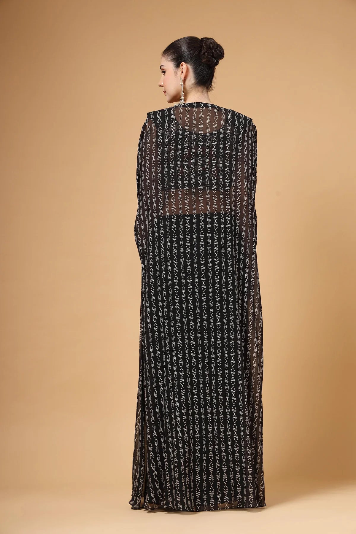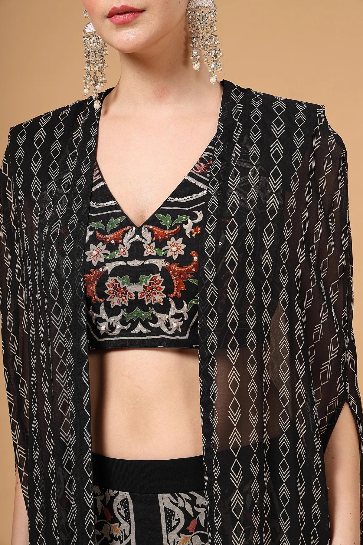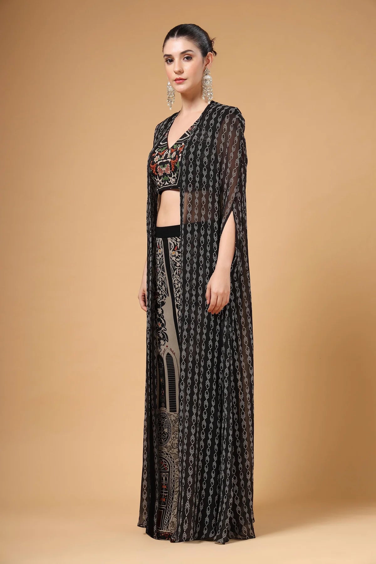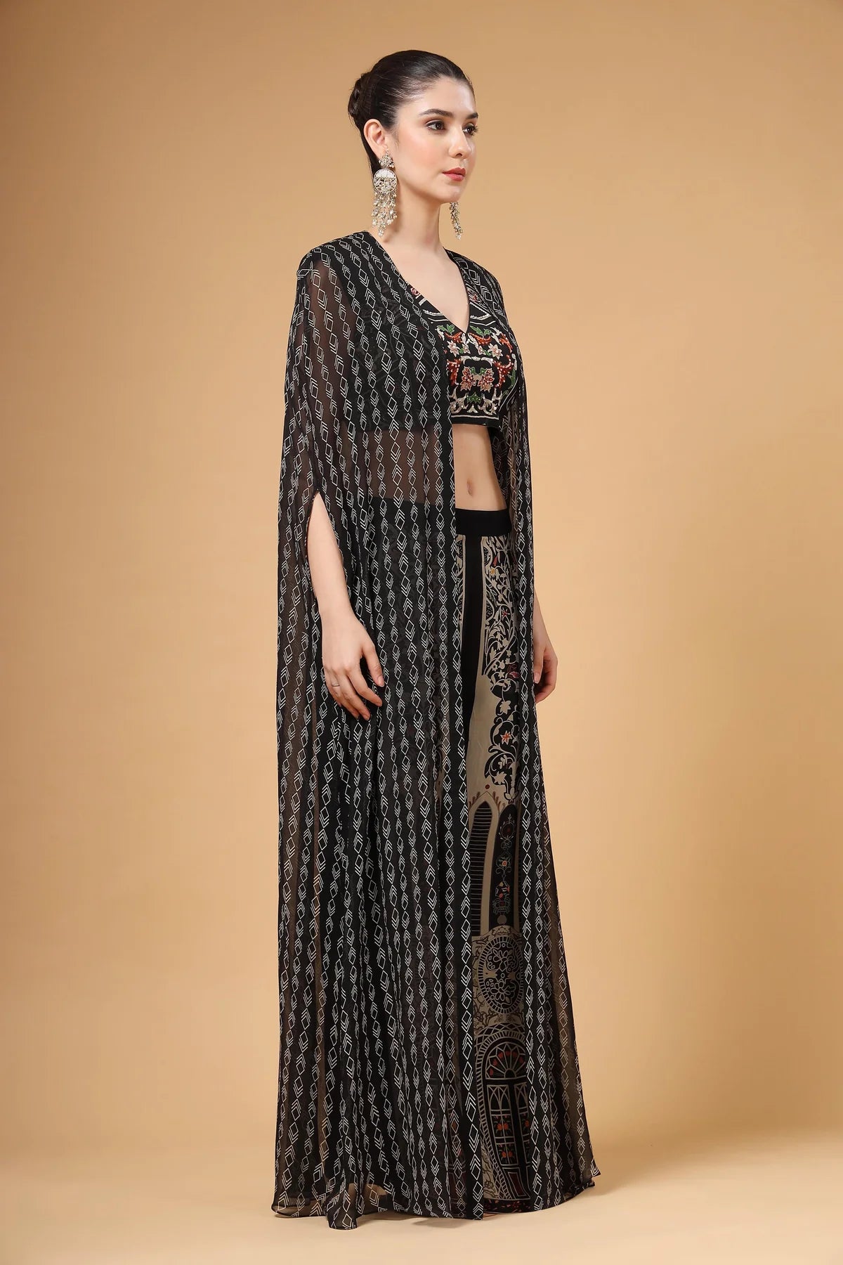 A beautiful printed cape set featuring a stylish blouse and flowy palazzo pants, paired with a statement cape. The breezy silhouette and vibrant prints make this ensemble both comfortable and fashionable—perfect for festive gatherings, destination weddings, or evening soirées where you want to stand out with effortless elegance.
