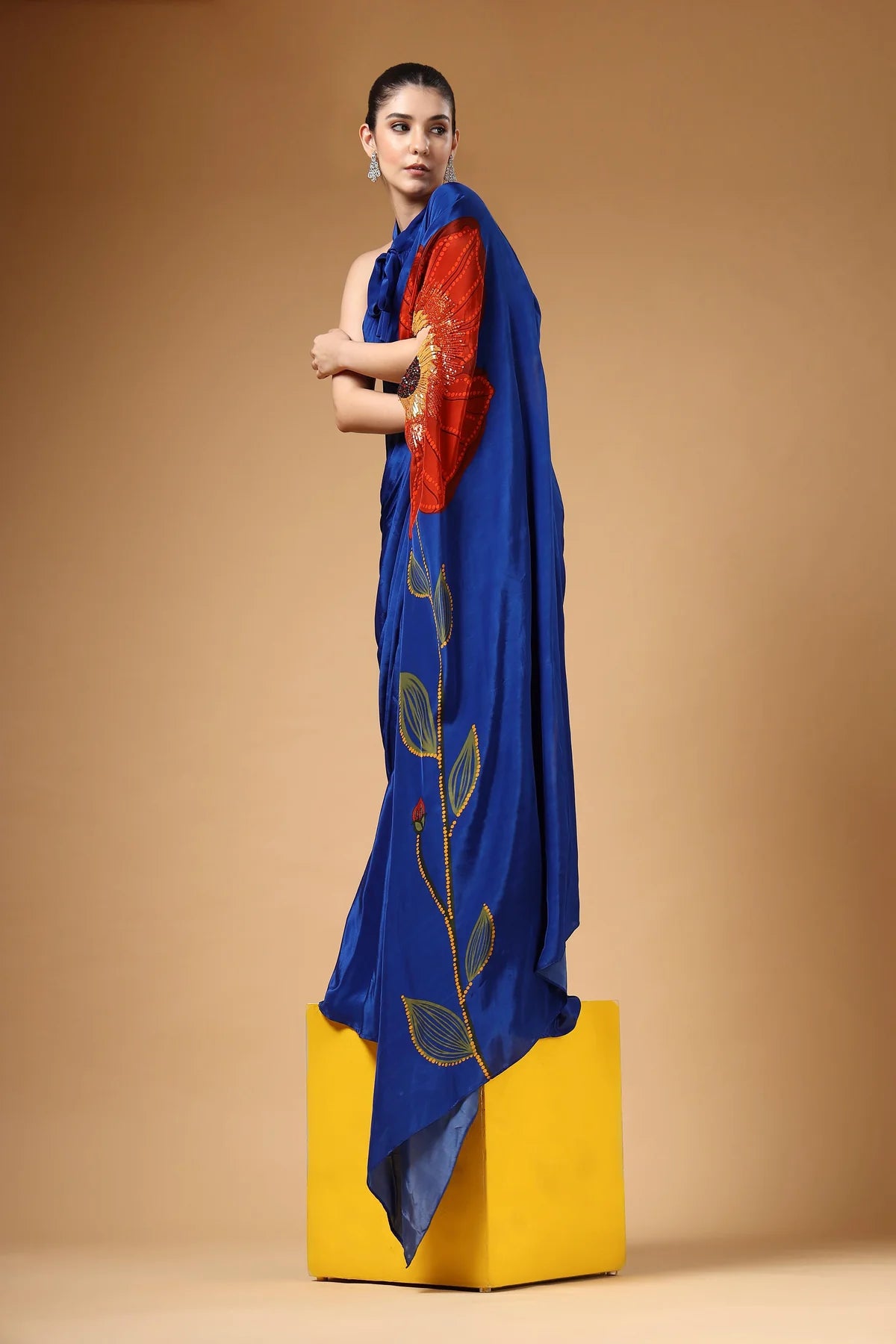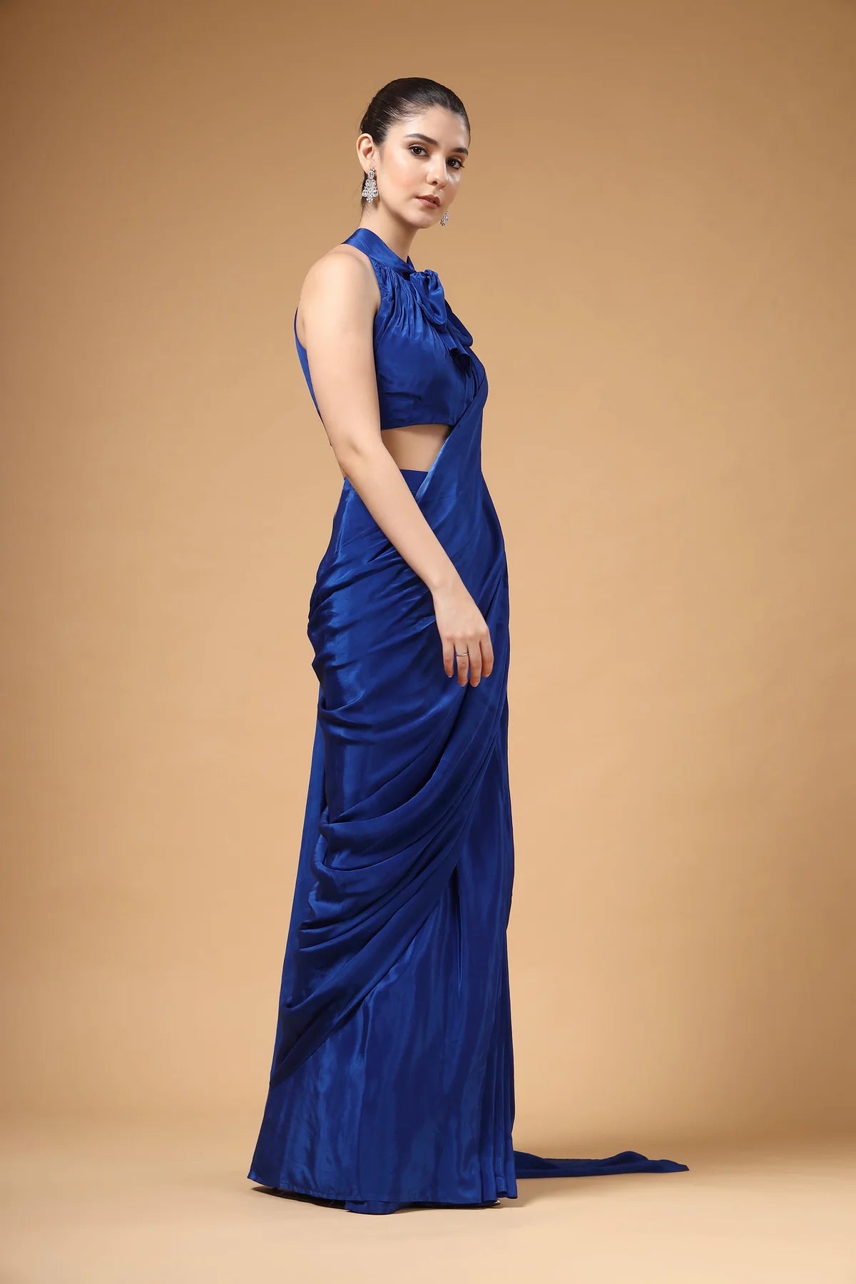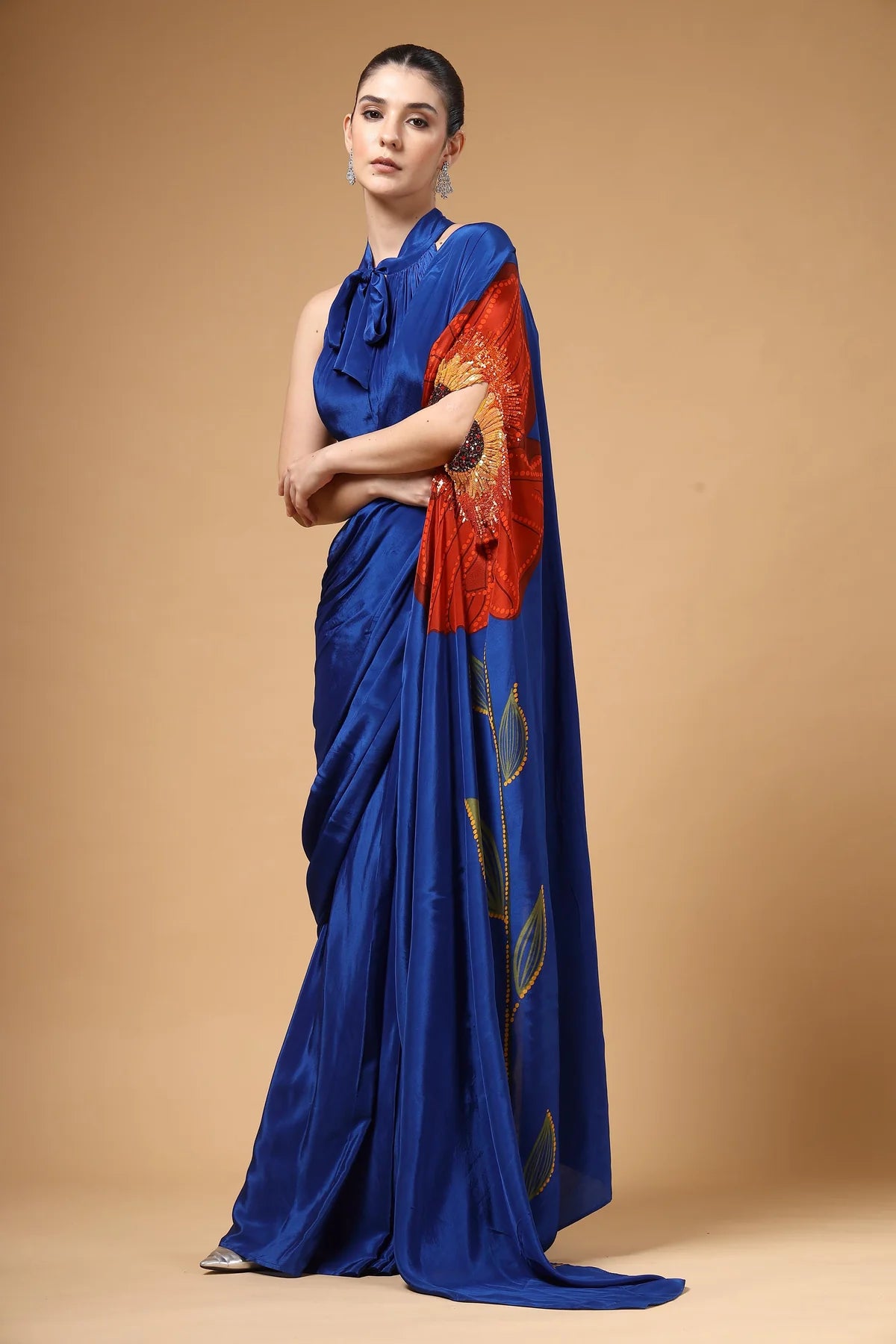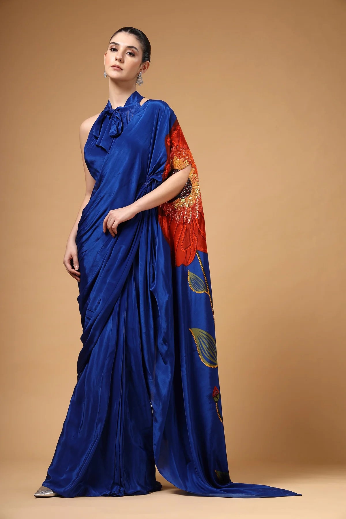 A chic halter-neck blouse accented with a ribbon tie detail, paired with a pre-draped saree that features a striking oversized embroidered flower on the pallu. Lightweight and effortlessly stylish, this design blends modern elegance with timeless charm — perfect for any occasion and destined to make you stand out in the crowd.