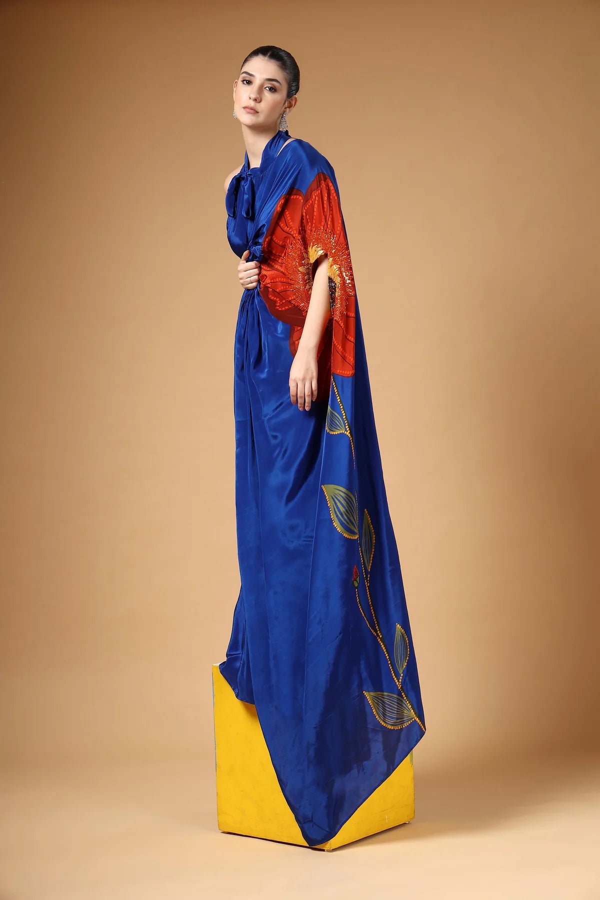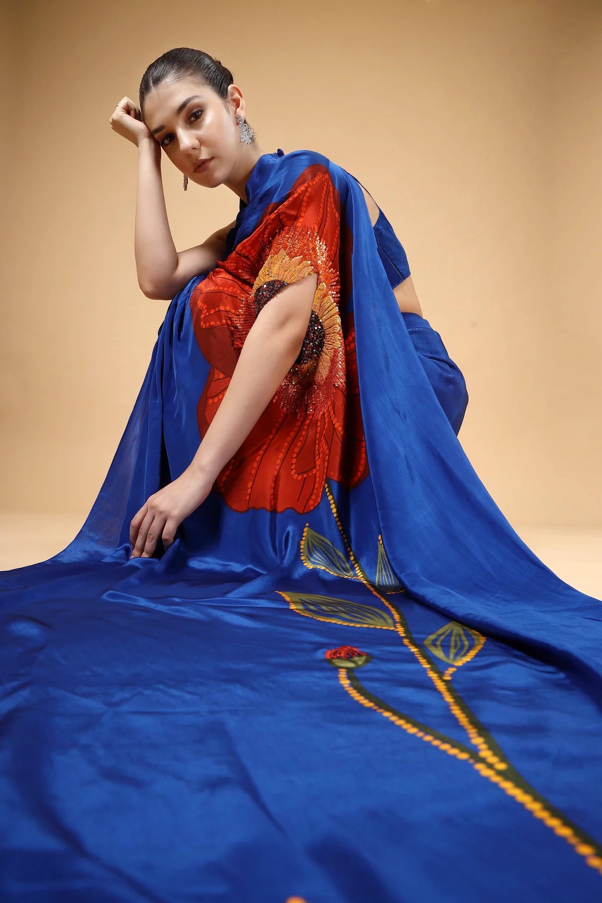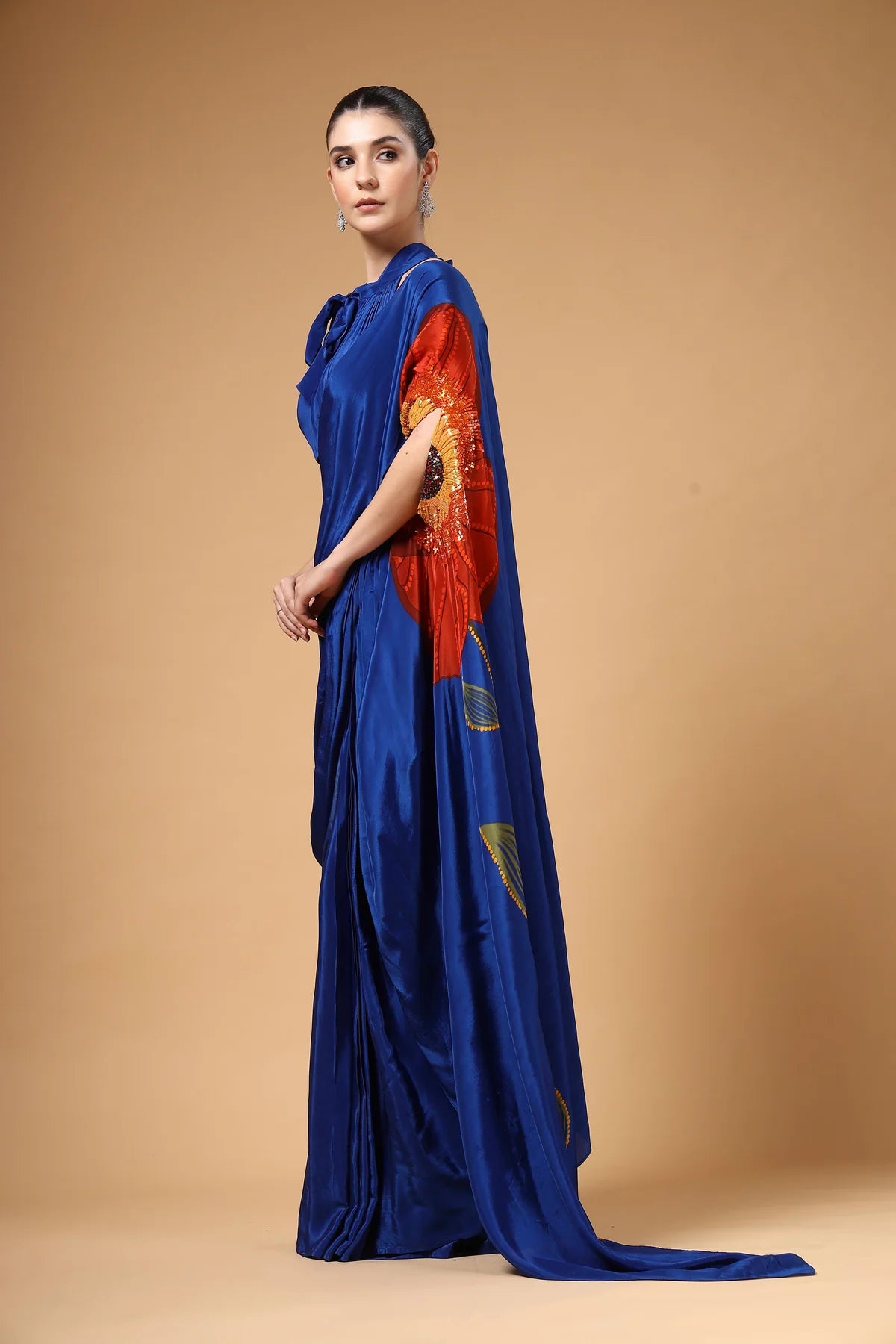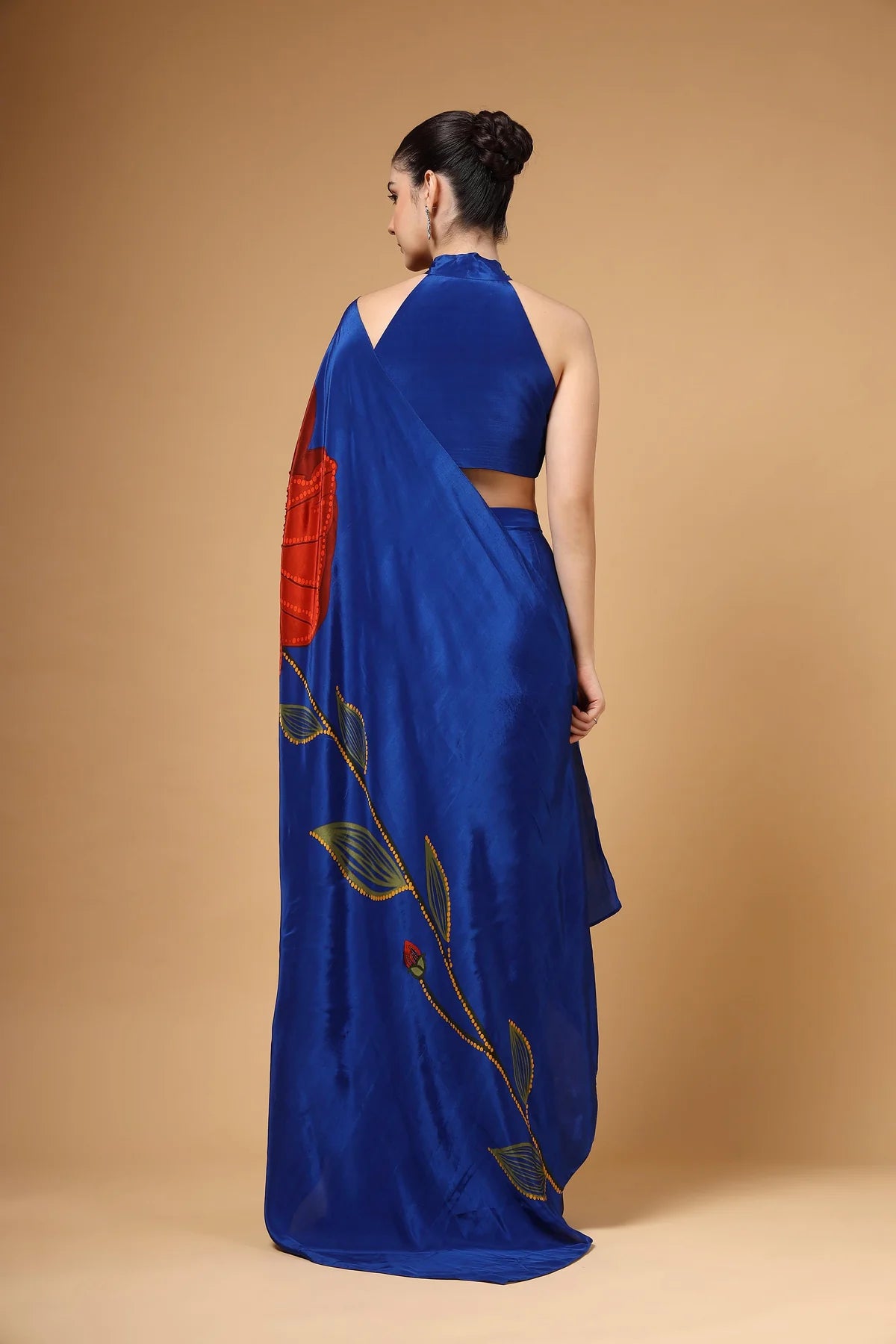 A chic halter-neck blouse accented with a ribbon tie detail, paired with a pre-draped saree that features a striking oversized embroidered flower on the pallu. Lightweight and effortlessly stylish, this design blends modern elegance with timeless charm — perfect for any occasion and destined to make you stand out in the crowd.
