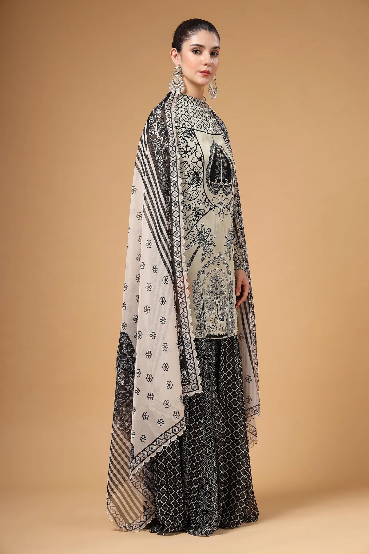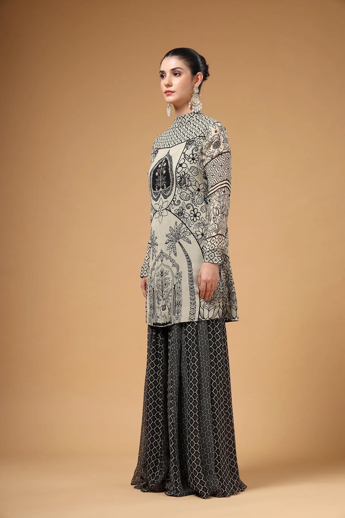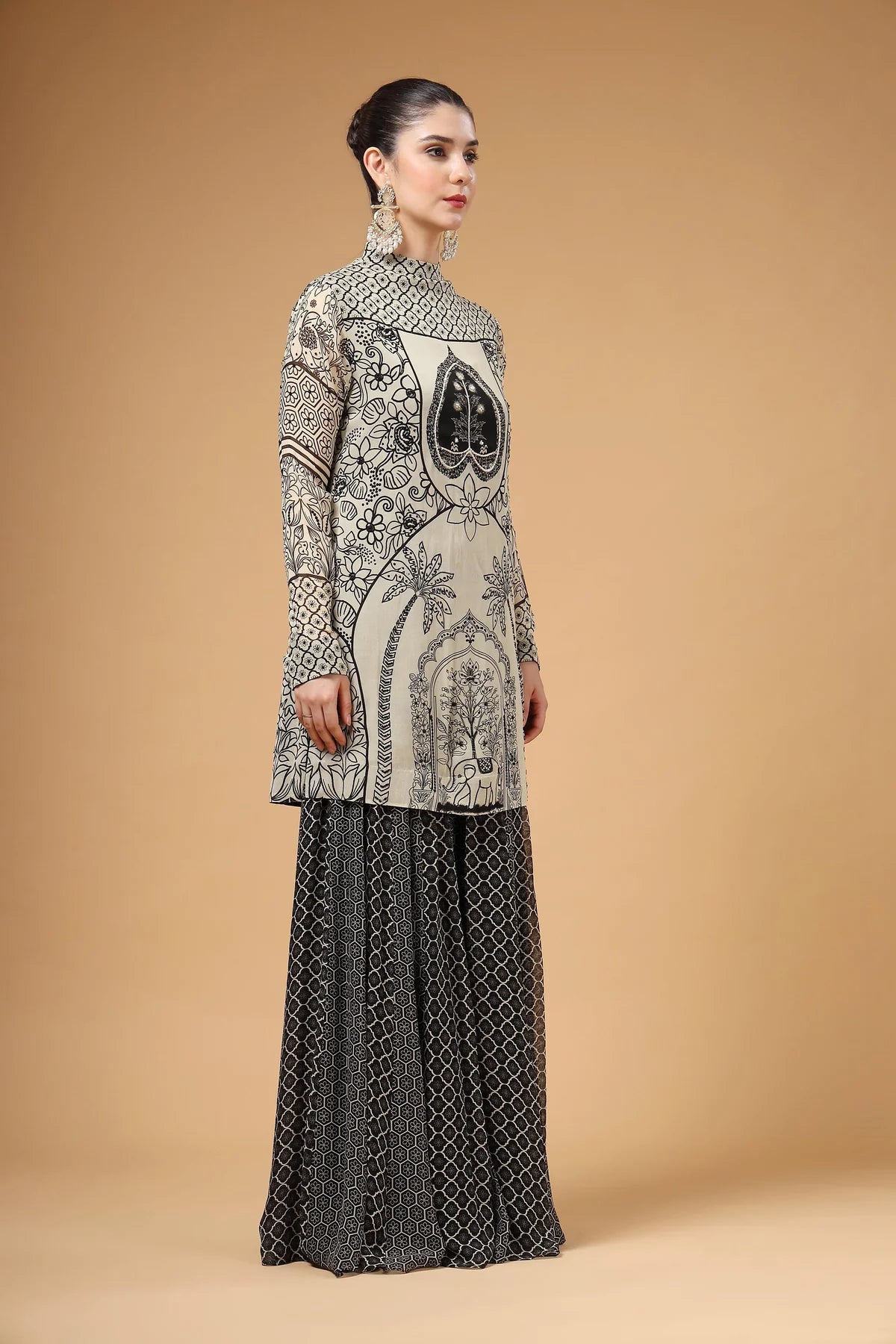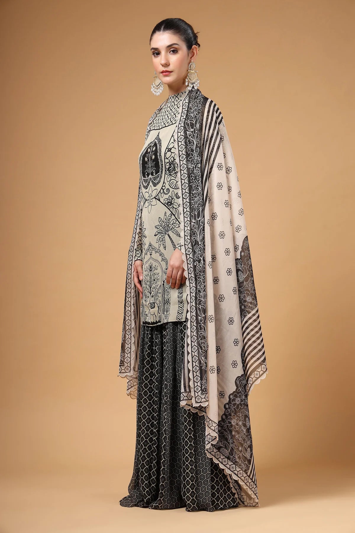 A printed Sharara set featuring a hand-embroidered kurta, paired with a flared Sharara designed with kalis for added comfort and graceful volume. The look is completed with a lightweight printed organza dupatta, finished with four-sided scalloped embroidery for a touch of glam.