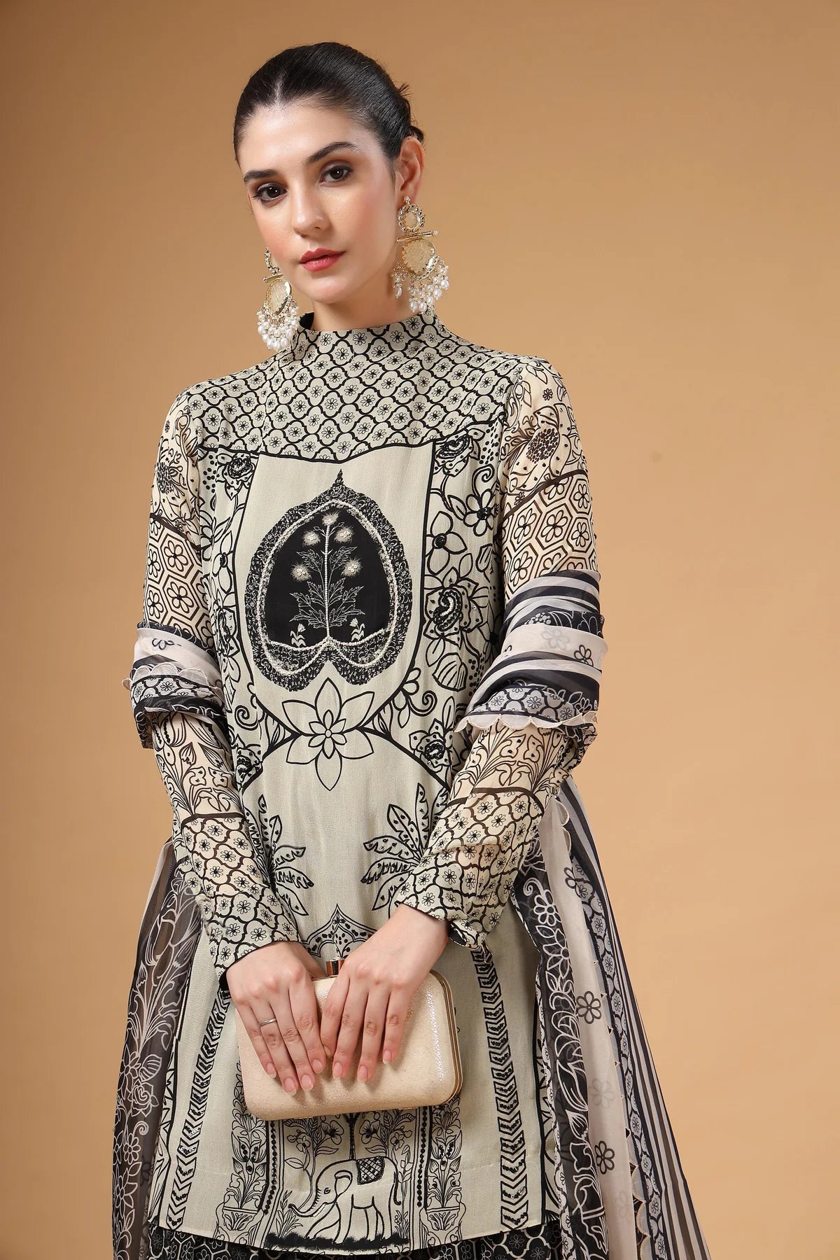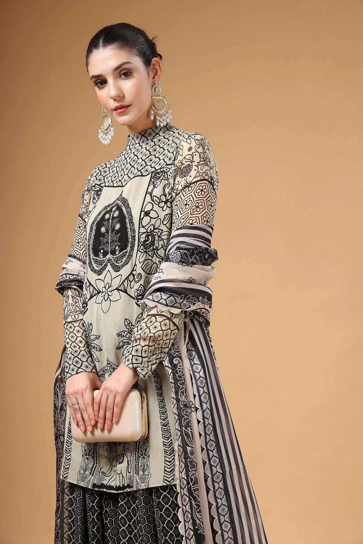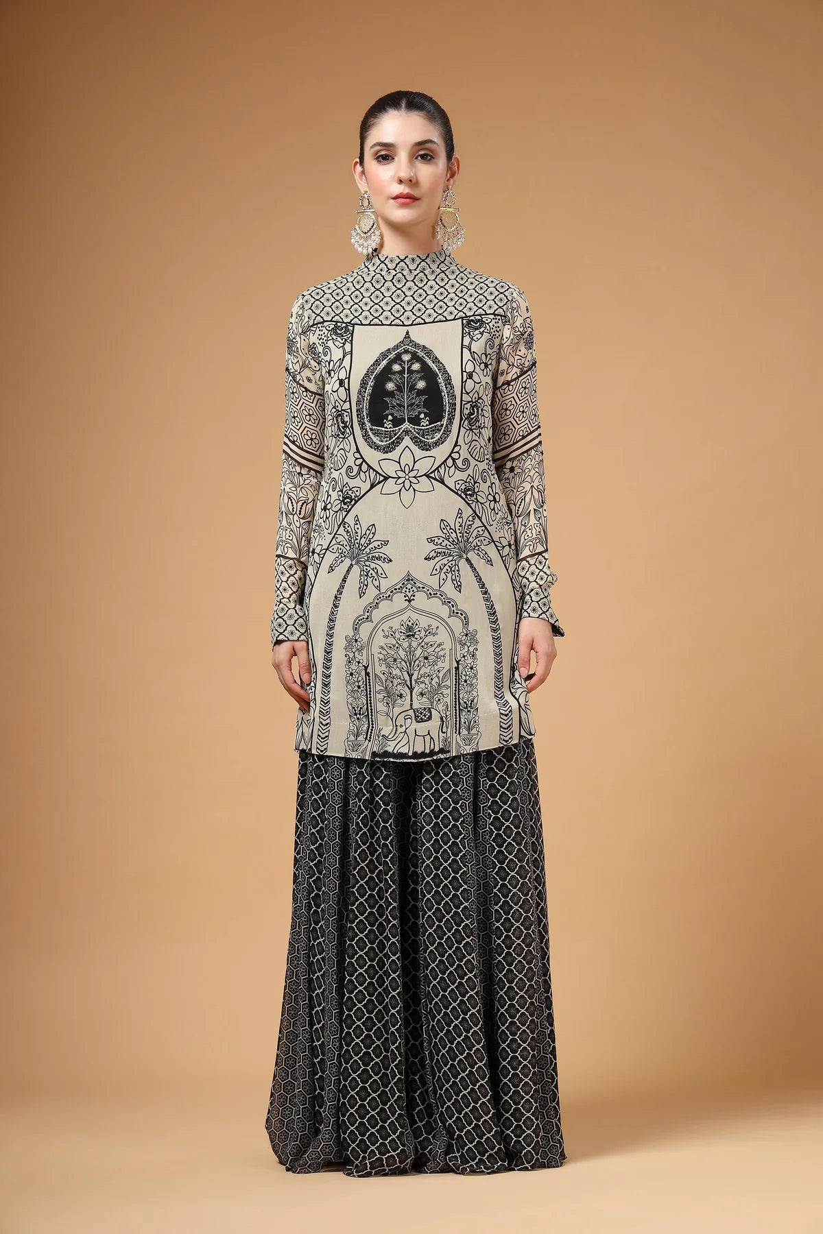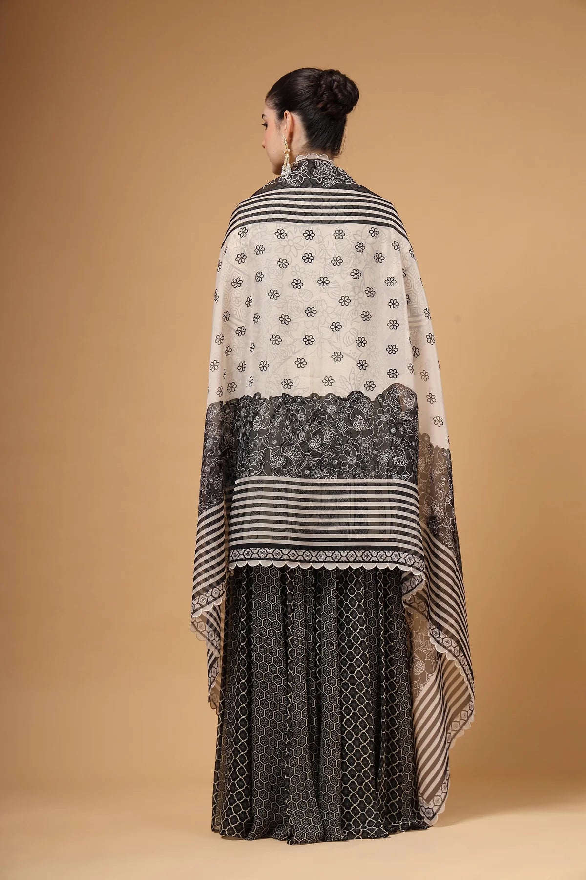 A printed Sharara set featuring a hand-embroidered kurta, paired with a flared Sharara designed with kalis for added comfort and graceful volume. The look is completed with a lightweight printed organza dupatta, finished with four-sided scalloped embroidery for a touch of glam.