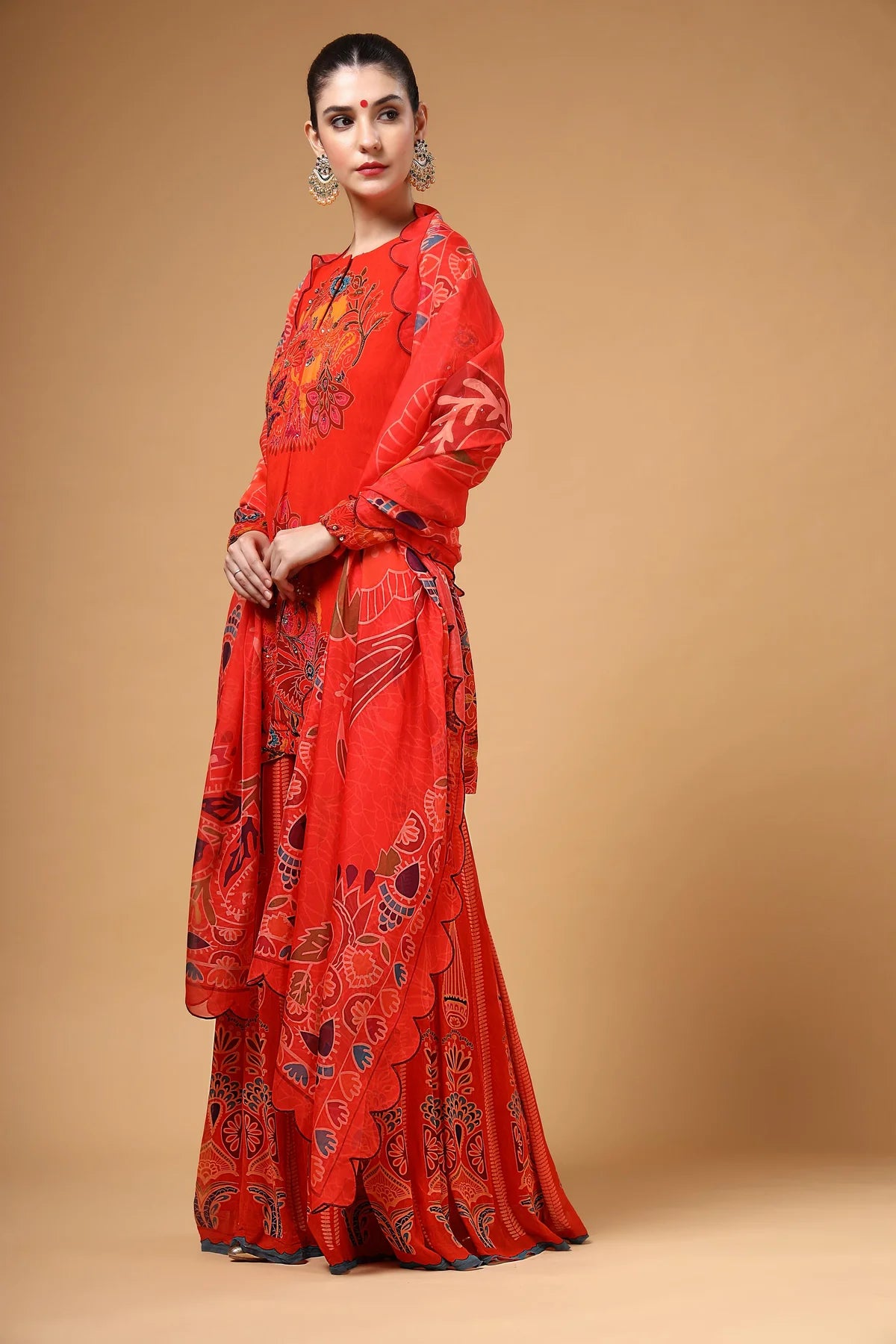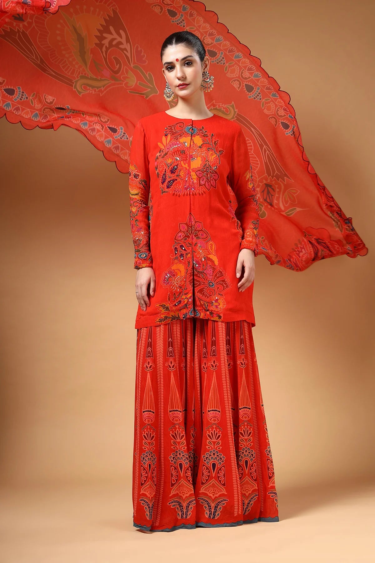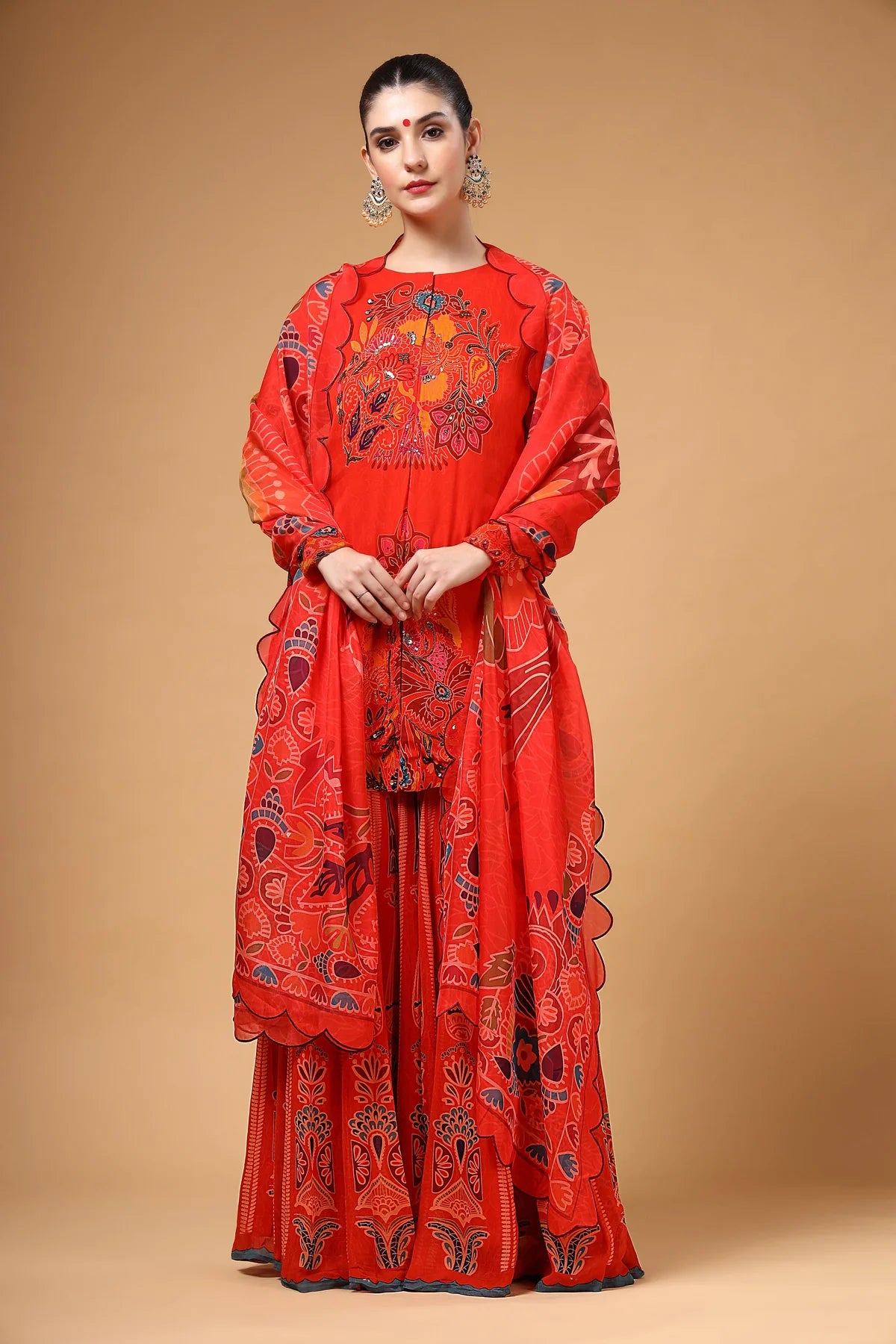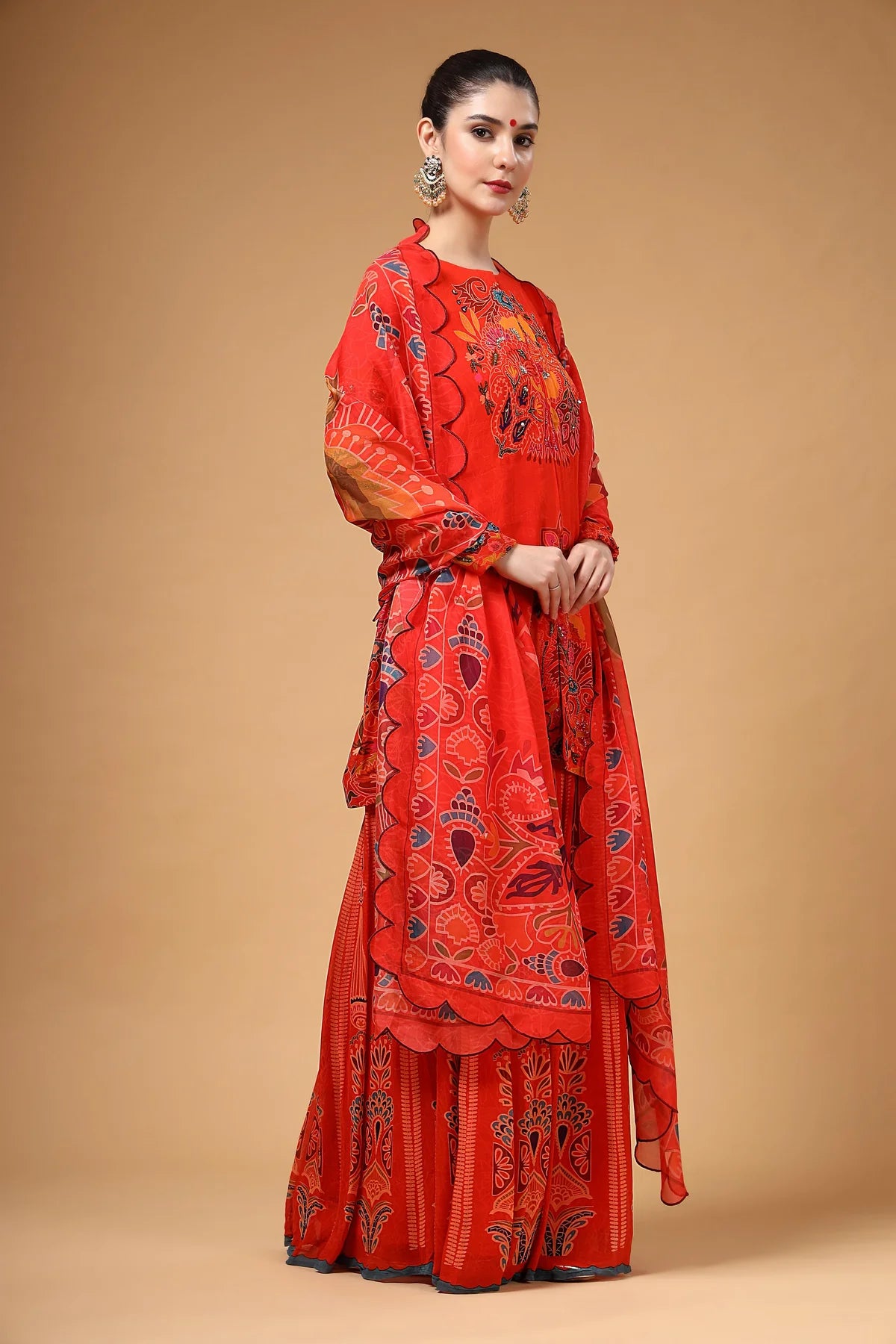 A stunning red printed georgette Sharara set featuring a highlighted hand-embroidered kurta, paired with a kalidaar Sharara that adds both flair and comfort. The look is completed with a lightweight organza dupatta, beautifully finished with four-sided scalloped embroidery. Crafted in airy fabric, this ensemble is as elegant as it is comfortable.