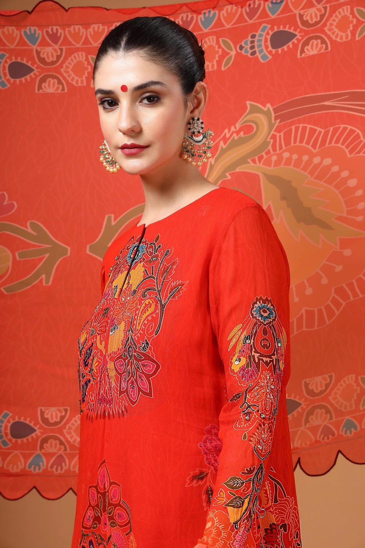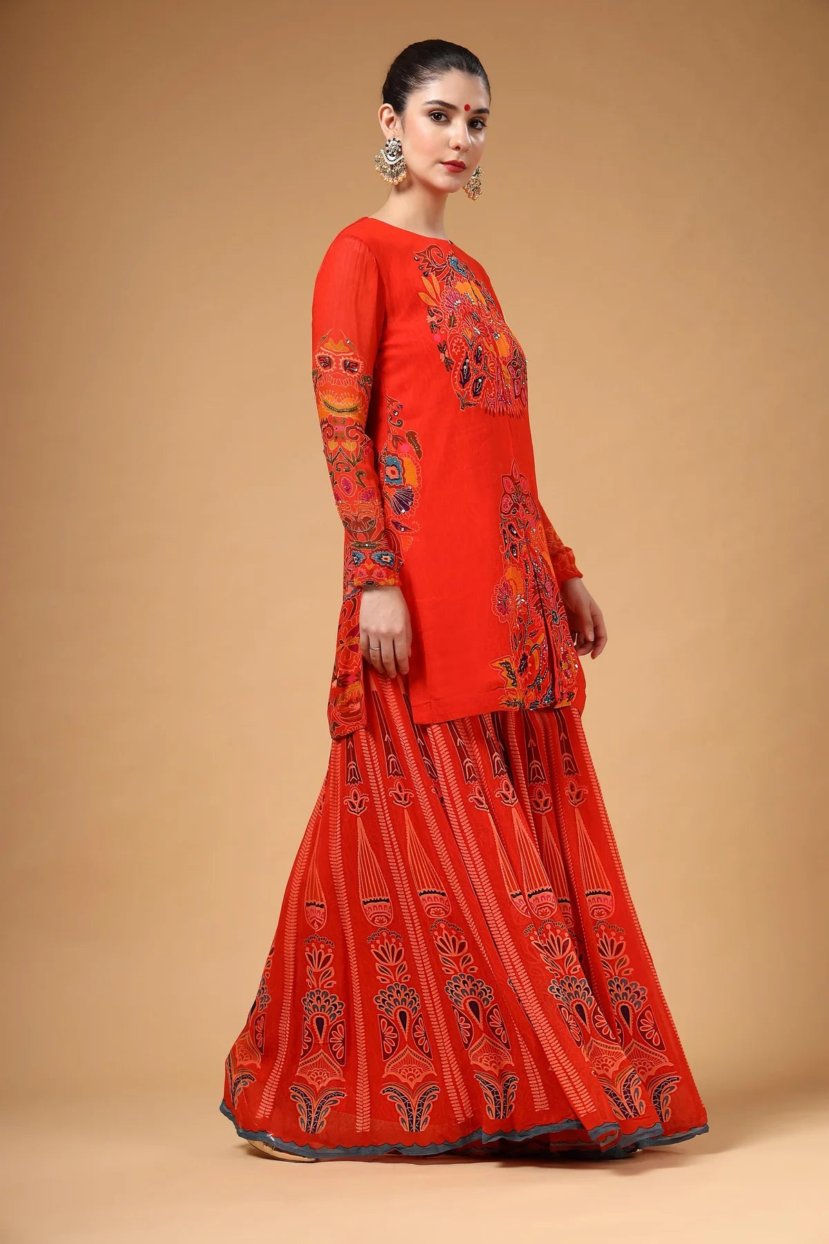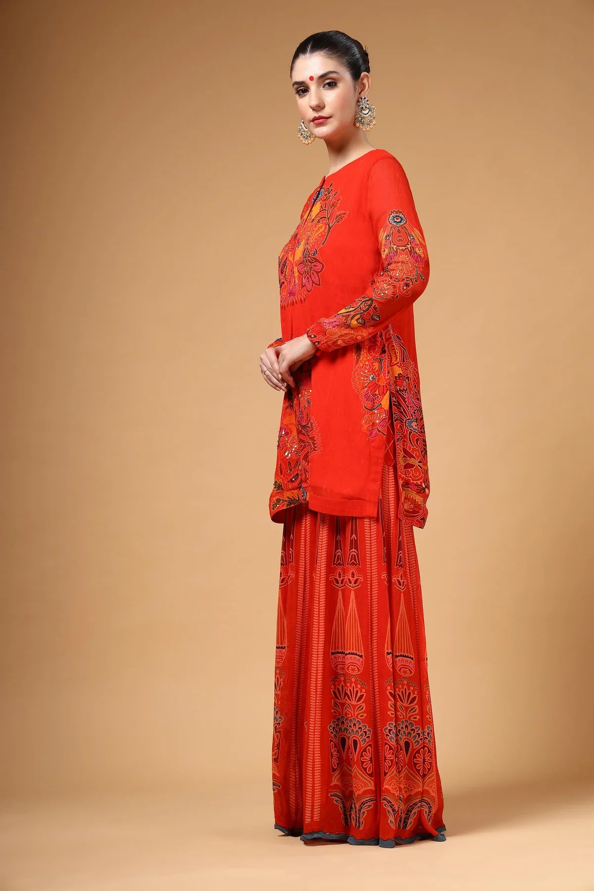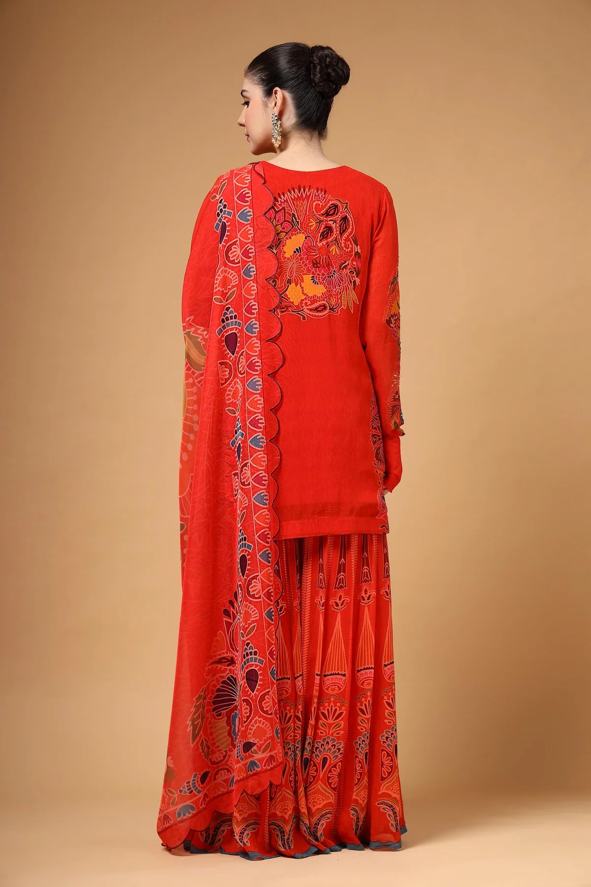 A stunning red printed georgette Sharara set featuring a highlighted hand-embroidered kurta, paired with a kalidaar Sharara that adds both flair and comfort. The look is completed with a lightweight organza dupatta, beautifully finished with four-sided scalloped embroidery. Crafted in airy fabric, this ensemble is as elegant as it is comfortable.