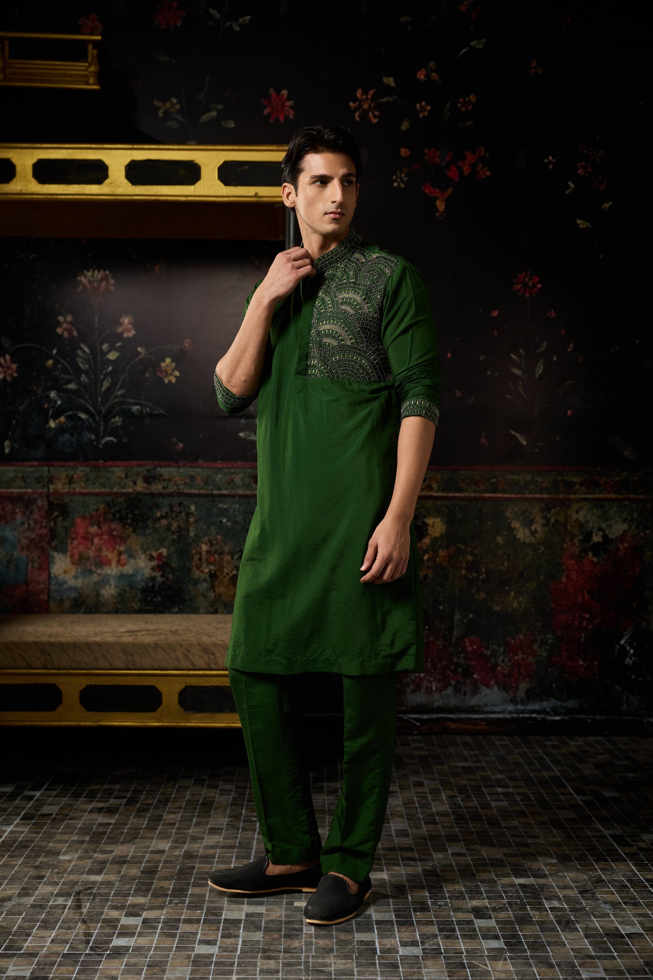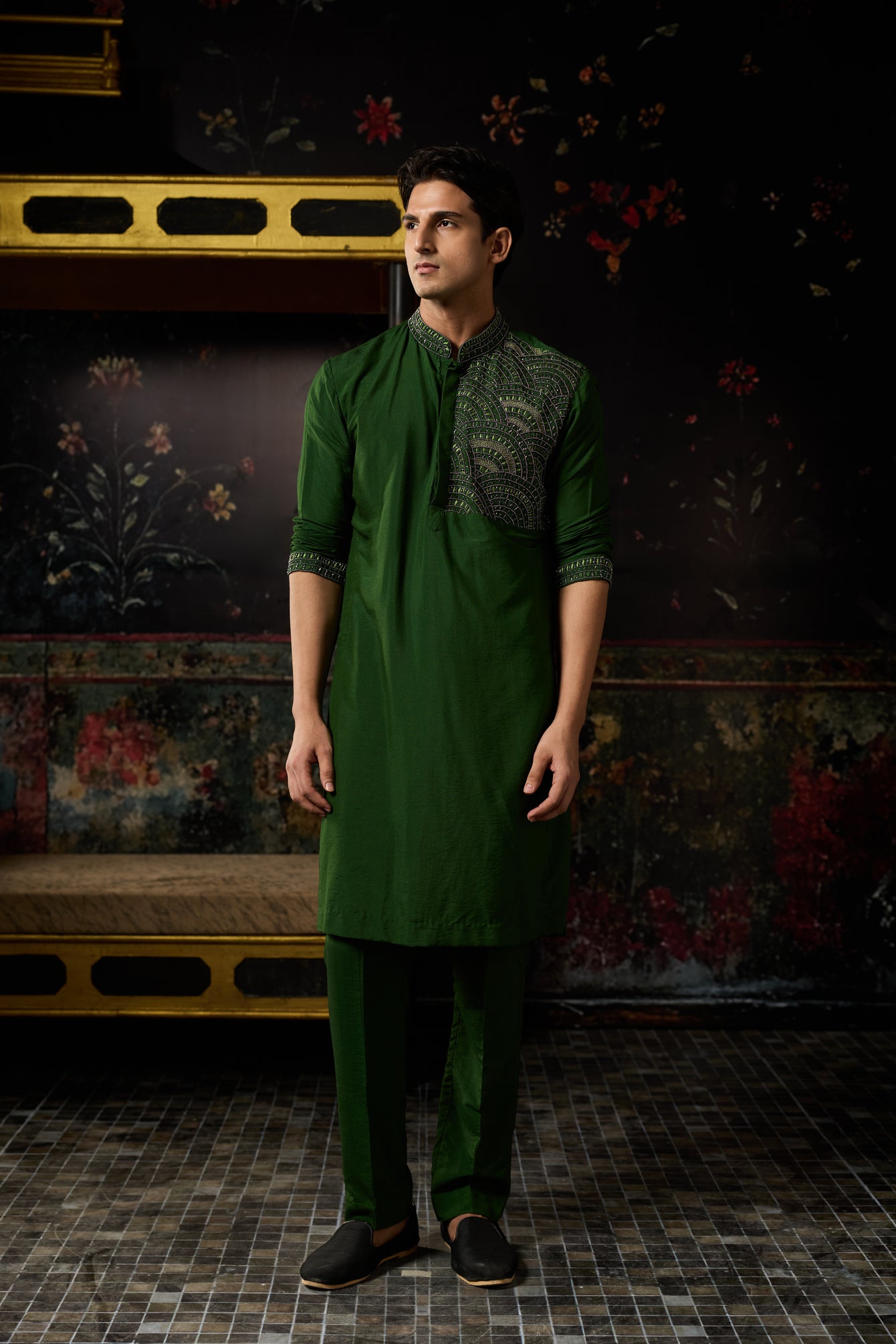 Green With Gunmetal & Green Arc Embroidered Kurta Paired With Green Pants