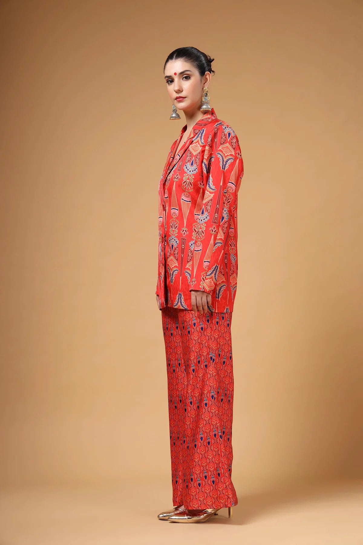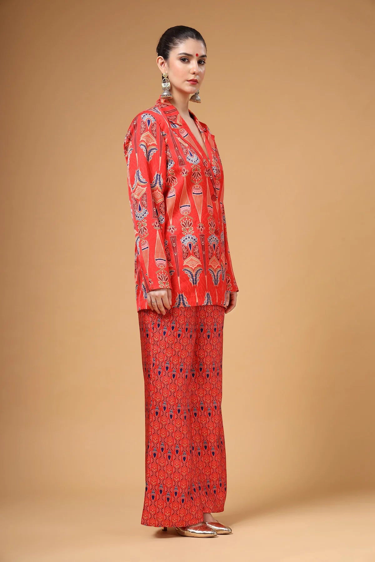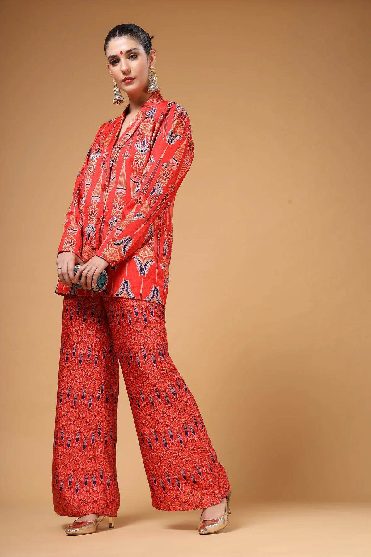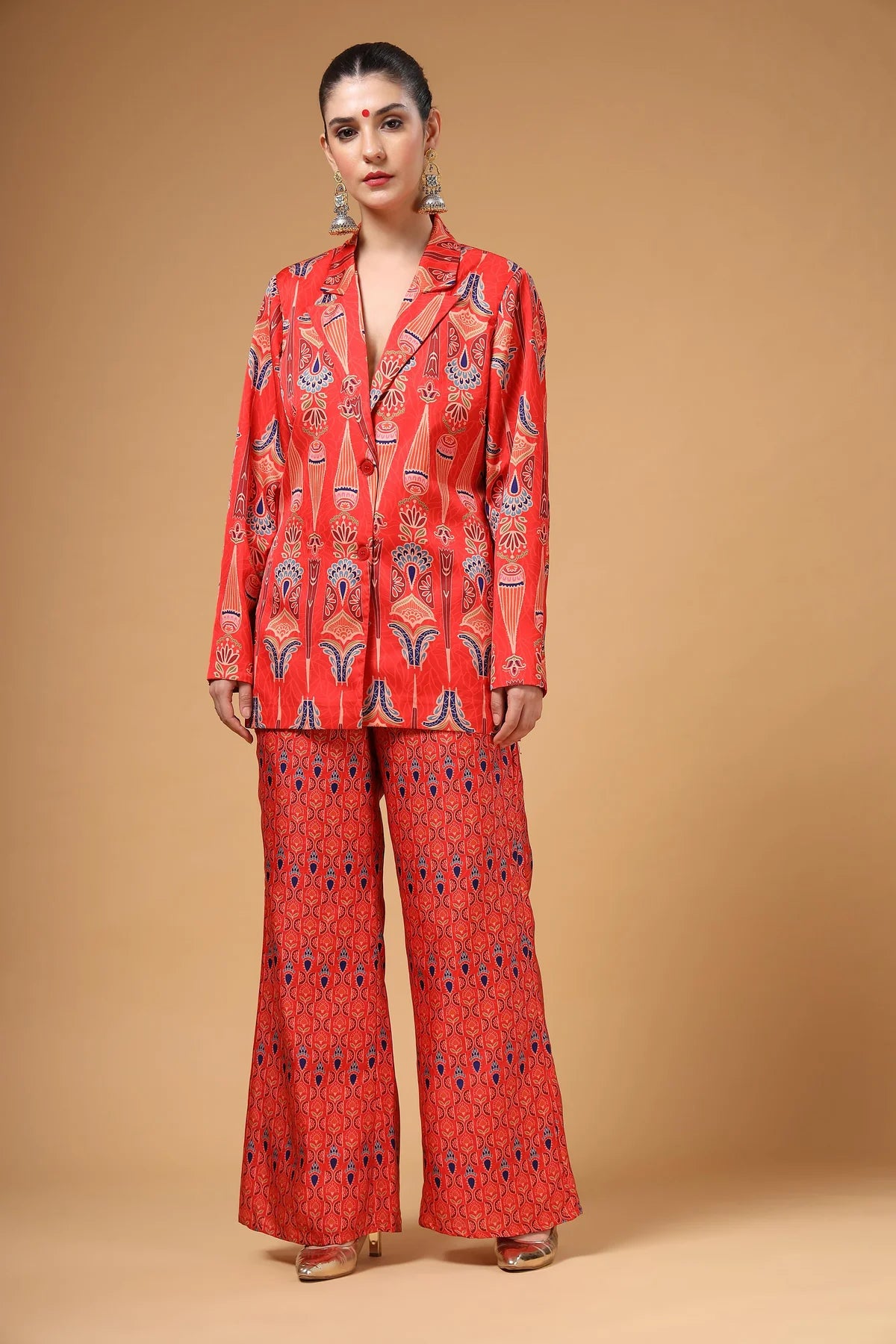 A chic lapel-collar printed jacket paired with matching printed pants. Versatile enough to be styled in multiple ways depending on the occasion, this ensemble offers both comfort and standout style. Effortlessly fashionable, it ensures you look unique and make a bold statement in any crowd.