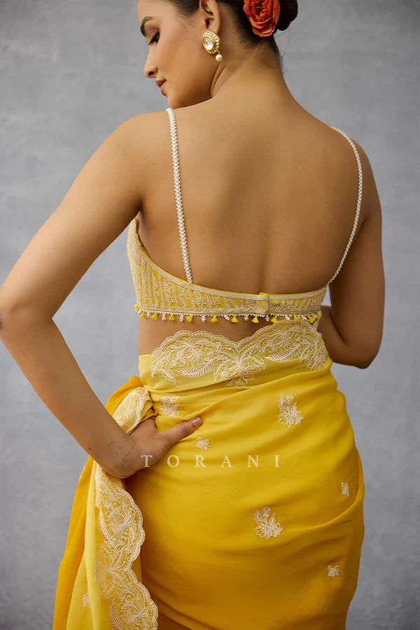 The Kasmai Brinda Bralette is crafted with a delicate butterfly net fabric and features intricately embroidered design. The cut and design or the blouse offers a bold touch to your summer traditional look.