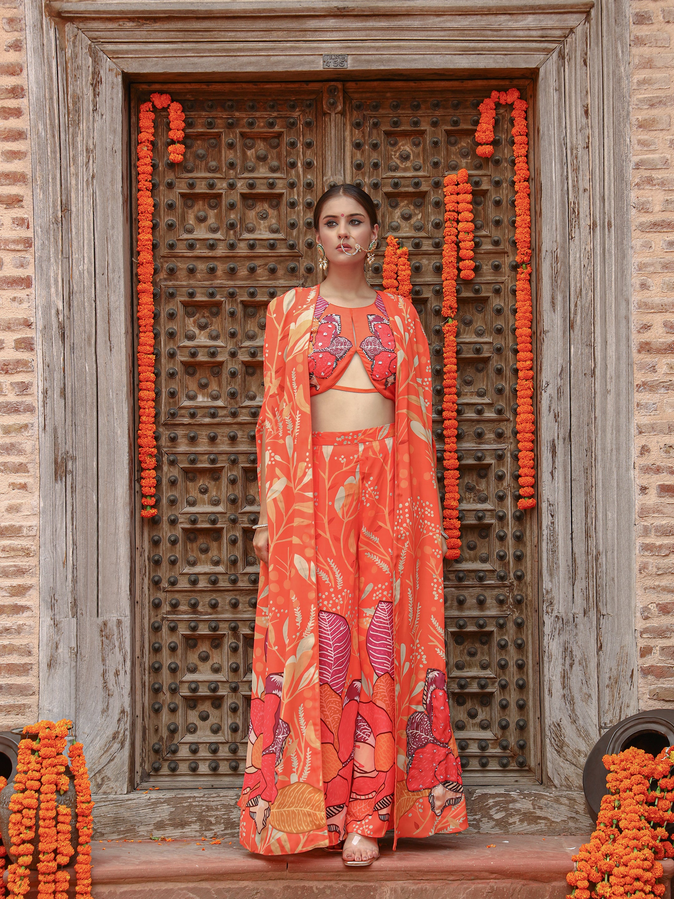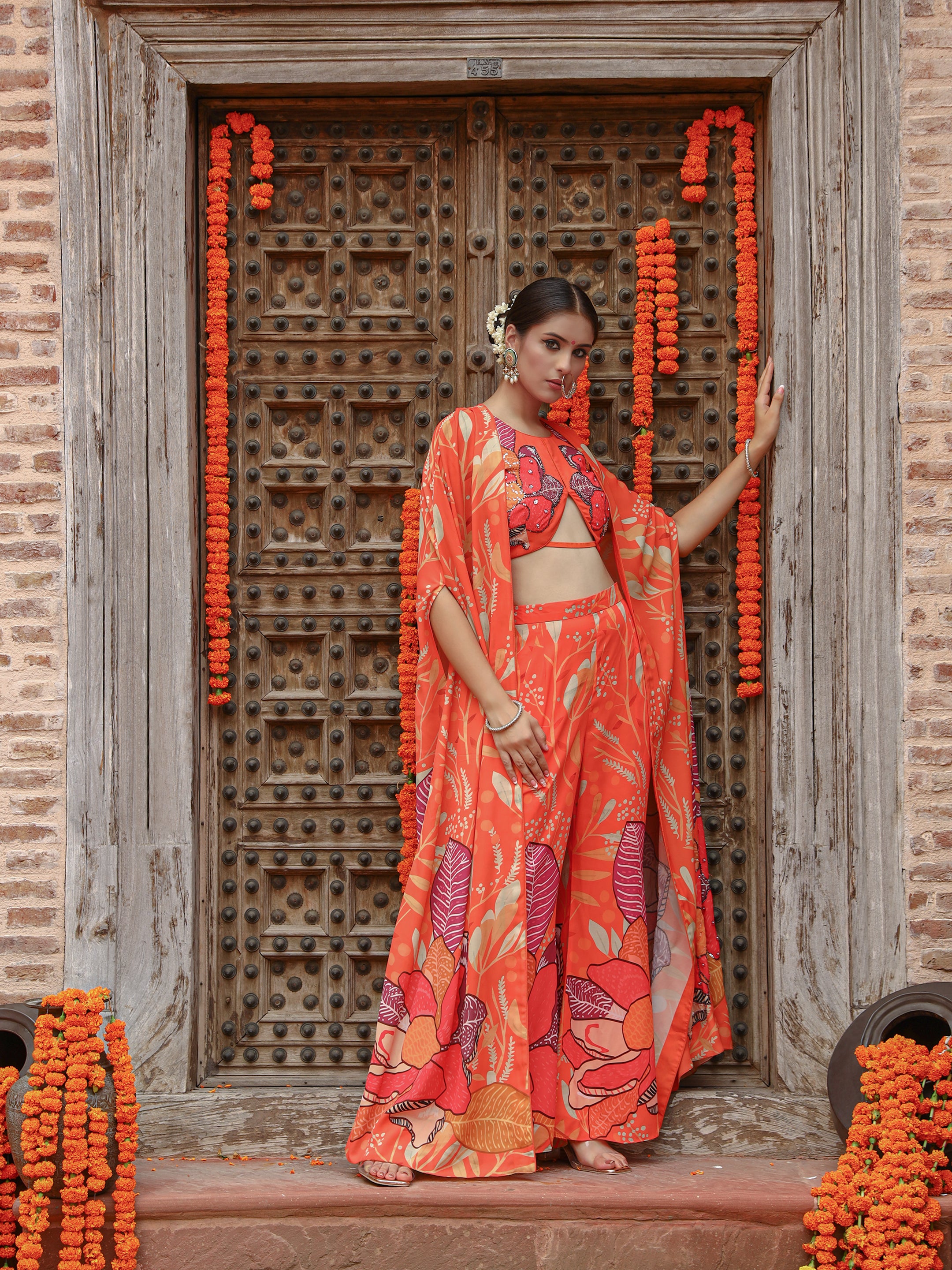 Step into the spotlight with our vibrant crop top and plazo set, elegantly paired with a stunning printed cape. This ensemble features an all-over bold print of oversized flowers, creating an eye-catching look that commands attention. Perfect for any function, it combines retro charm with modern comfort.