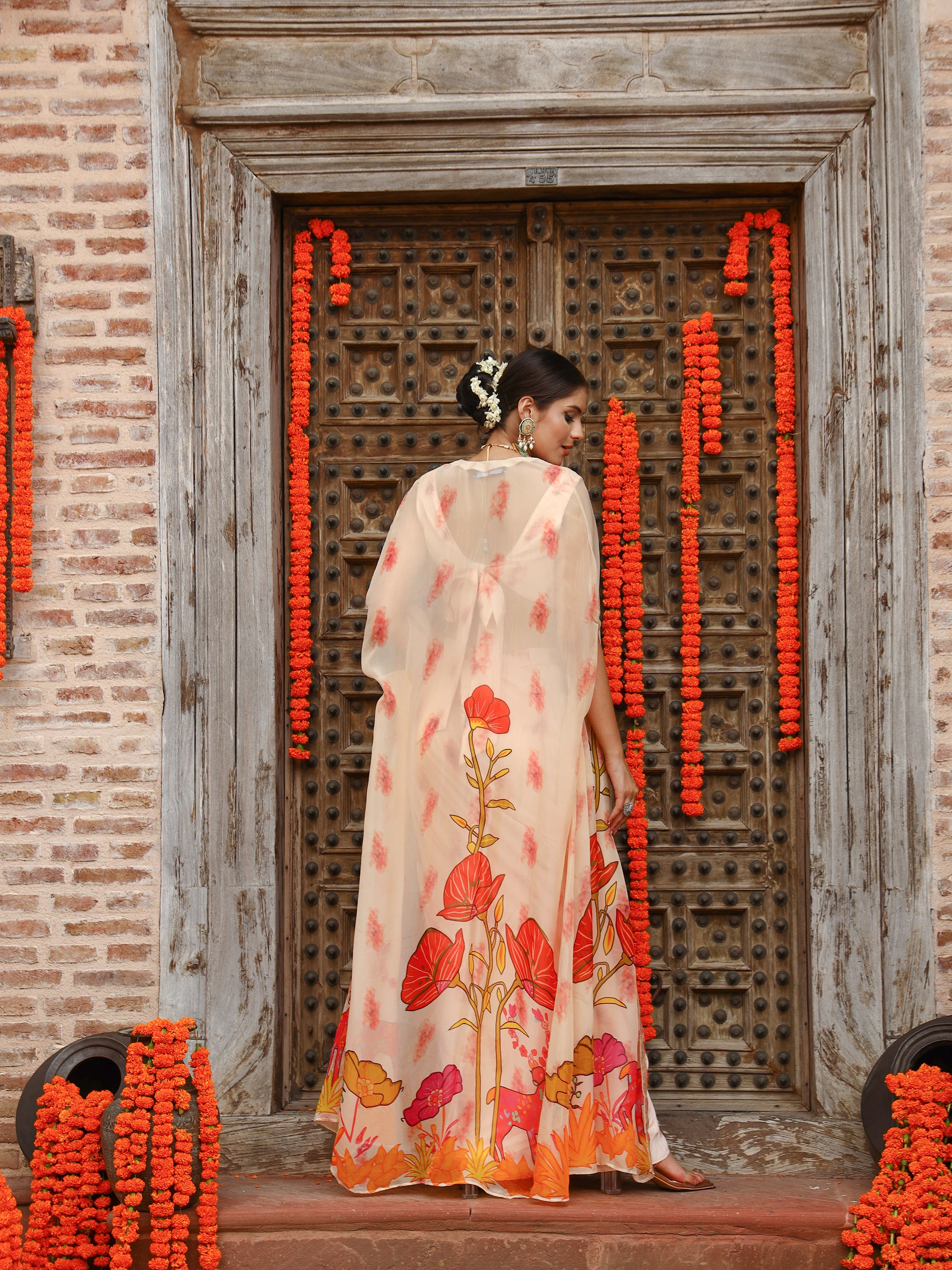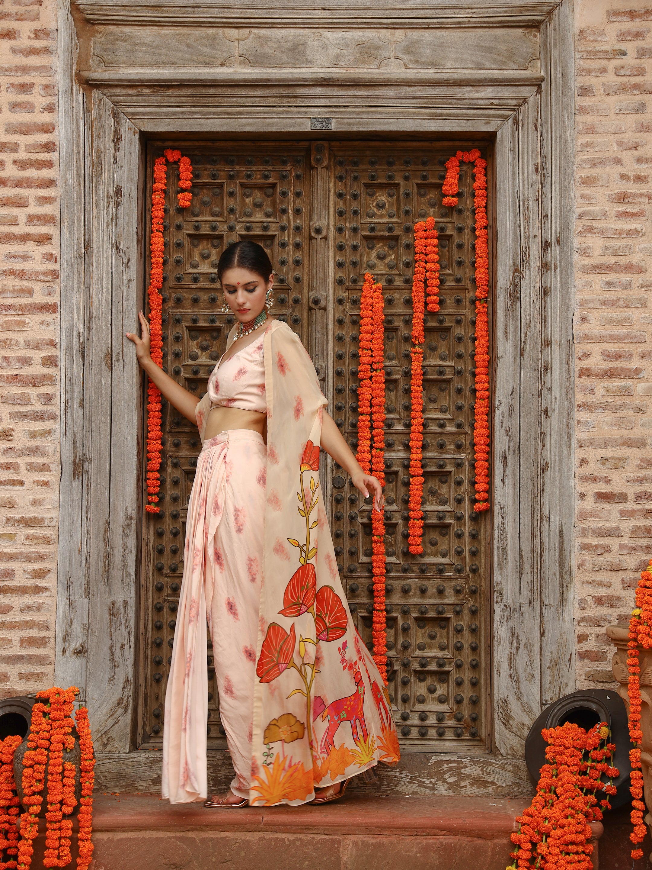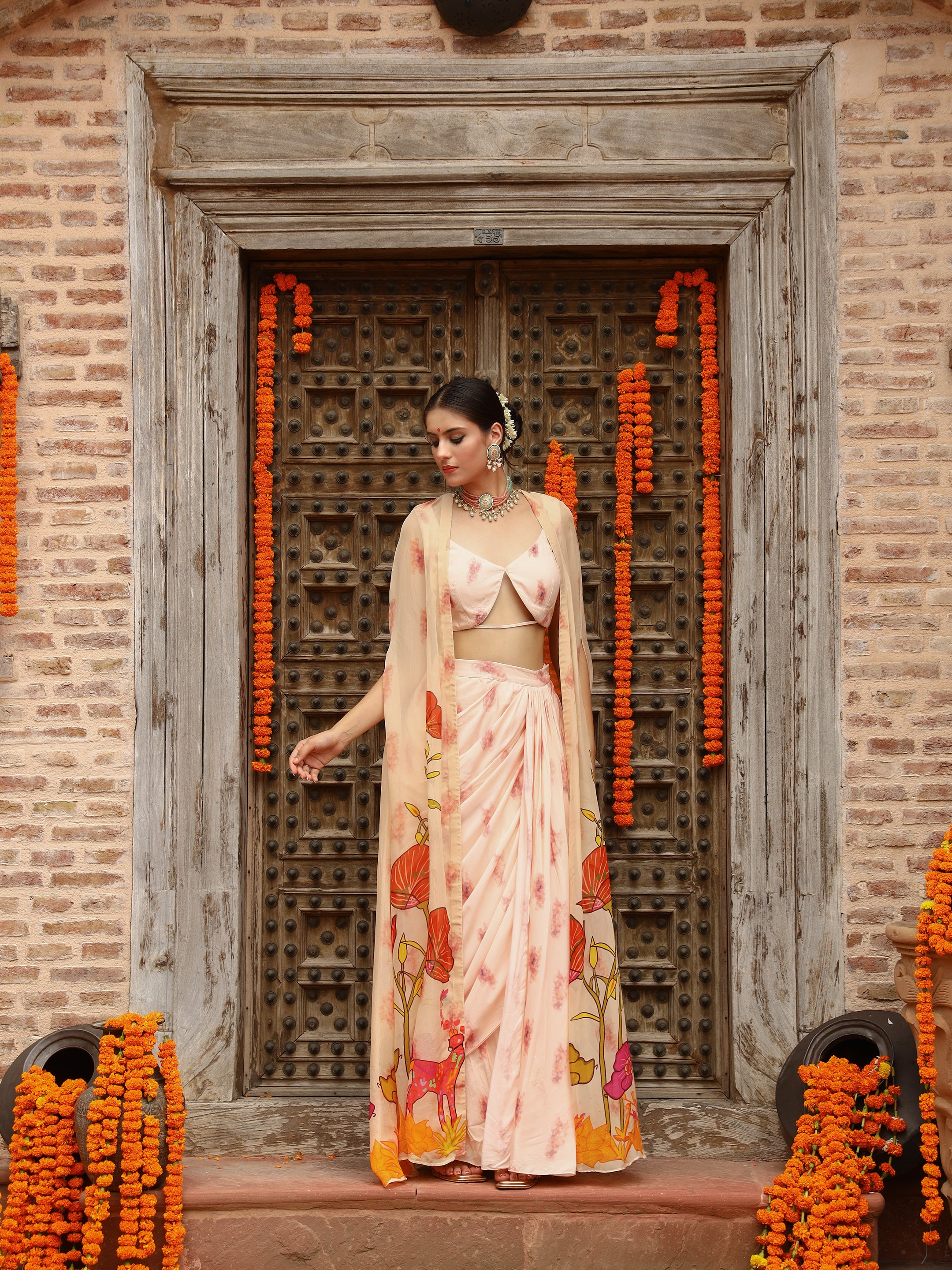 Step into retro glamour with our stylish crop top and draped skirt set, beautifully paired with a printed organza cape featuring bold, oversized flowers at the hem. This eye catching ensemble showcases an all over print that exudes vintage charm while ensuring comfort and ease of movement. Perfect for any function, it combines timeless elegance with modern flair, allowing you to make a memorable statement at your next celebration. Embrace the allure of the past with a contemporary twist.