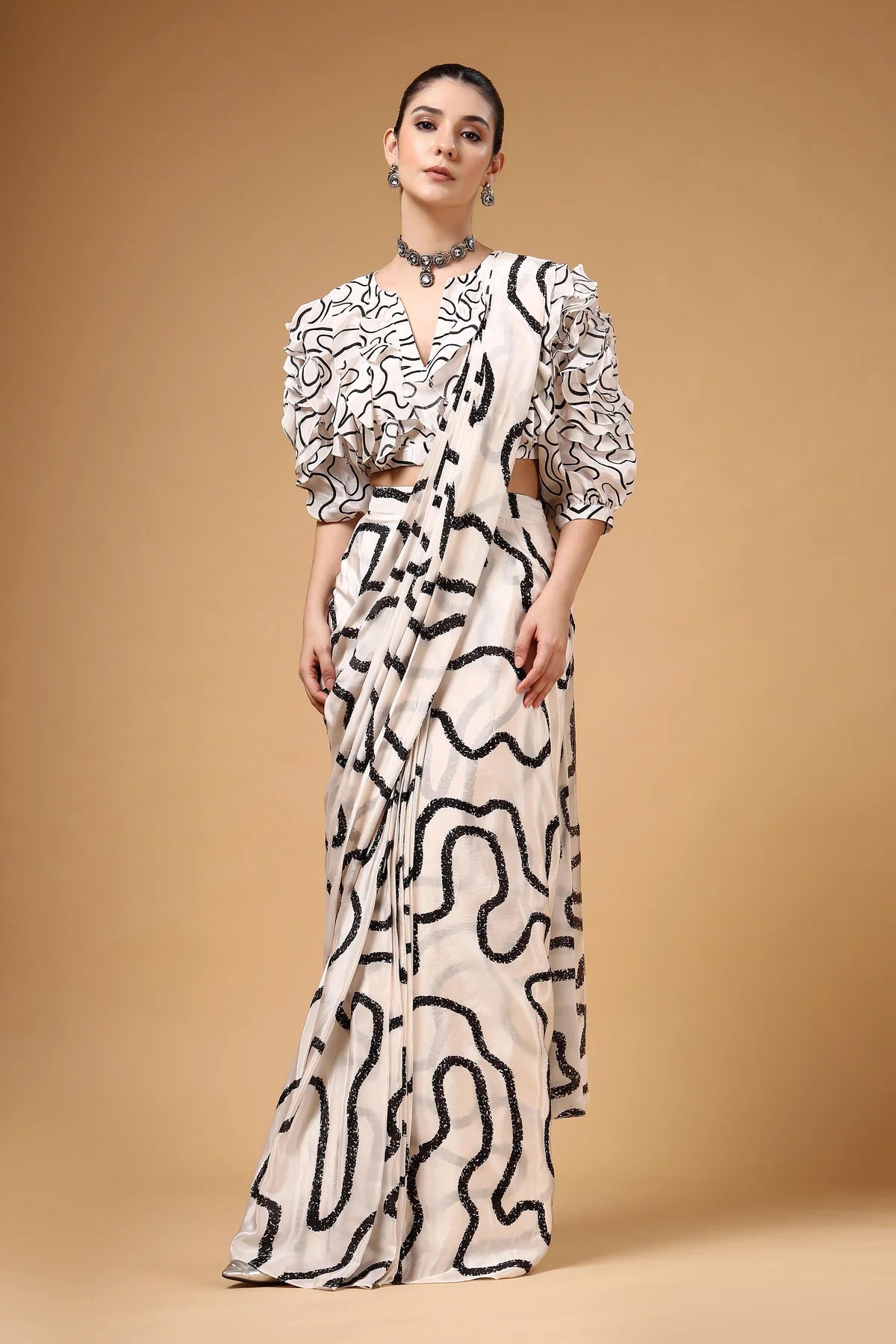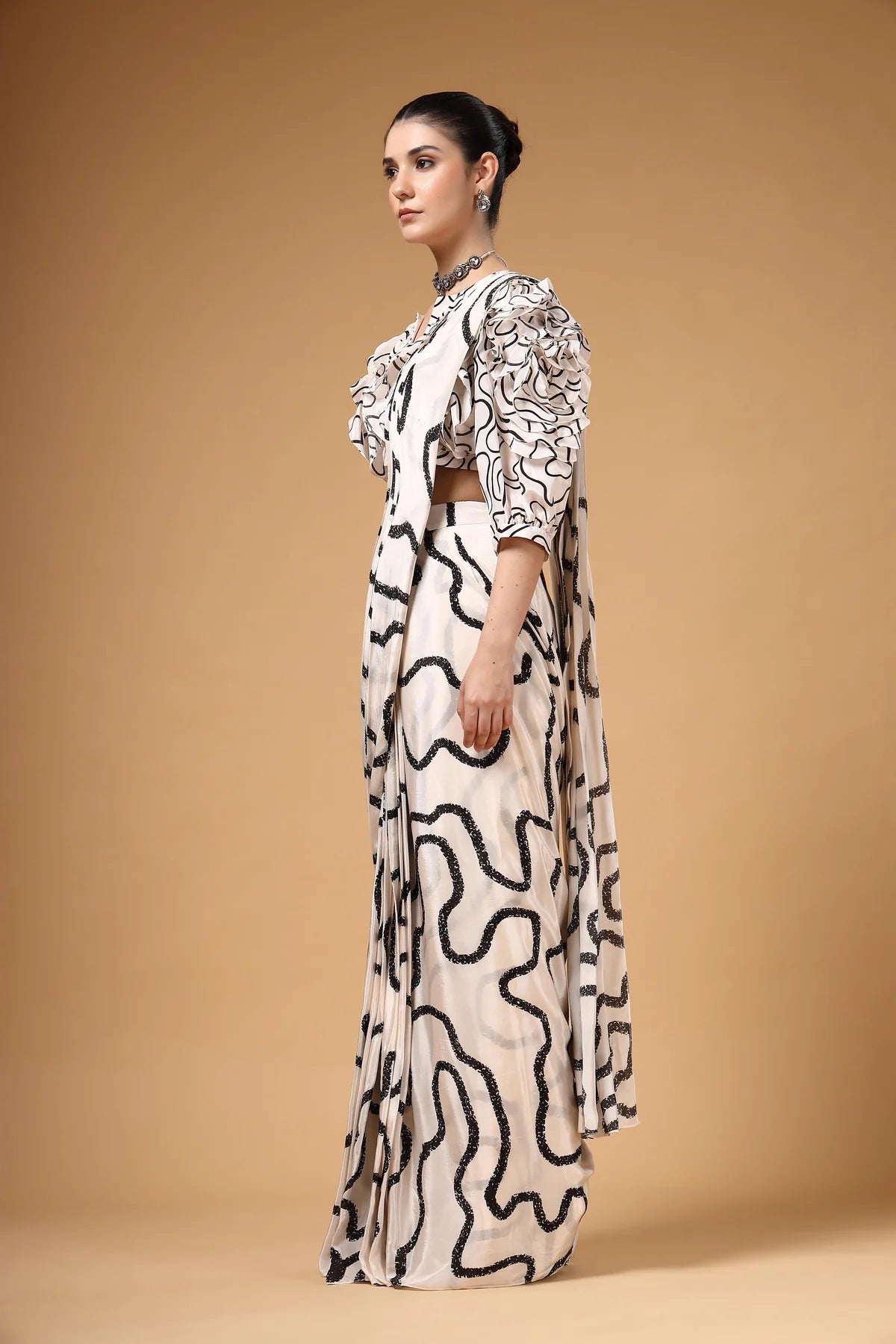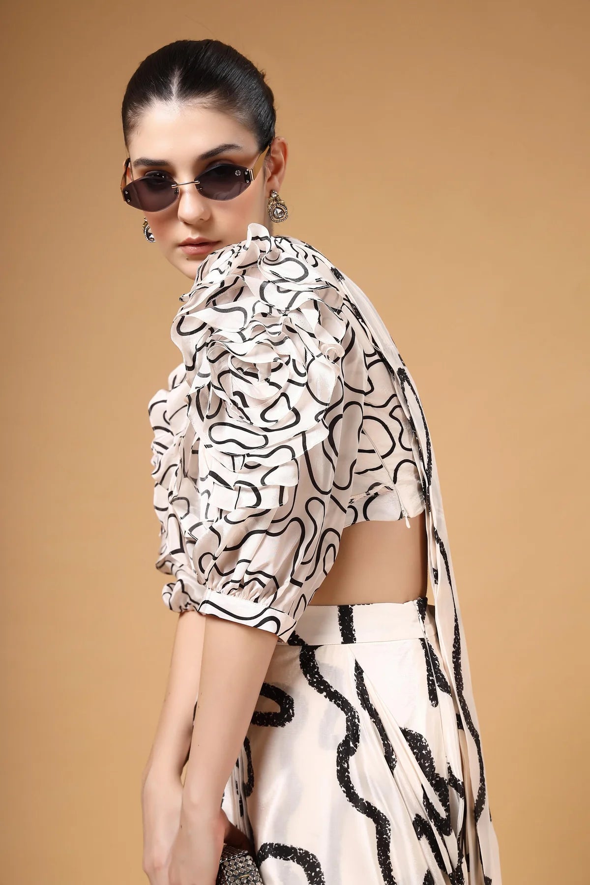 A statement ruffle blouse paired with a pre-draped saree — a fresh, modern take on classic draping. Designed for effortless wear, this ensemble blends trend-forward style with all-day comfort, making it the perfect choice for everything from intimate gatherings to grand celebrations.