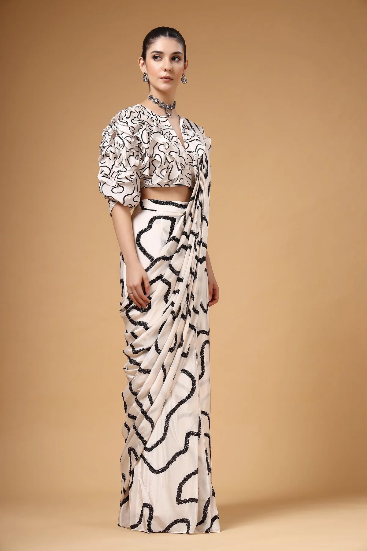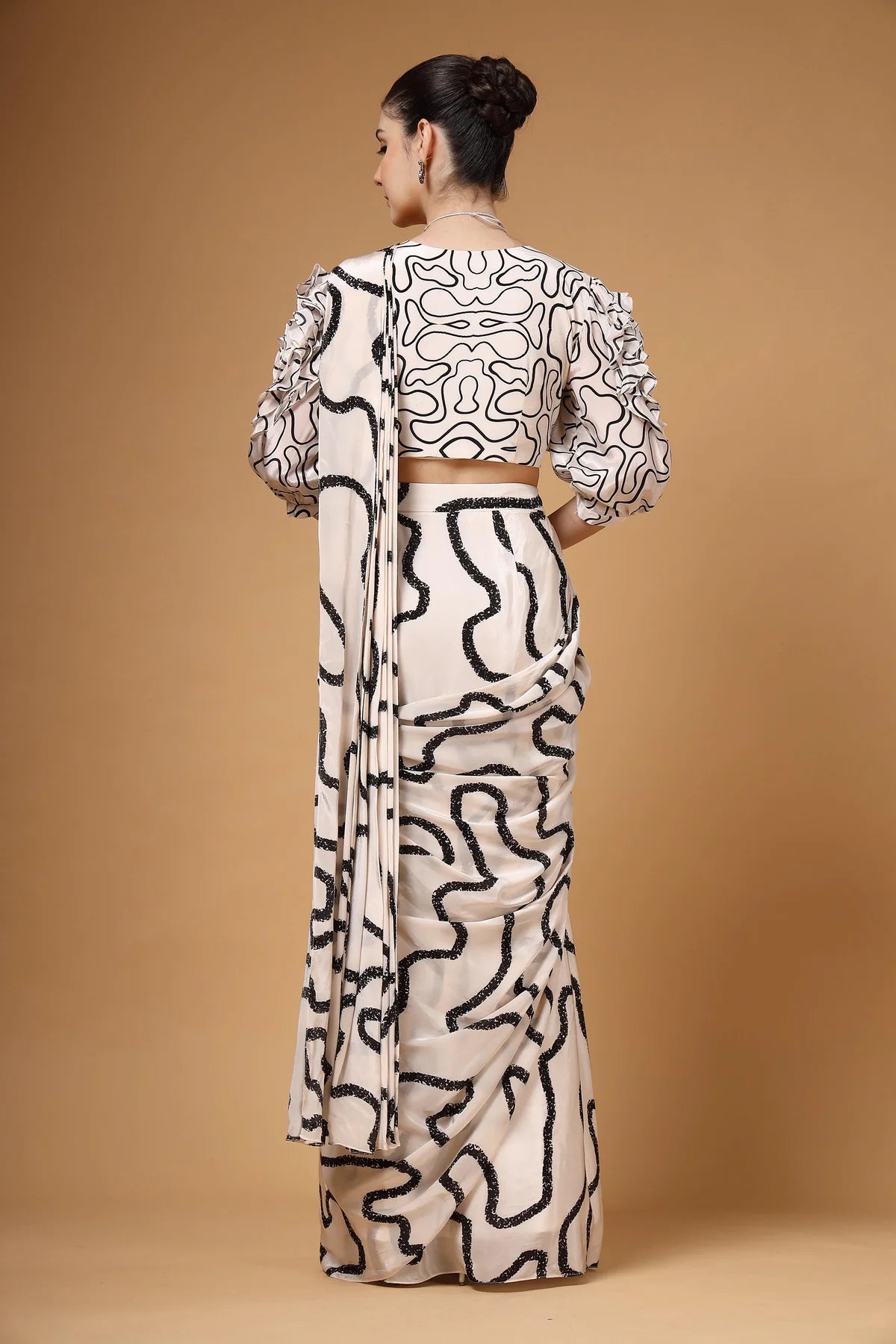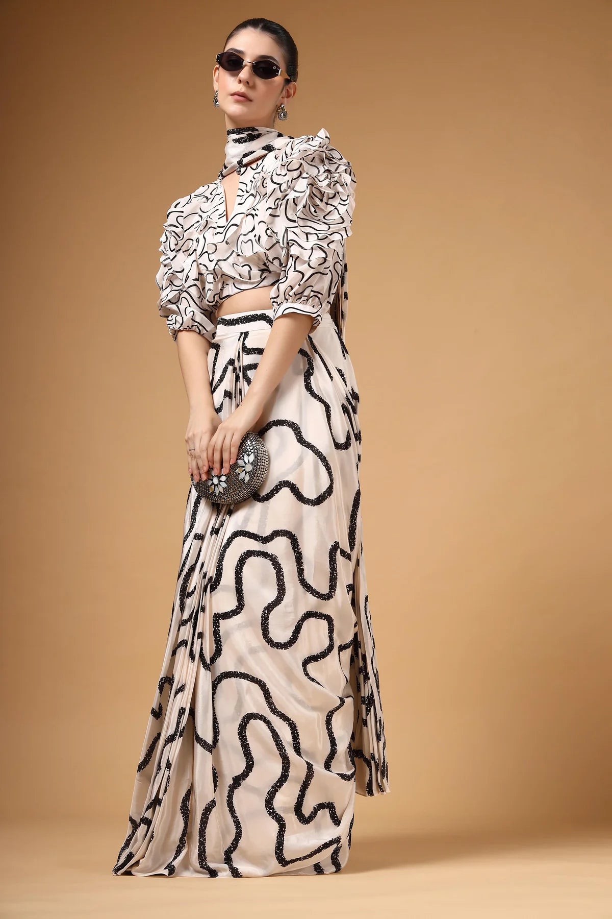 A statement ruffle blouse paired with a pre-draped saree — a fresh, modern take on classic draping. Designed for effortless wear, this ensemble blends trend-forward style with all-day comfort, making it the perfect choice for everything from intimate gatherings to grand celebrations.
