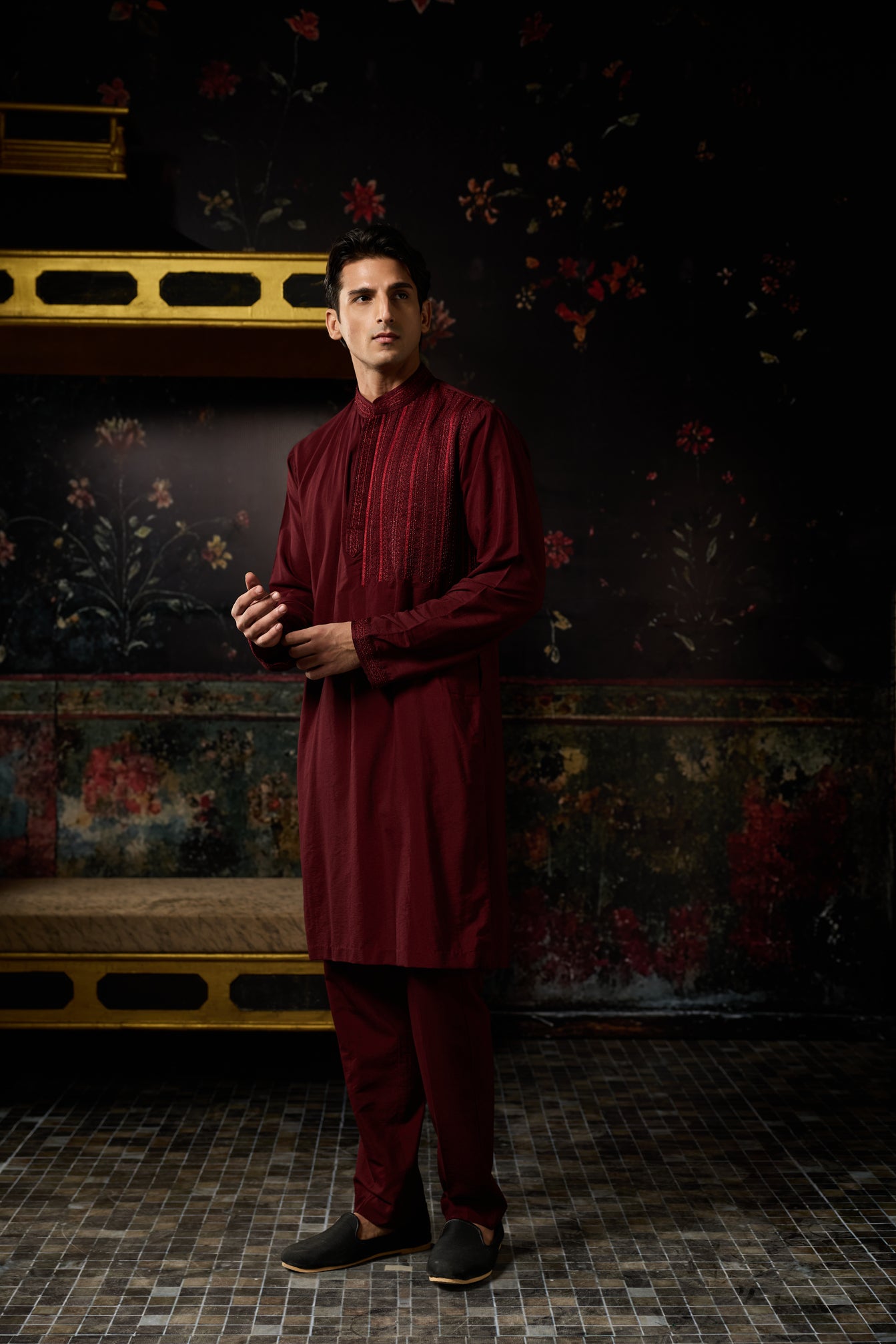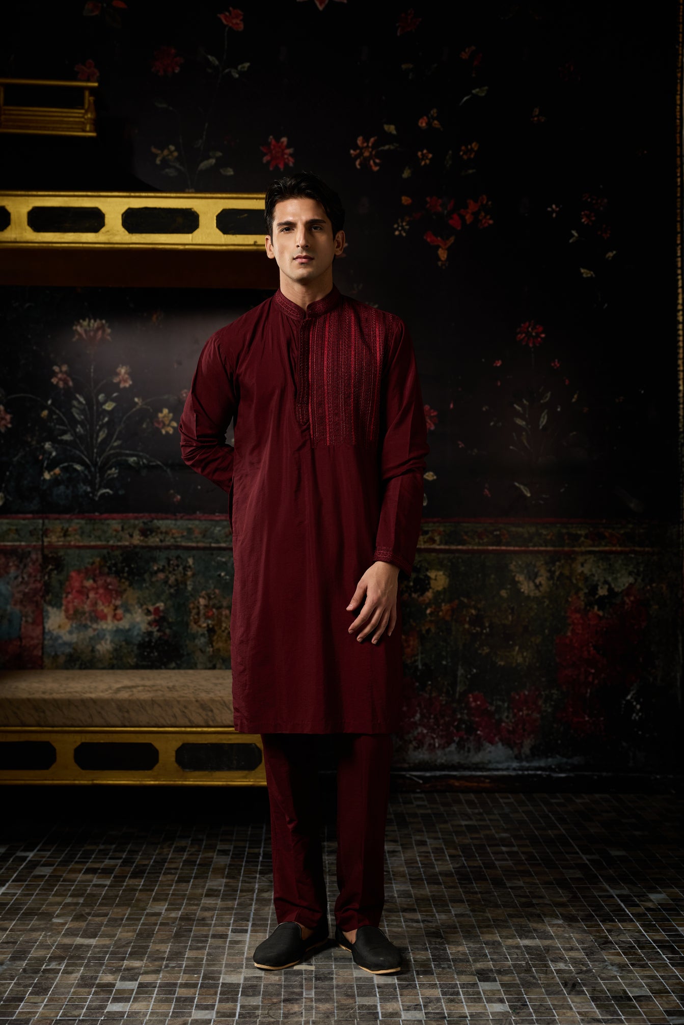 Maroon With Red Linear Thread & Cutdana Mix Embroidered Kurta Paired With Maroon Pants