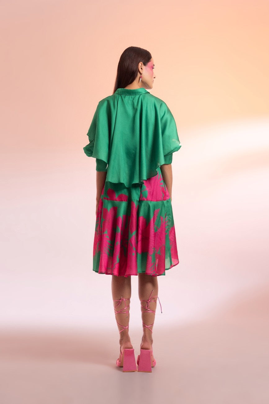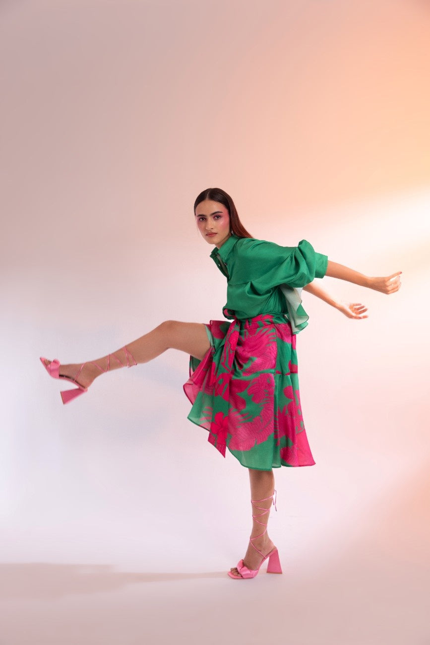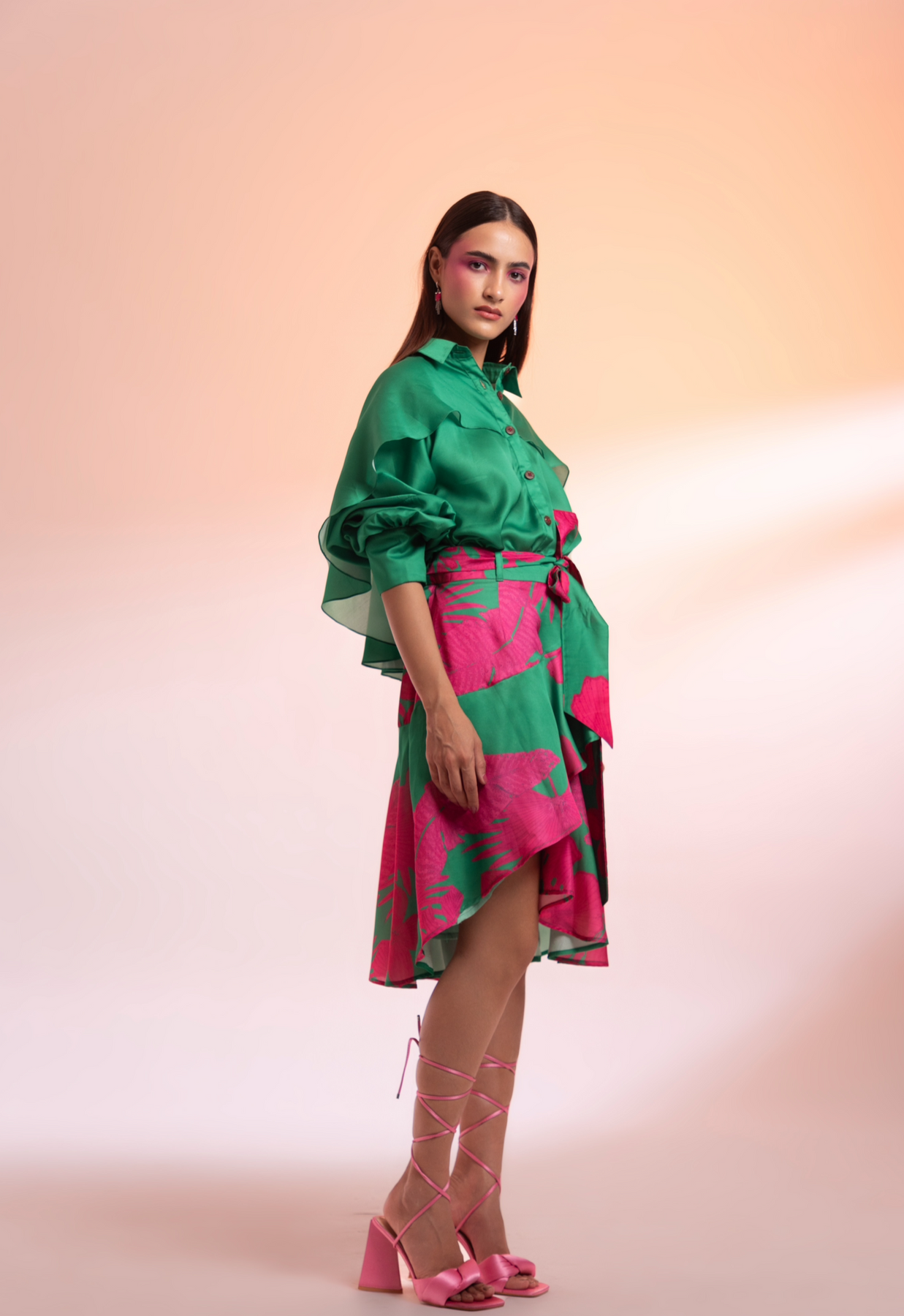 Elevate your wardrobe with our mini silk shirt and floral print skirt. The skirt features a waist belt that you can tie in a knot, adding a touch of versatility. The shirt adorned with delicate frills, enhances your silhouette with effortless style. This ensemble is perfect for making a fashionable statement.