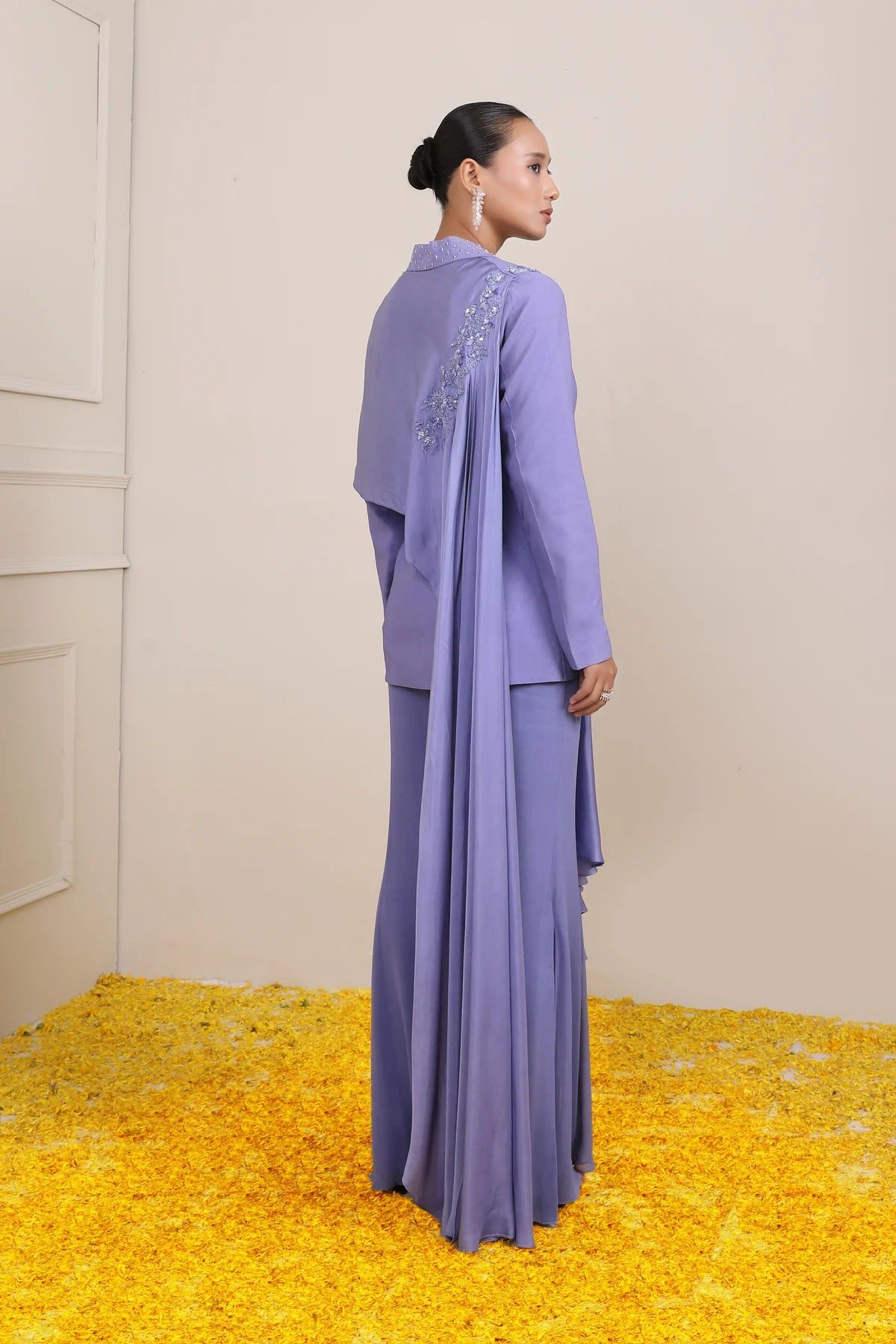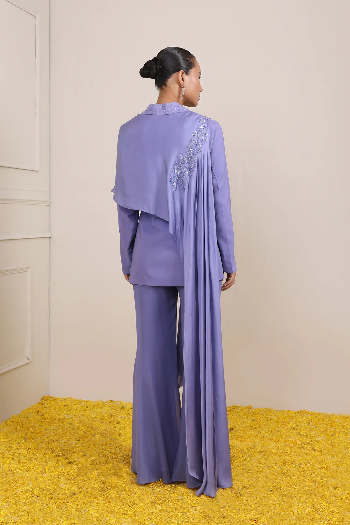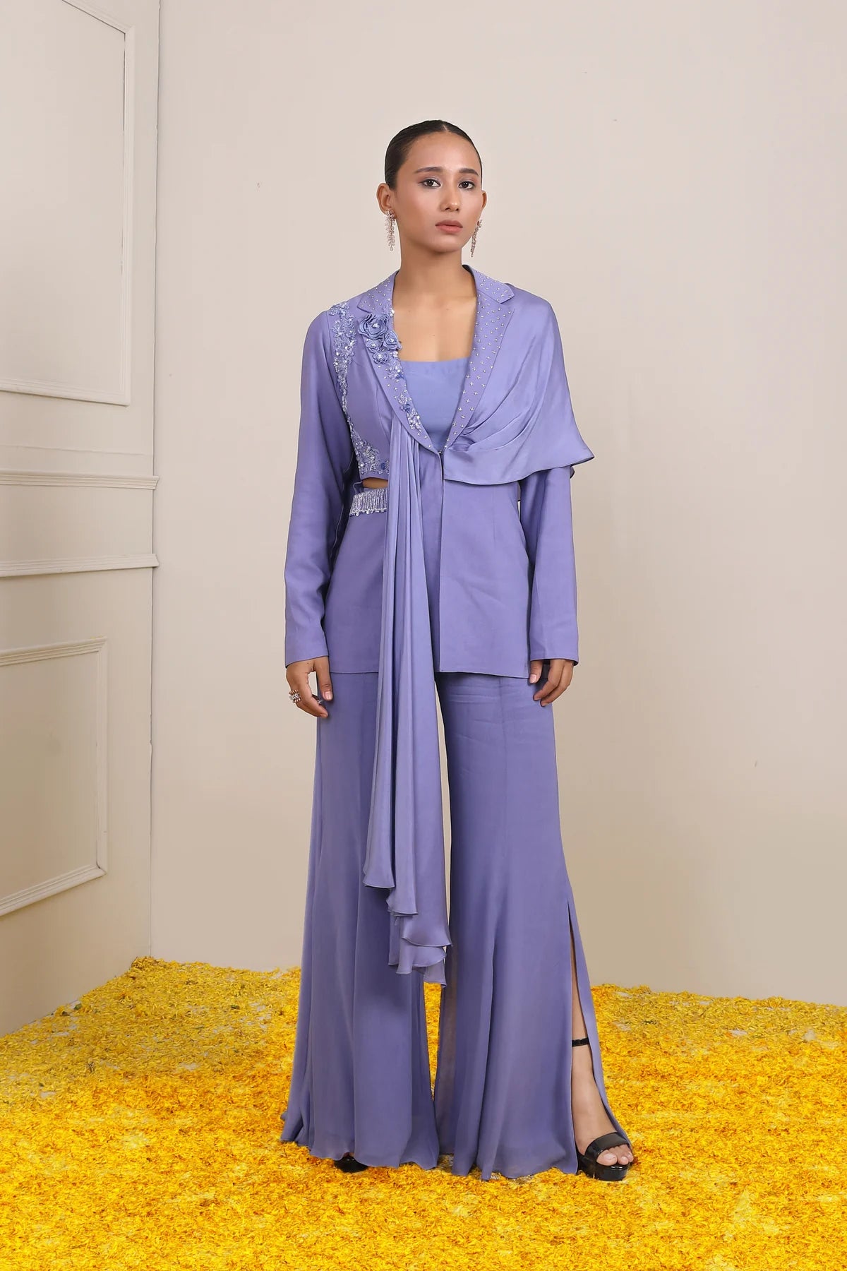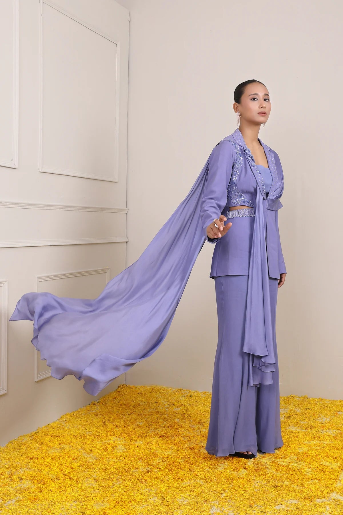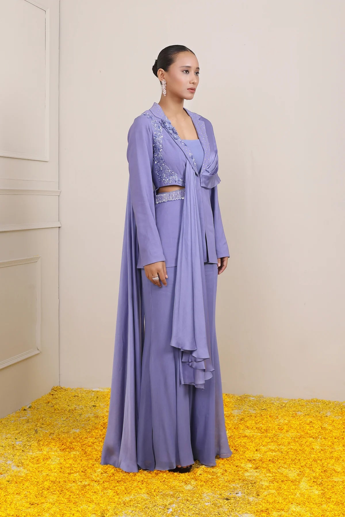 Lavender high low jacket in georgette with appliques and cutdana embroidery. It is paired with a matching inner and palazzo pants.
