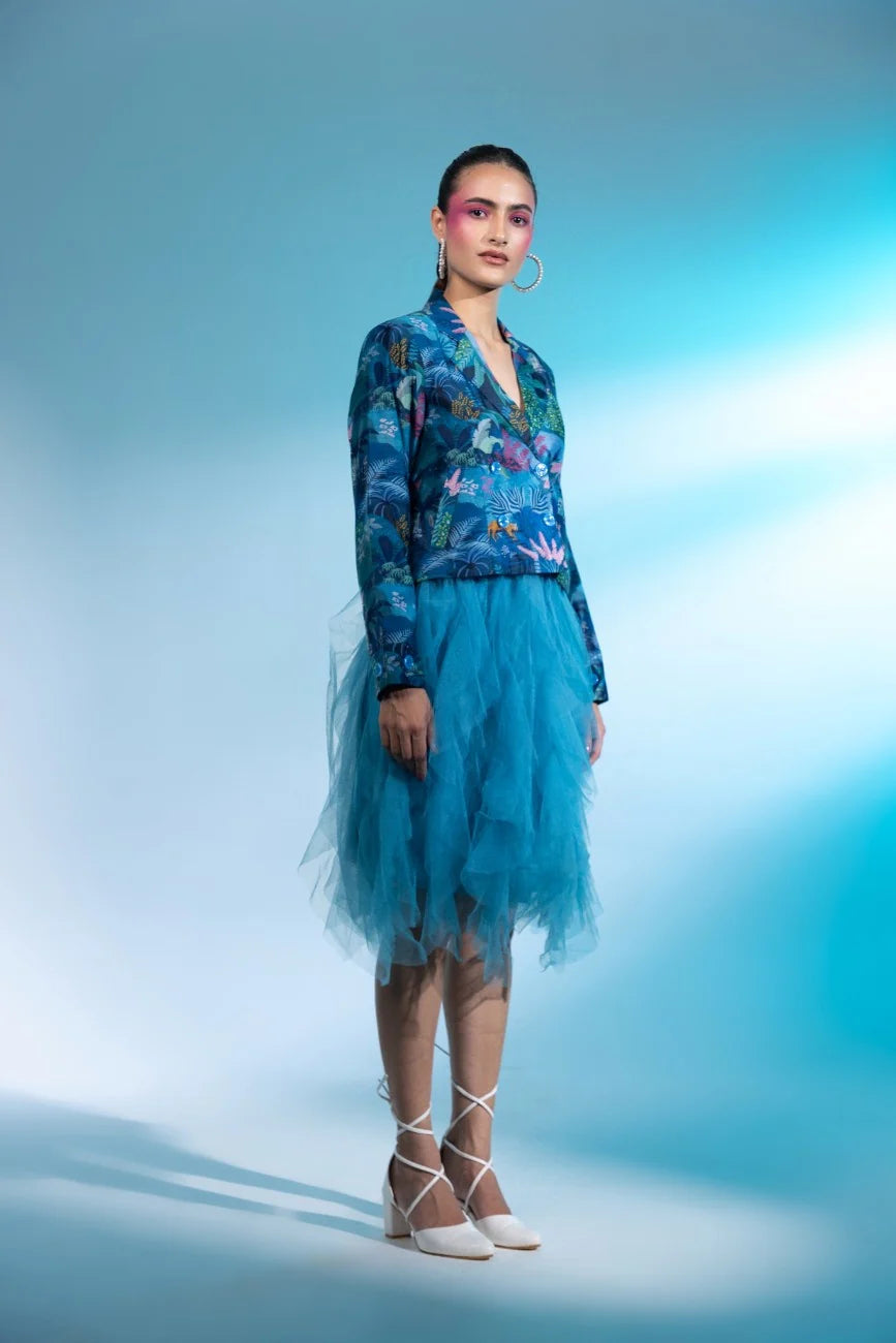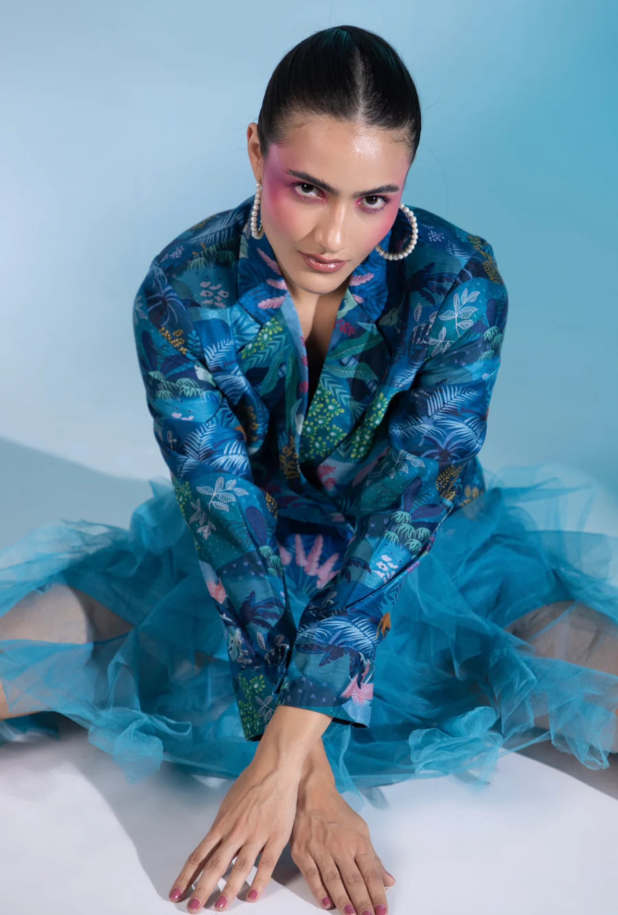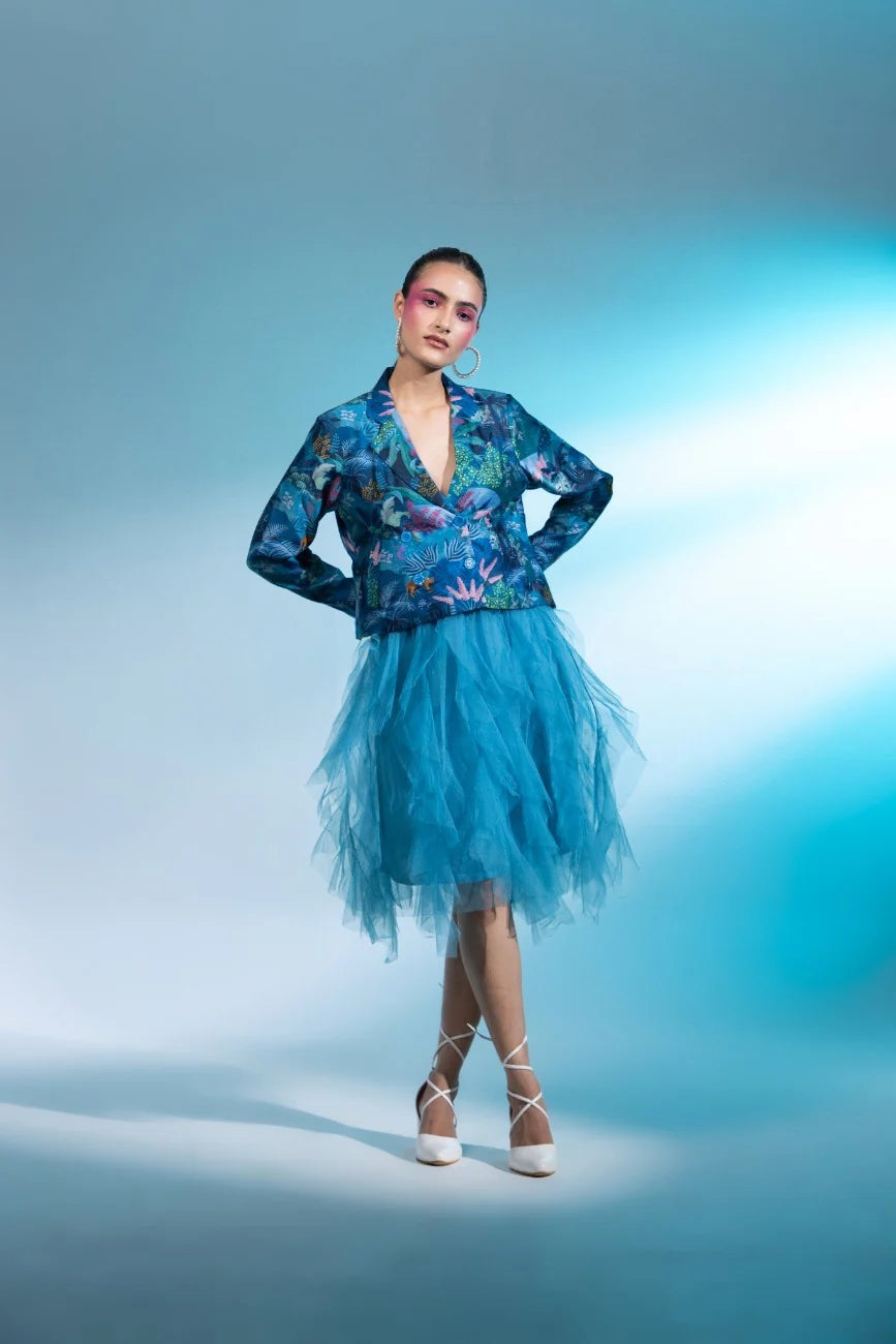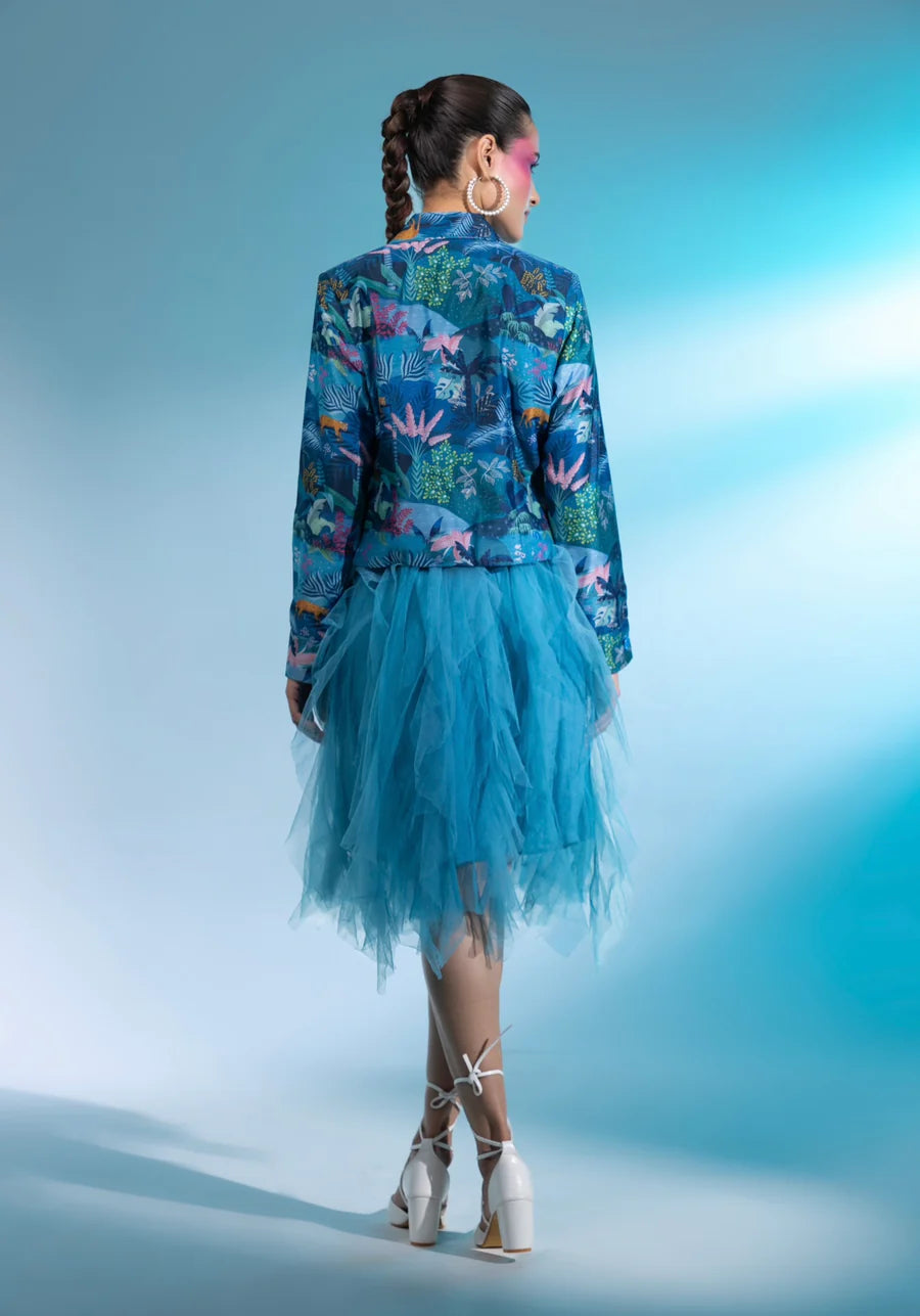 Unleash your inner fashionista with our teal blue forest print short jacket, featuring a chic lapel collar. Pair it with a delicate tulle fabric short skirt for an ensemble that blends nature-inspired elegance with modern sophistication. This stylish duo is perfect for making a bold and unforgettable statement.